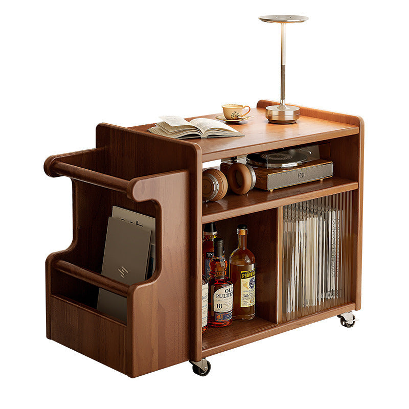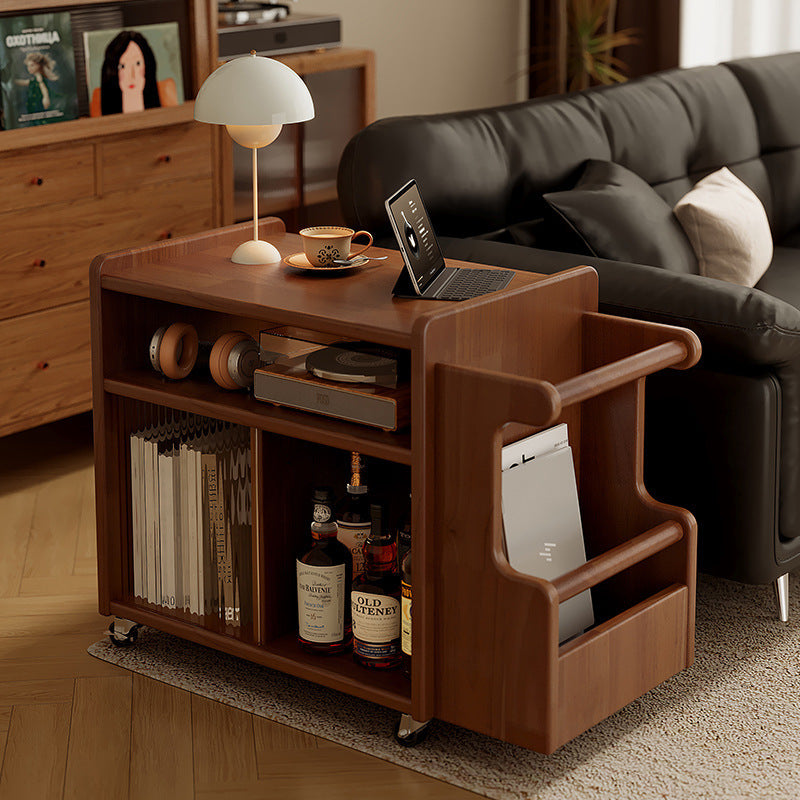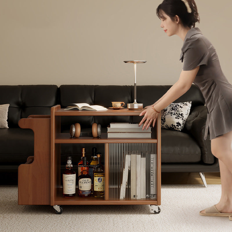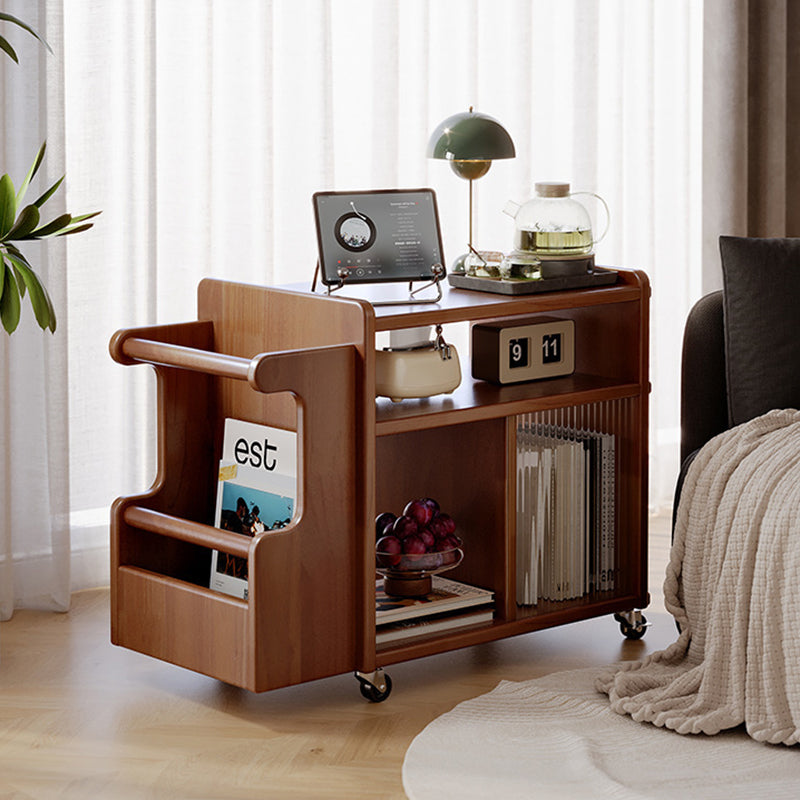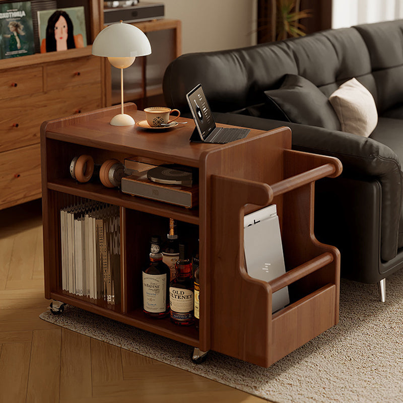 This creative contemporary side table features a solid wood frame, glass shelving, and a slim rectangular silhouette with three tiers and dual storage areas, perfect for organizing living room essentials. Available in walnut, cherry, and black finishes, it offers strong weight support and smooth 360° swivel casters for easy mobility around the room.