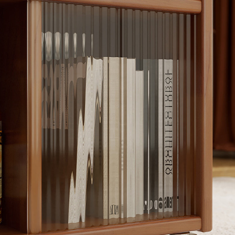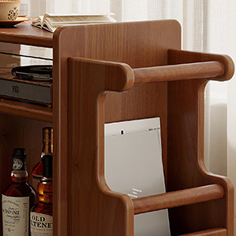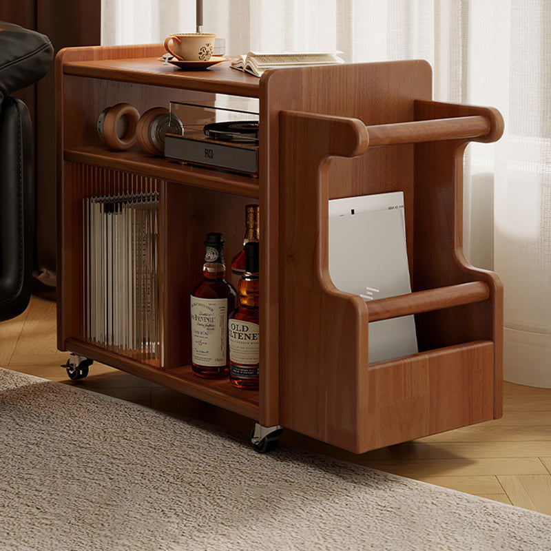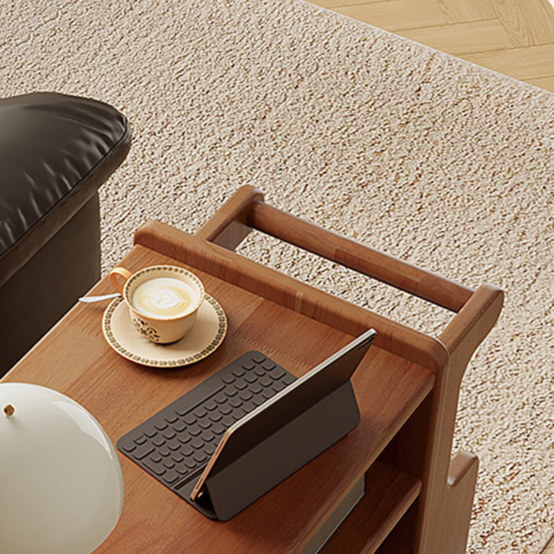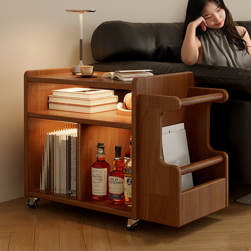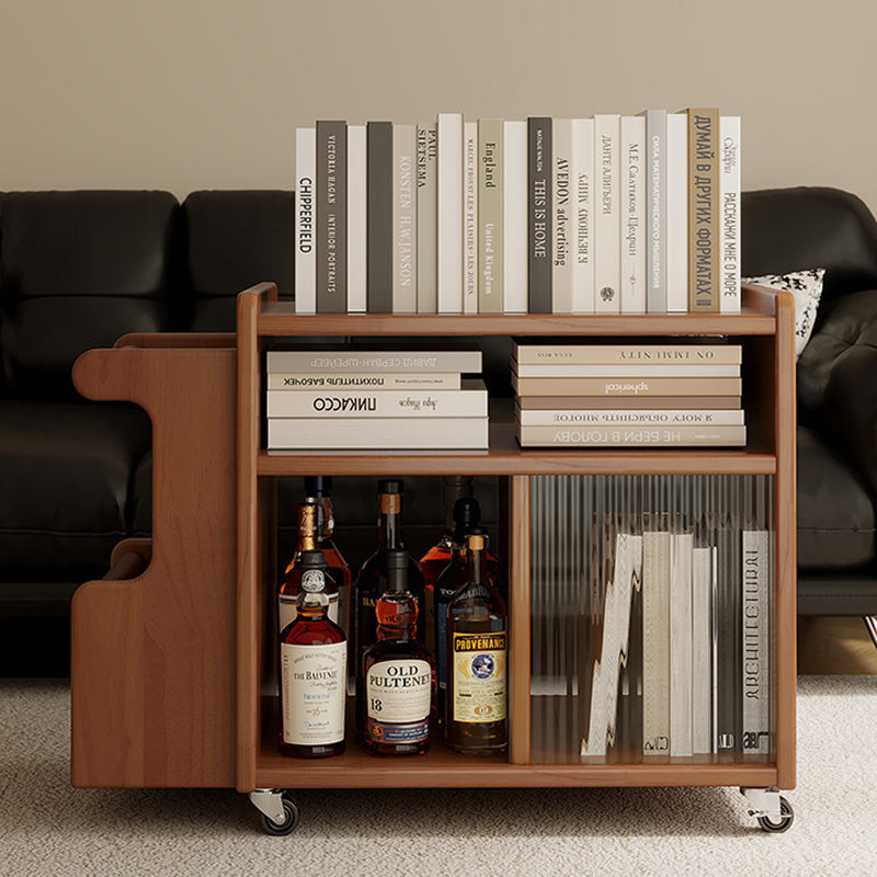 This creative contemporary side table features a solid wood frame, glass shelving, and a slim rectangular silhouette with three tiers and dual storage areas, perfect for organizing living room essentials. Available in walnut, cherry, and black finishes, it offers strong weight support and smooth 360° swivel casters for easy mobility around the room.
