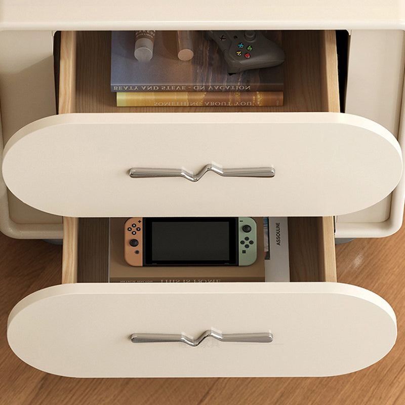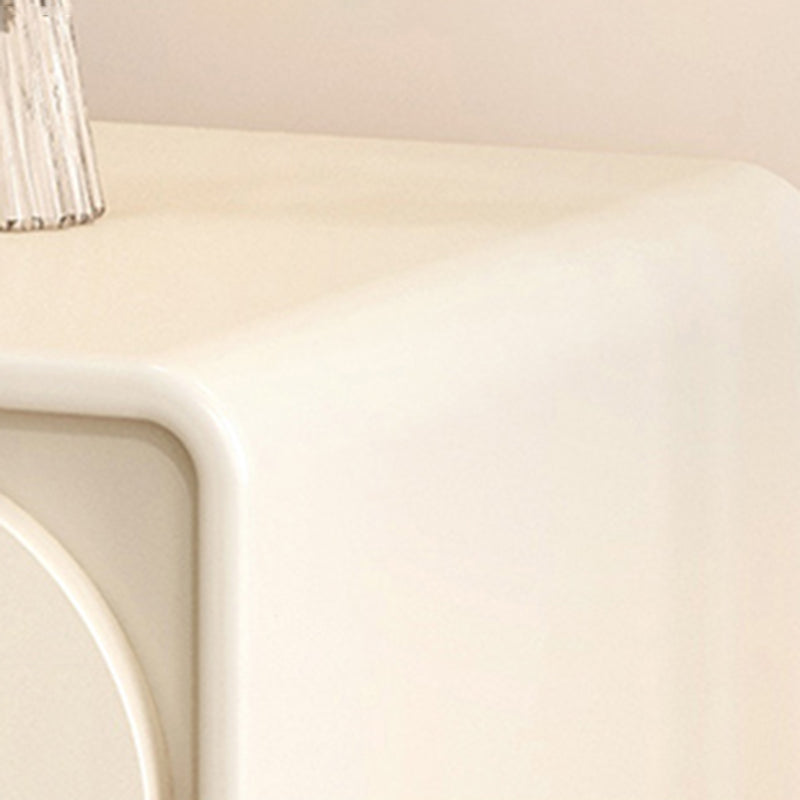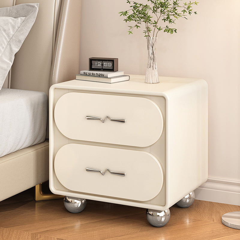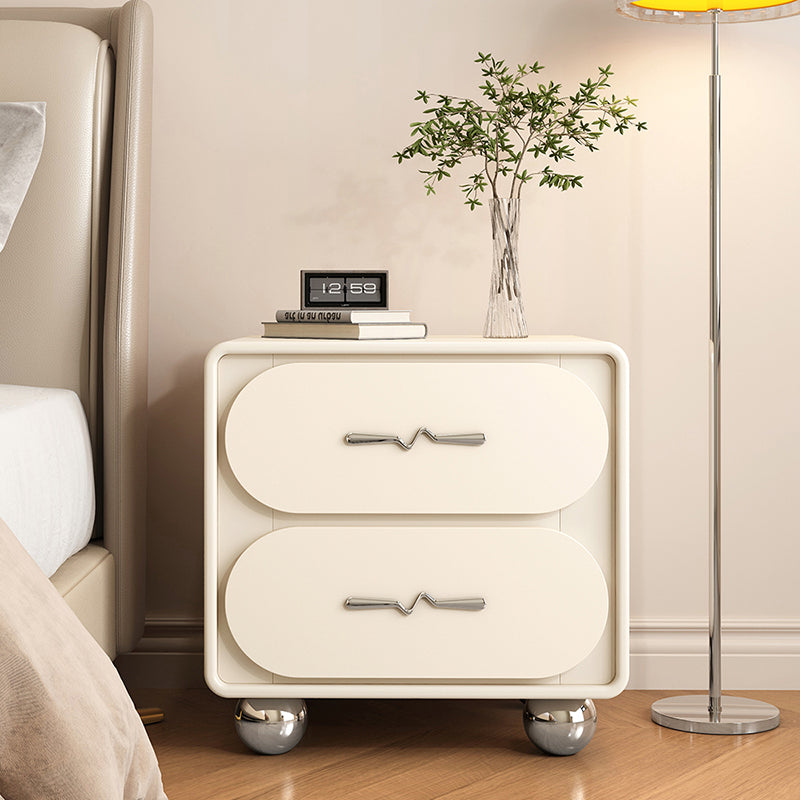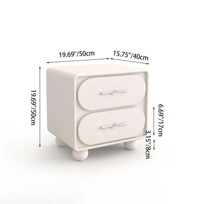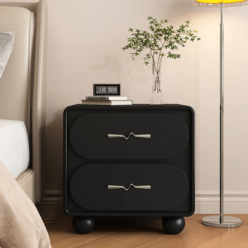 This contemporary nightstand features a solid pine wood frame, a rounded rectangular design, and two smooth drawers wrapped in cat-scratch-resistant upholstery. Available in black or white, it brings a clean, modern look with creative French-inspired detailing.