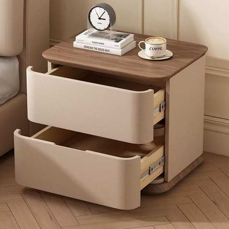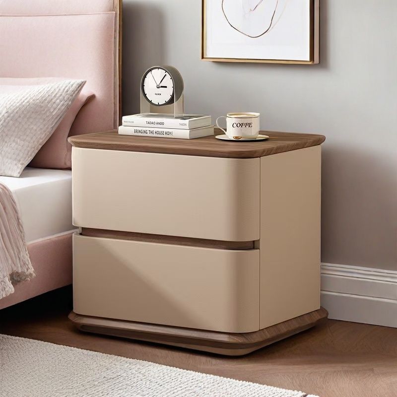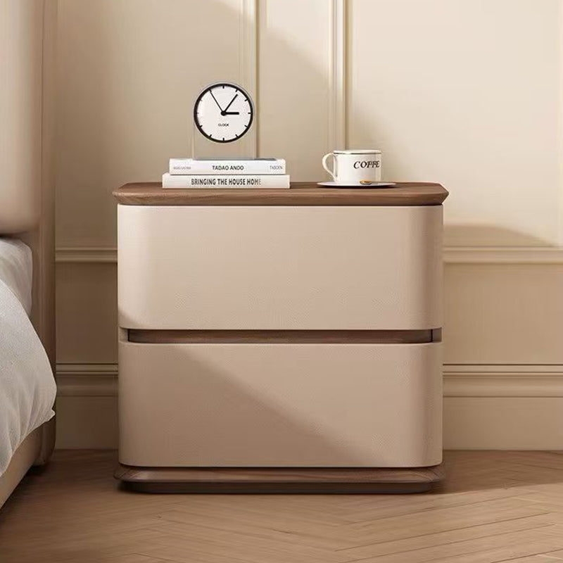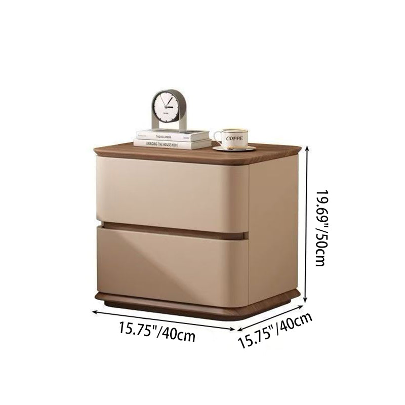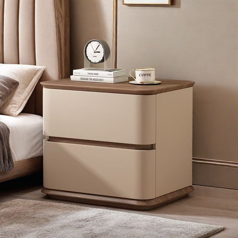 This contemporary Nordic nightstand features a sleek rectangular design with two spacious drawers, crafted from pine wood, solid wood multi-layer board, and faux leather. Available in khaki, ivory, dark gray, and black, it provides rounded corners for safety while adding a luxurious touch to your bedroom or living room.