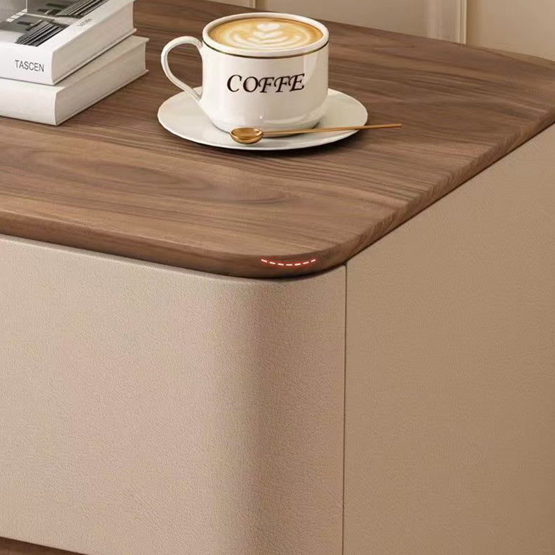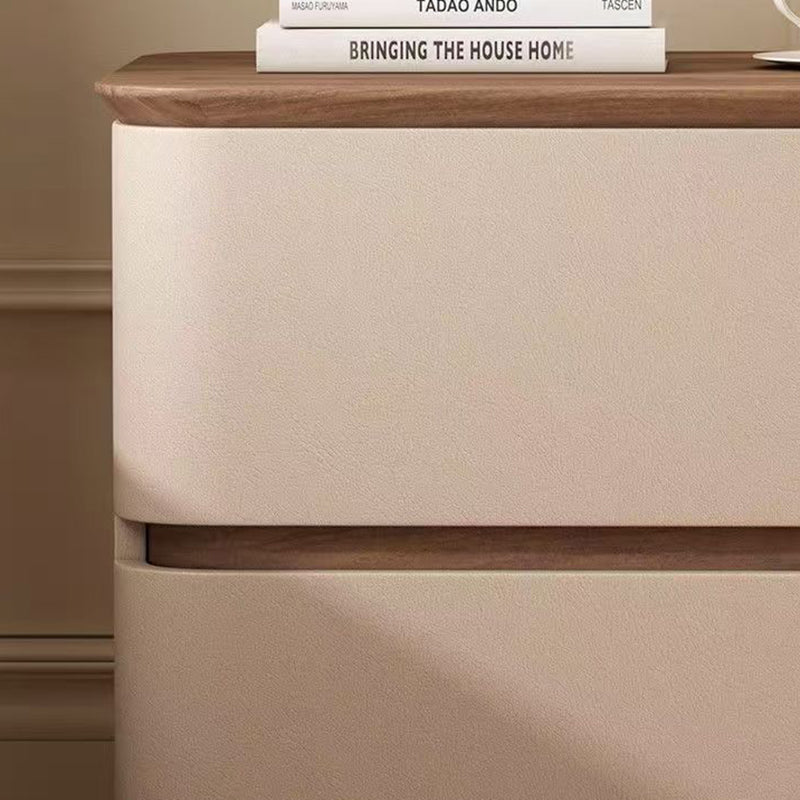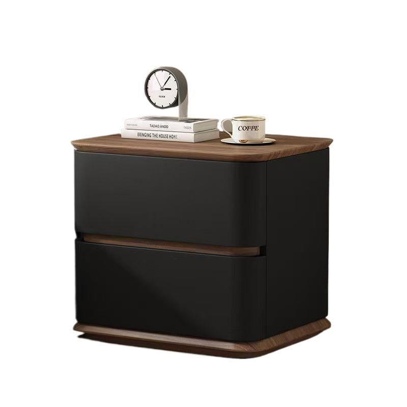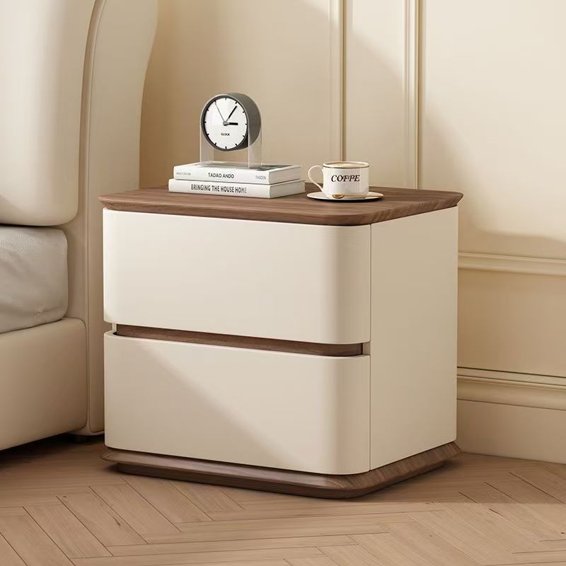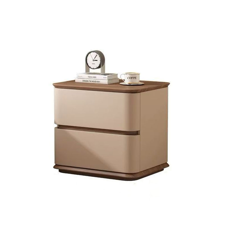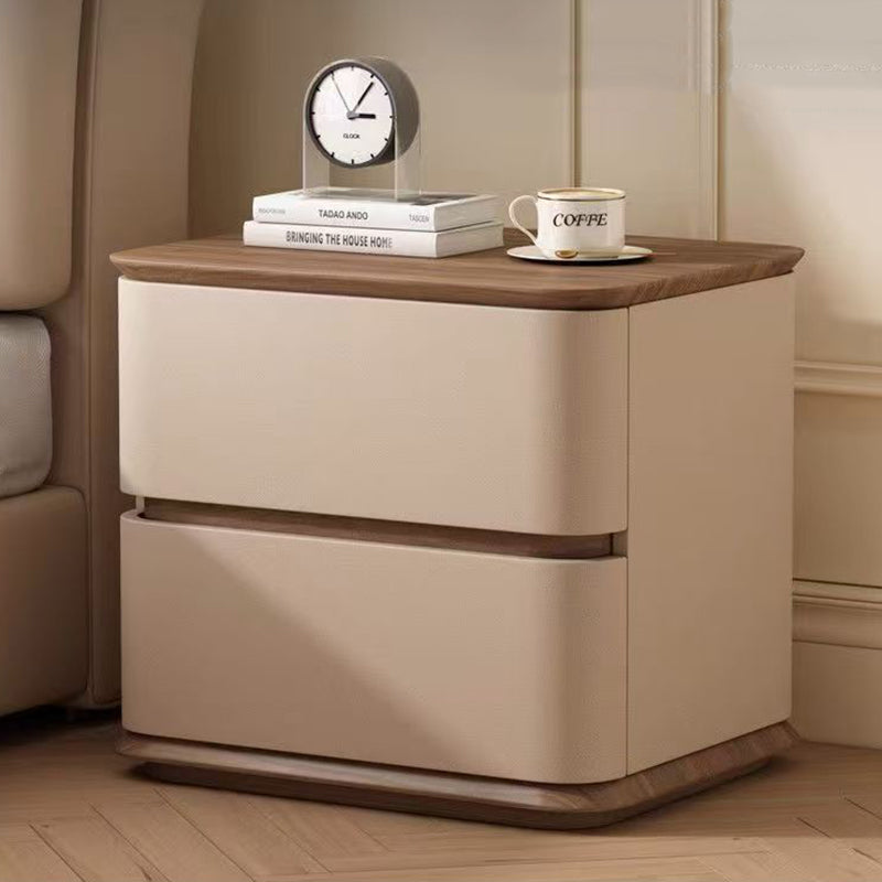 This contemporary Nordic nightstand features a sleek rectangular design with two spacious drawers, crafted from pine wood, solid wood multi-layer board, and faux leather. Available in khaki, ivory, dark gray, and black, it provides rounded corners for safety while adding a luxurious touch to your bedroom or living room.