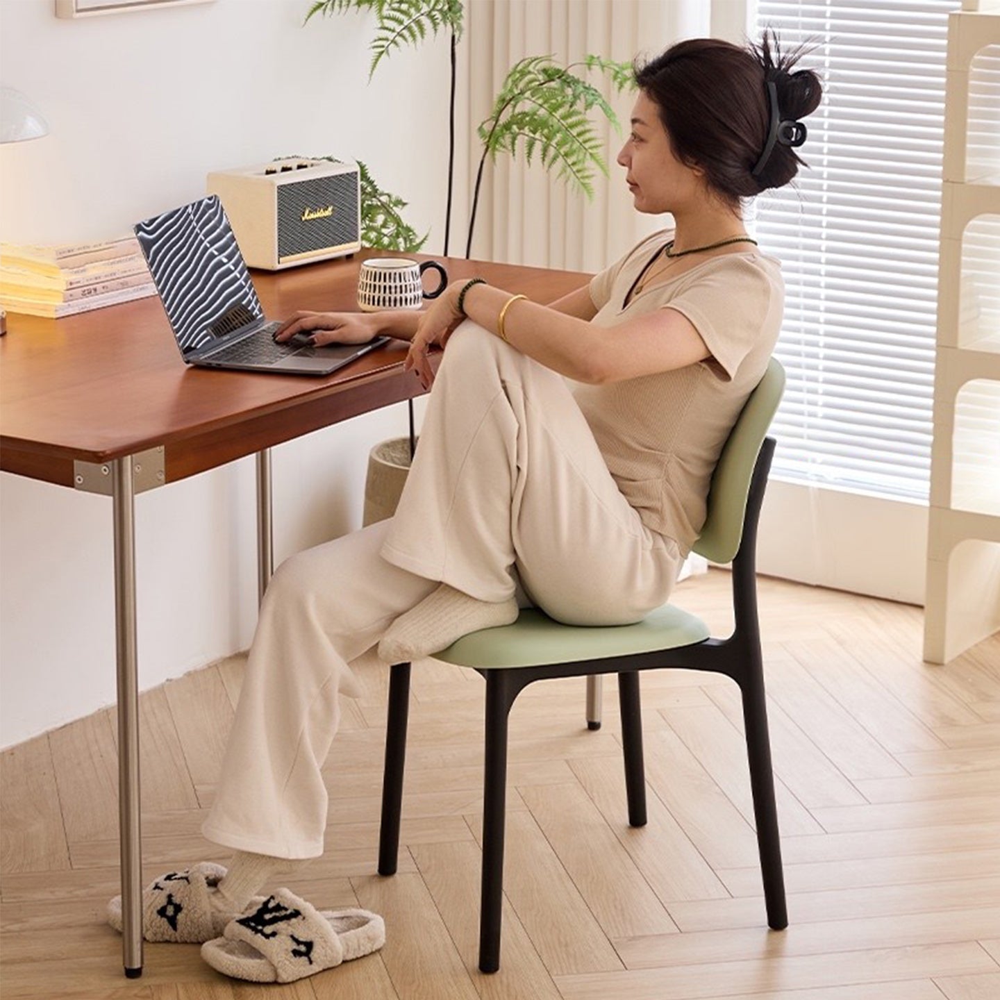 This contemporary Nordic dining chair features a smooth curved design with a supportive backrest, crafted from durable PP plastic for long-lasting strength and high load capacity. Available in white, light gray, camel, green, and pink, it's a versatile seating solution for modern living rooms and dining spaces, ideal for small homes and everyday use.