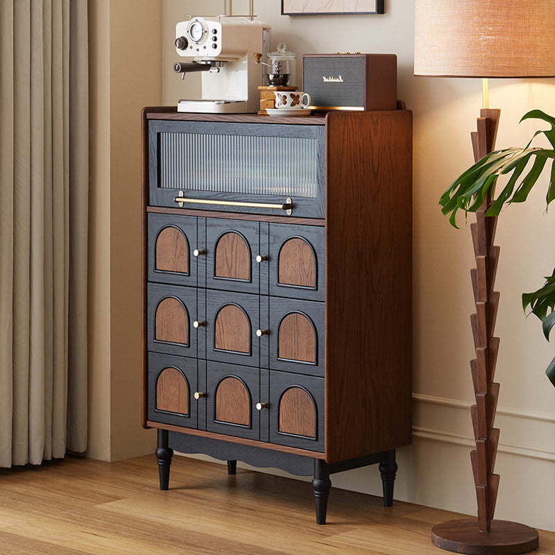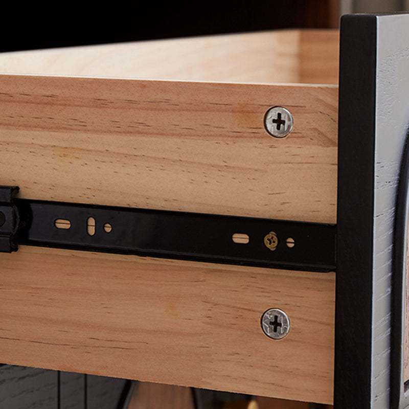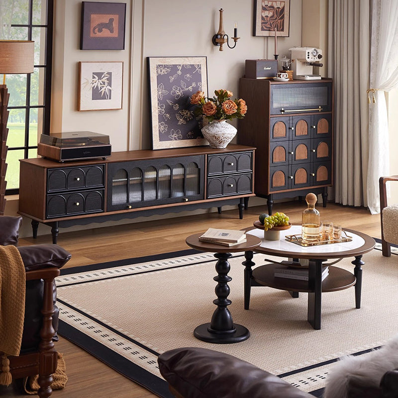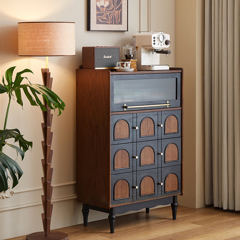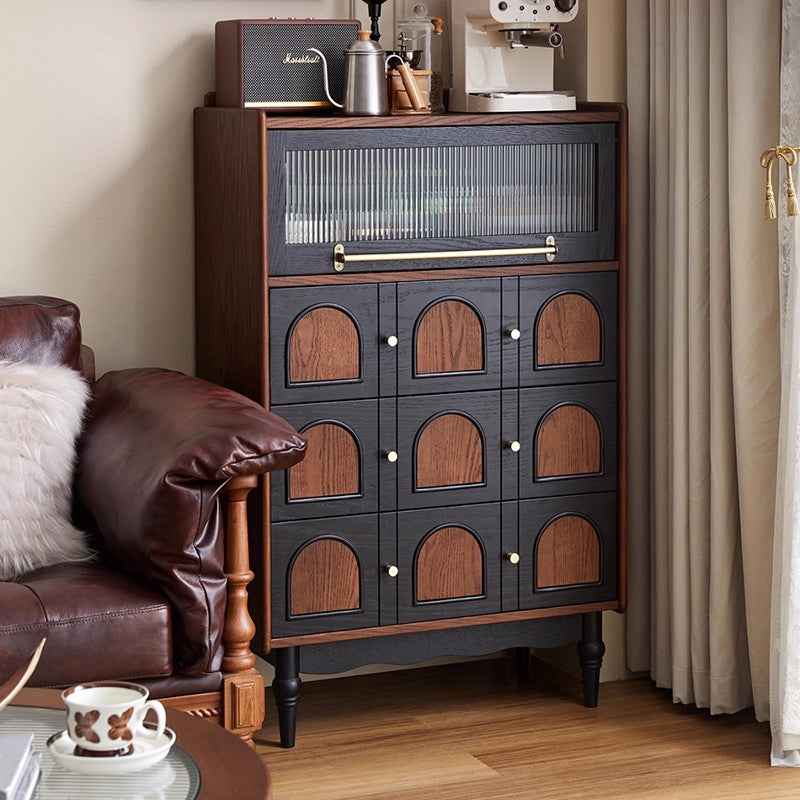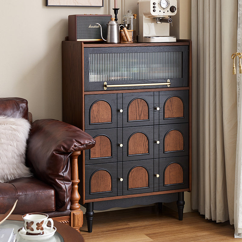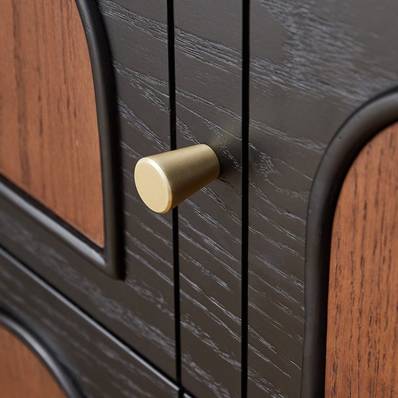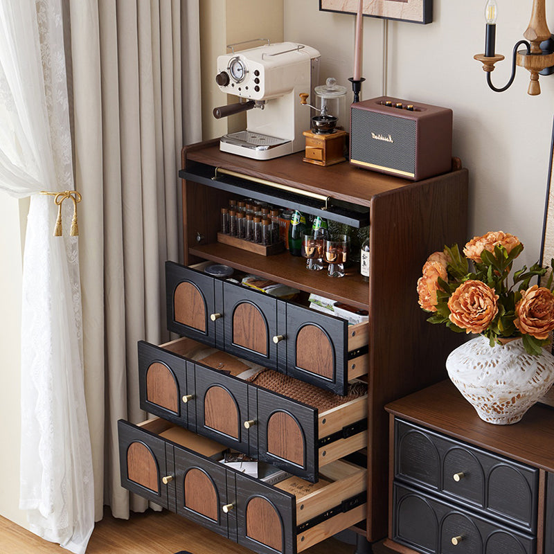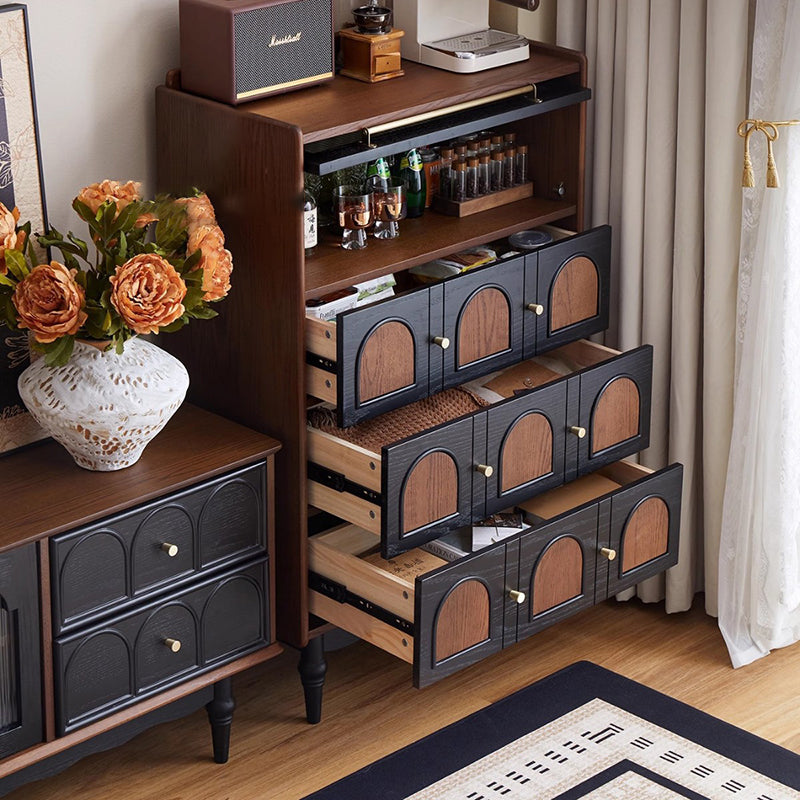 This contemporary vintage storage cabinet features a solid rubberwood frame with engineered wood panels for long-lasting durability. Designed with three drawers and one enclosed cabinet, and finished in black & walnut, it offers stylish and practical storage for living rooms or bedrooms while fitting neatly against the wall.