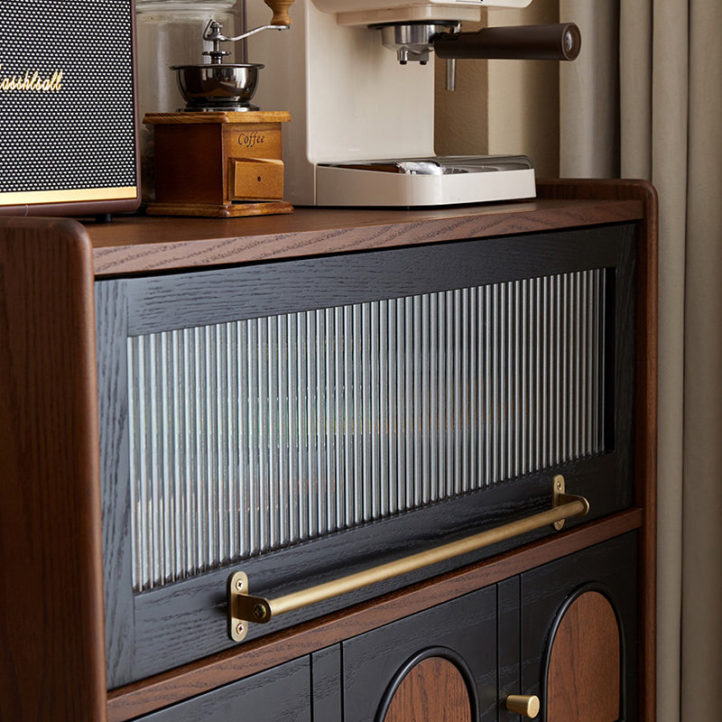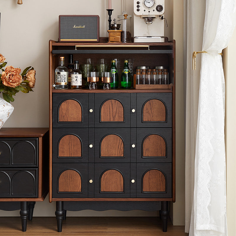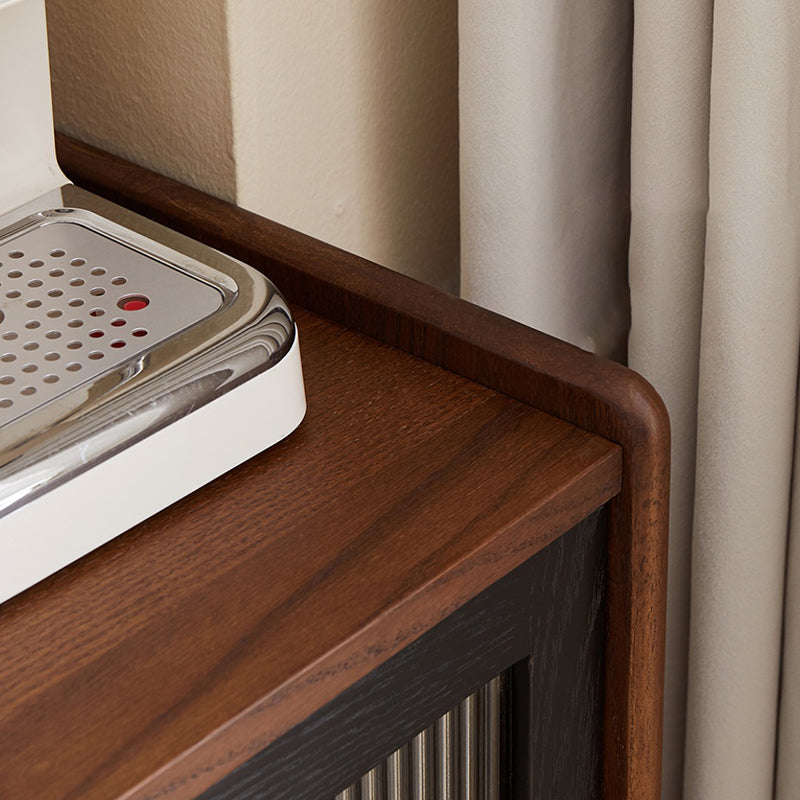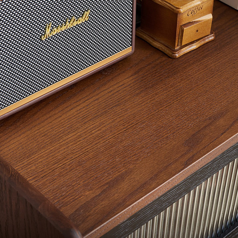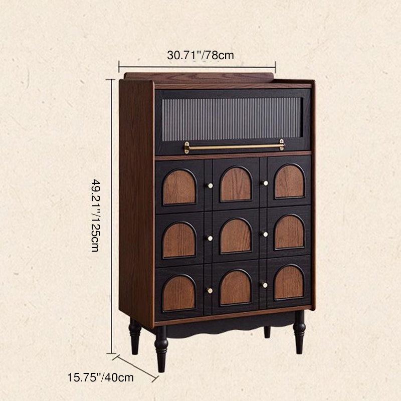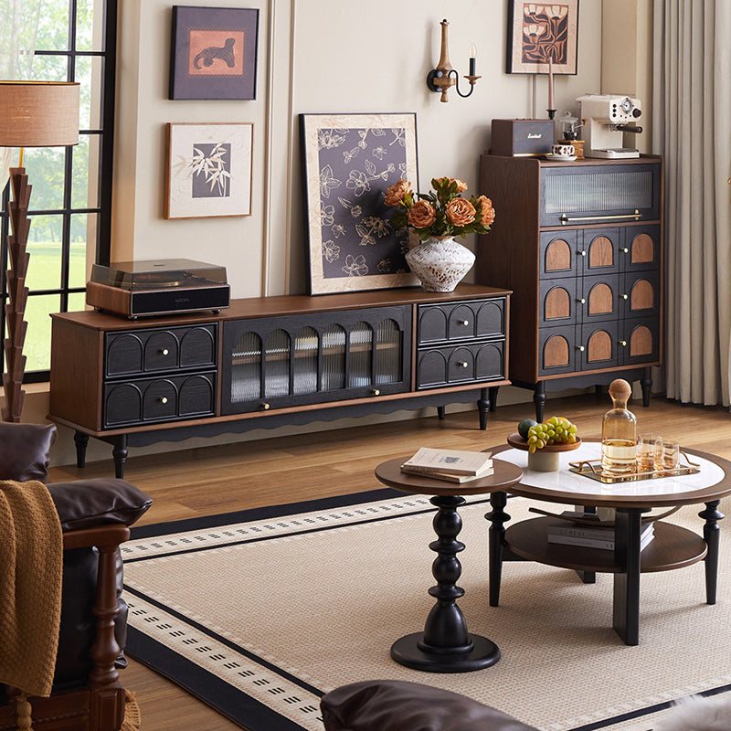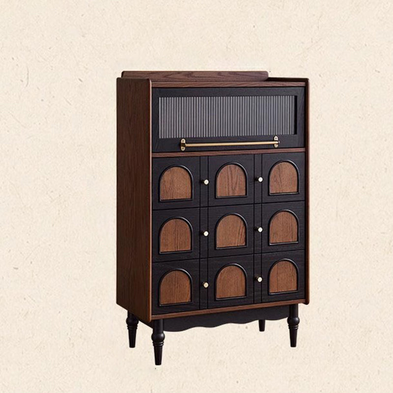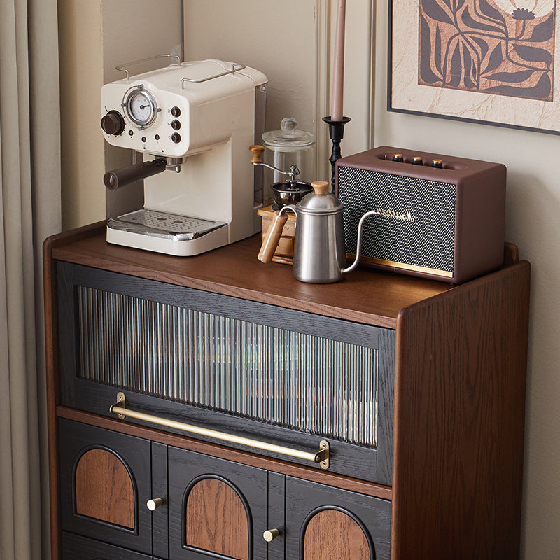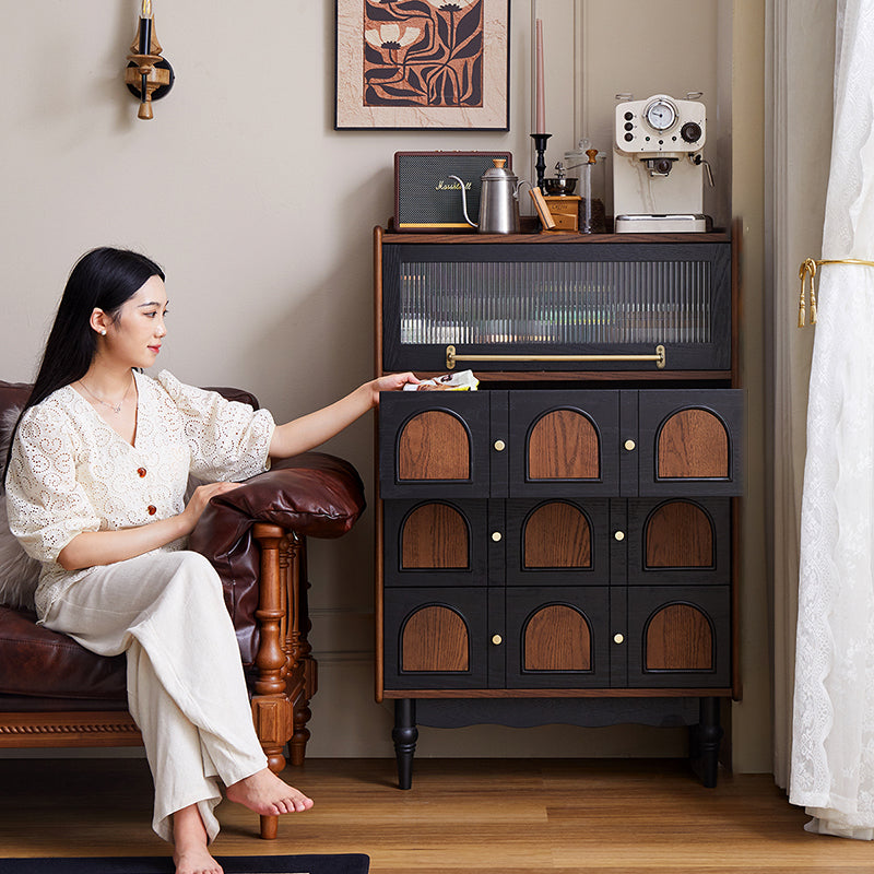 This contemporary vintage storage cabinet features a solid rubberwood frame with engineered wood panels for long-lasting durability. Designed with three drawers and one enclosed cabinet, and finished in black & walnut, it offers stylish and practical storage for living rooms or bedrooms while fitting neatly against the wall.