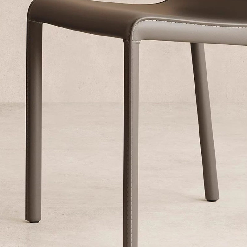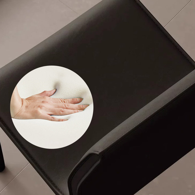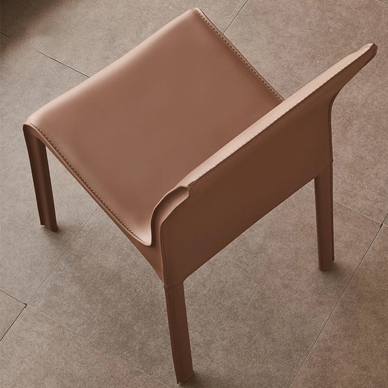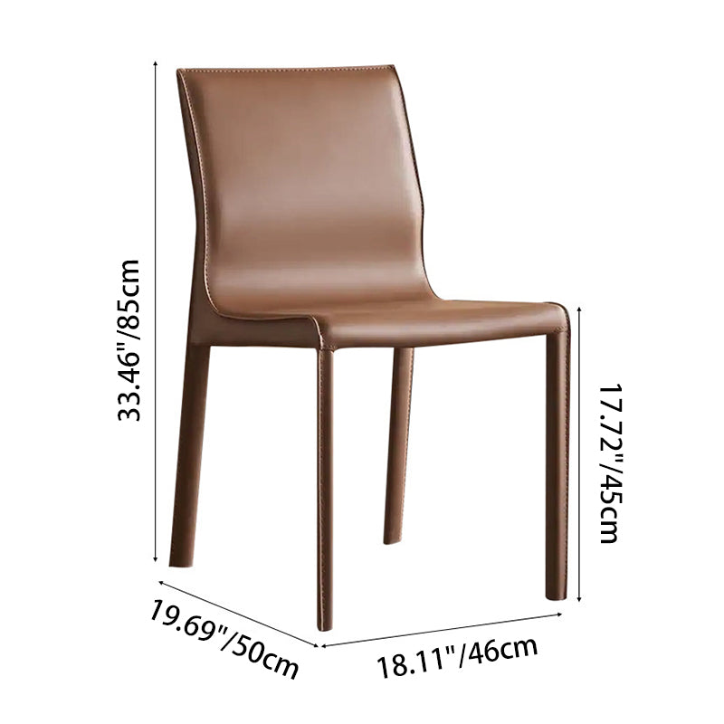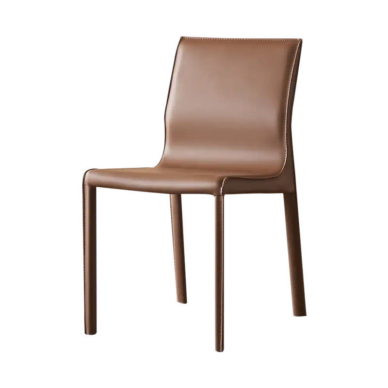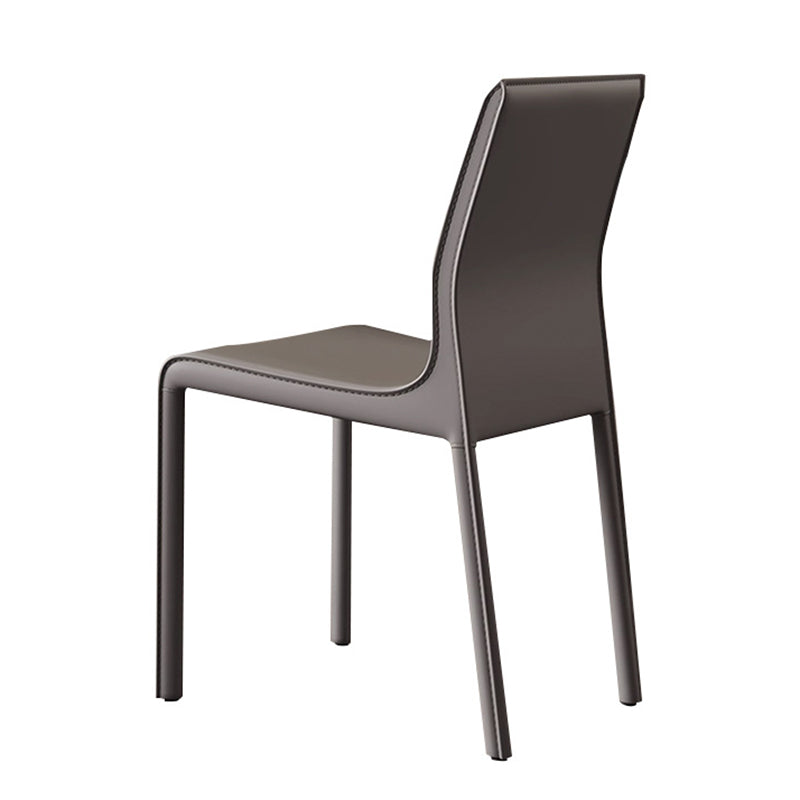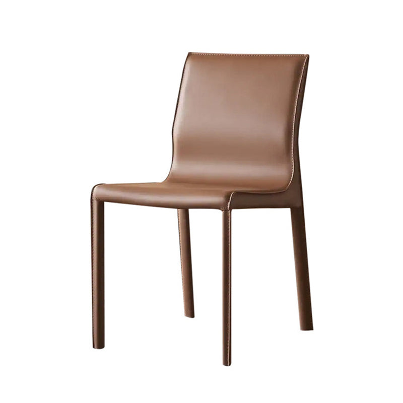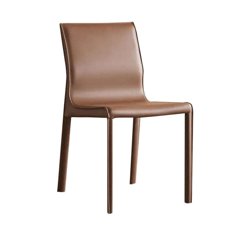 This contemporary Scandinavian dining chair features a carbon-steel support frame, saddle-leather upholstery, and a high-resilience foam seat cushion for enhanced comfort. Available in deep coffee, light khaki, gray, and black, the backrest design provides ergonomic support, making it a stylish and durable addition to any dining room. Perfect for modern dining spaces seeking a premium saddle-leather dining chair with long-lasting structure and elevated aesthetics.