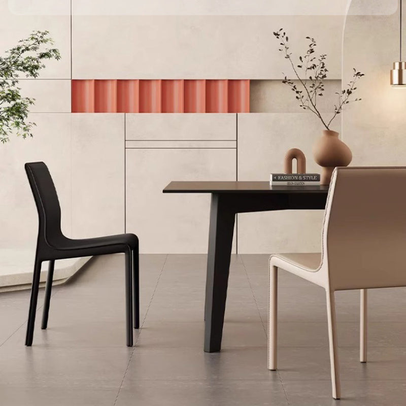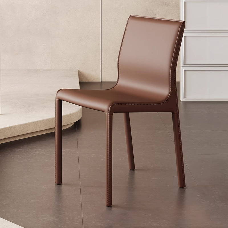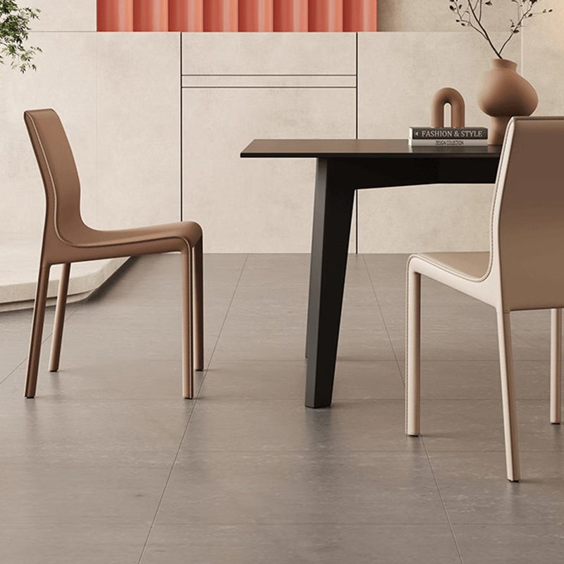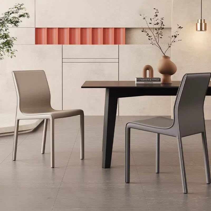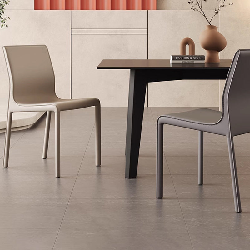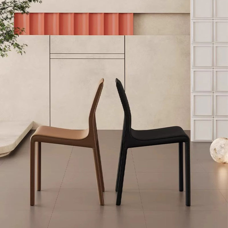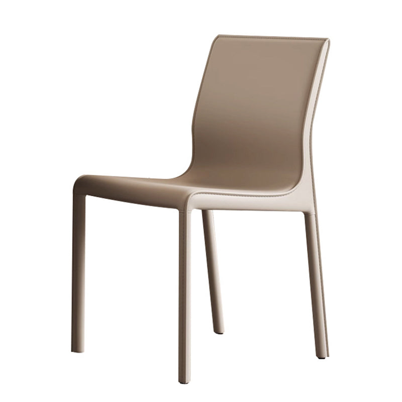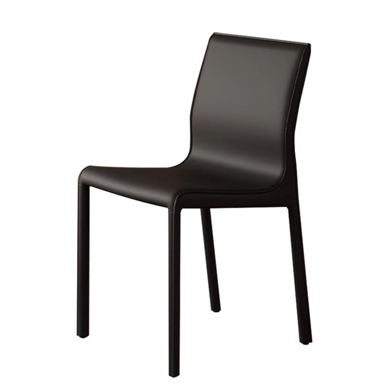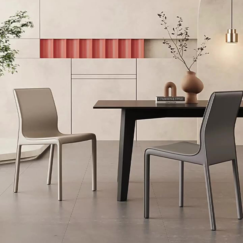 This contemporary Scandinavian dining chair features a carbon-steel support frame, saddle-leather upholstery, and a high-resilience foam seat cushion for enhanced comfort. Available in deep coffee, light khaki, gray, and black, the backrest design provides ergonomic support, making it a stylish and durable addition to any dining room. Perfect for modern dining spaces seeking a premium saddle-leather dining chair with long-lasting structure and elevated aesthetics.