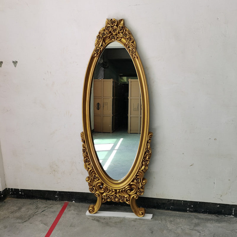 Safety meets elegance with the high-definition, explosion-proof float glass surface, guaranteeing a clear, undistorted reflection with an added layer of modern security. Available in two majestic finishes—classic elegant gold and rich silver—this mirror is perfectly sized for bedrooms, entryways, and living rooms, seamlessly adding a refined vintage charm to your décor. Optimized for North American consumers searching for European ornate full-length mirrors, vintage oval floor mirrors, PU faux-wood carved frames, and explosion-proof decorative mirrors in gold and silver.