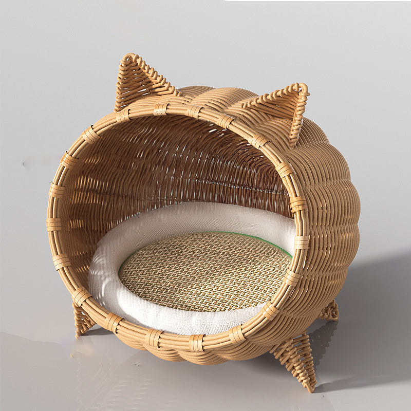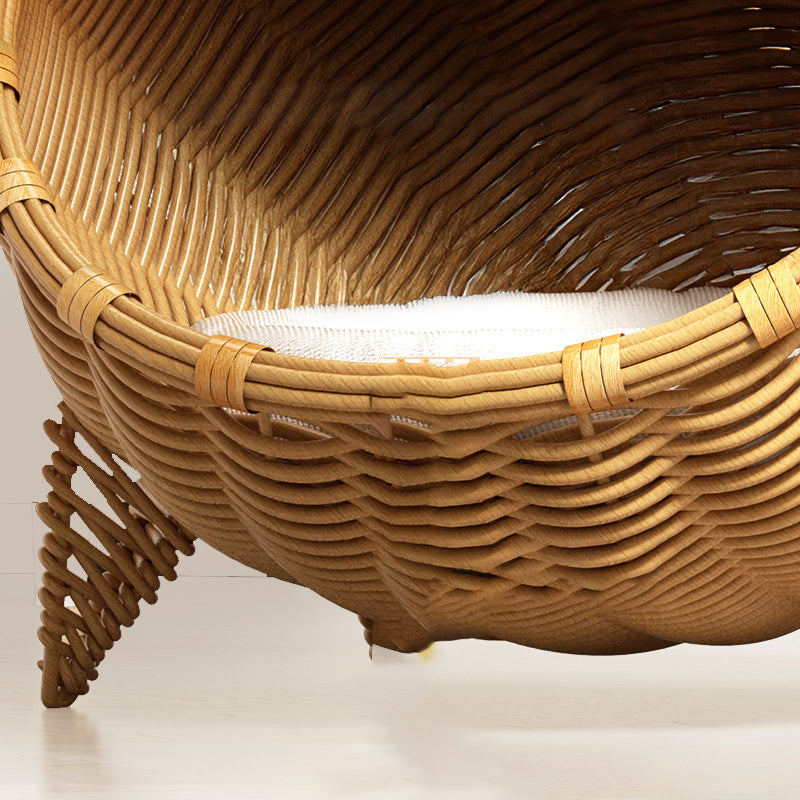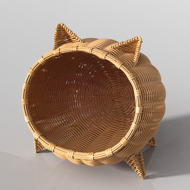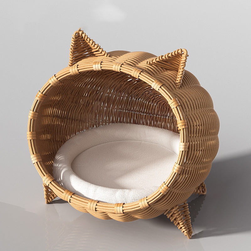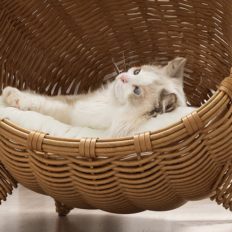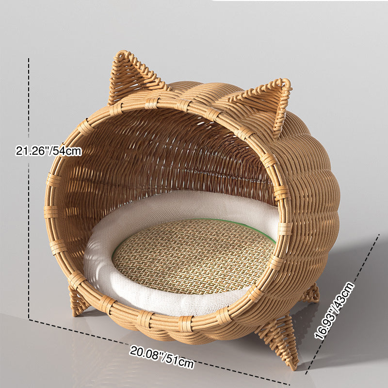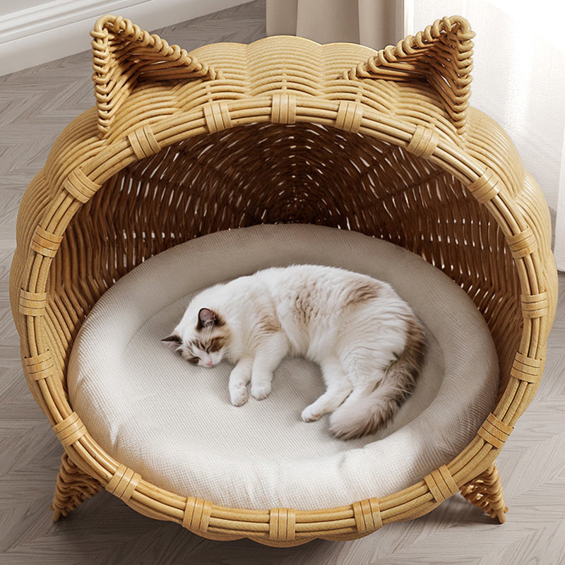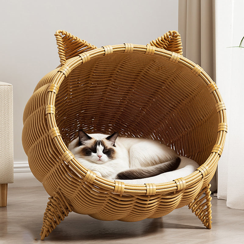 Treat your furry friend to this portable Contemporary Bohemian cat bed, boasting an adorable cat head shape and crafted from PE rattan, iron frame, and sturdy fabrics in natural rattan color. The 1-tier semi-enclosed cradle stands on 4 legs for elevated moisture protection, perfect for cats and dogs to snooze in the living room or bedroom year-round with easy portability.