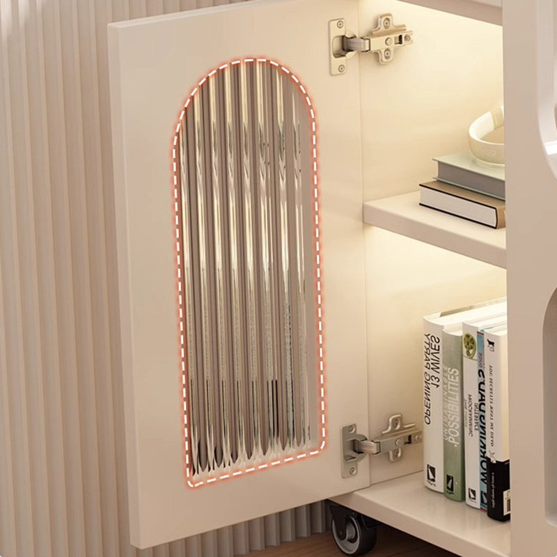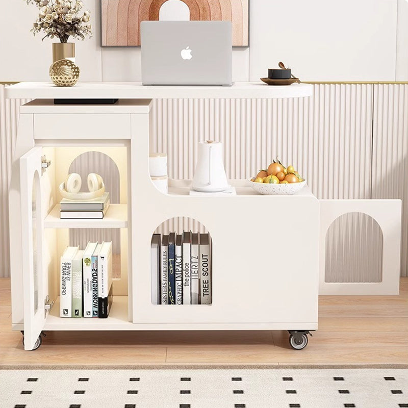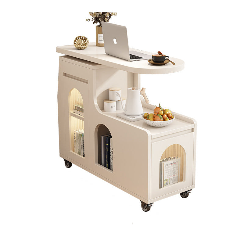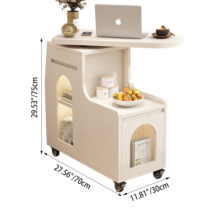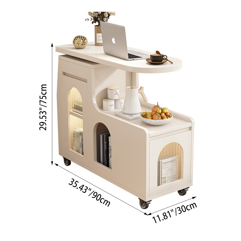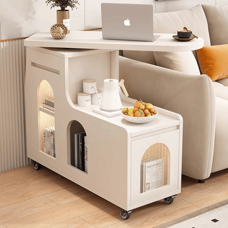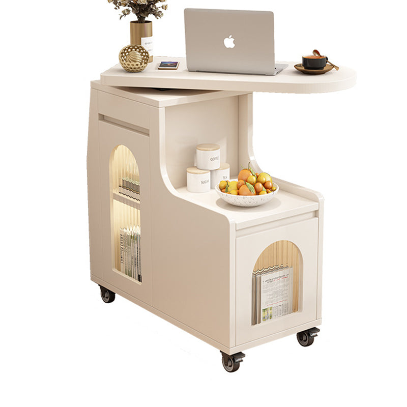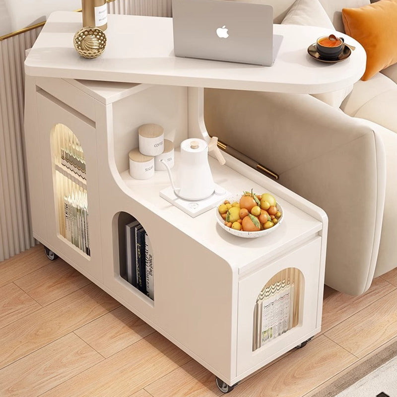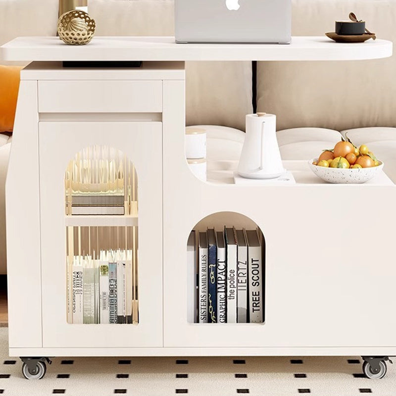 This contemporary creative coffee table features particle board and glass construction with an arched rectangular design and 2-tier storage for flexible organization. Finished in cream white, it includes a rotating tabletop and lockable swivel casters, offering smooth mobility and versatile storage for modern living rooms, sofa-side use, or bedside placement.