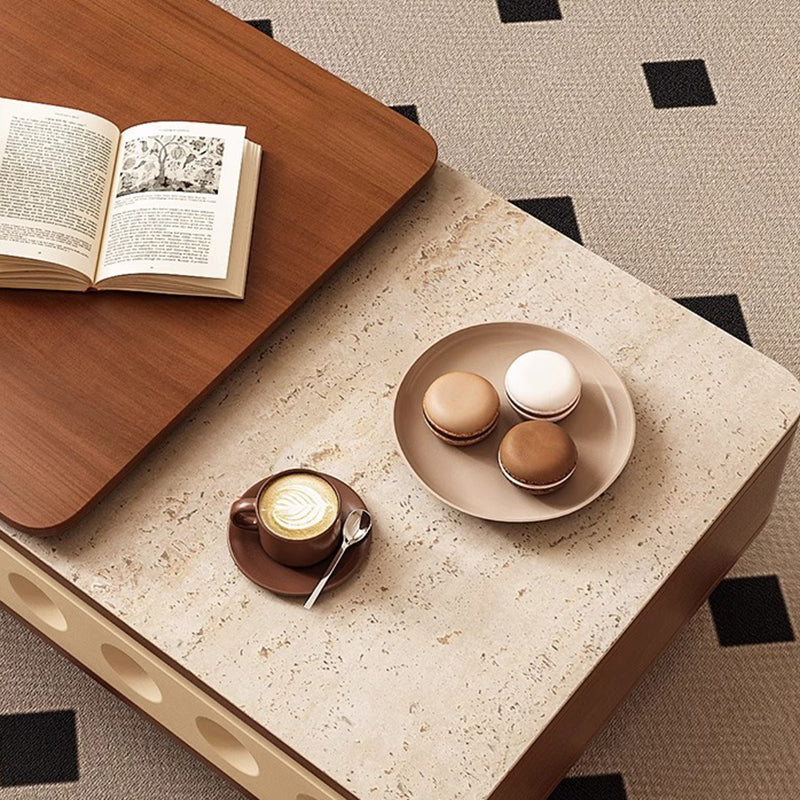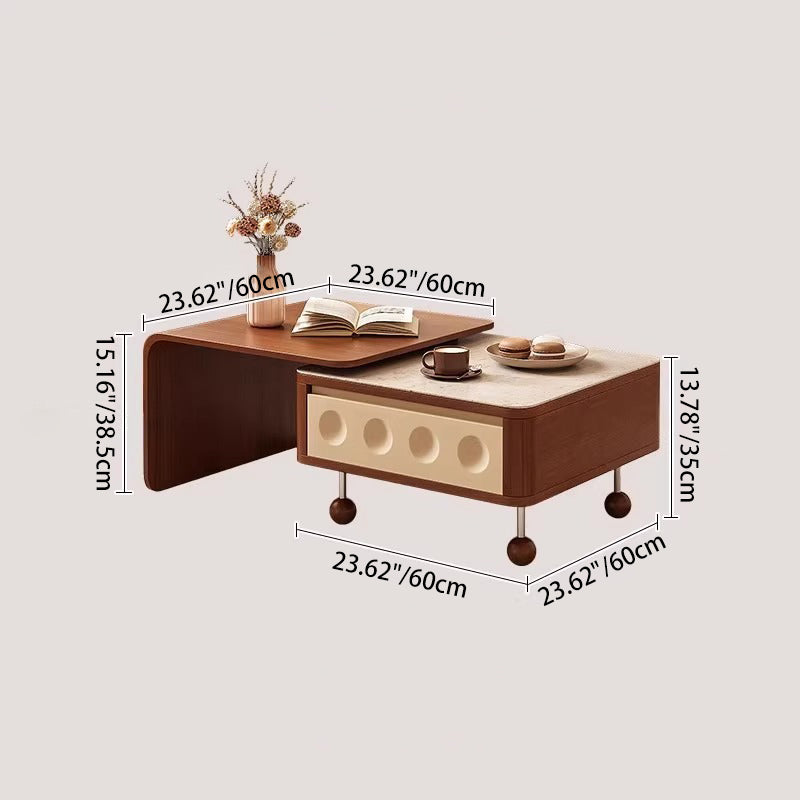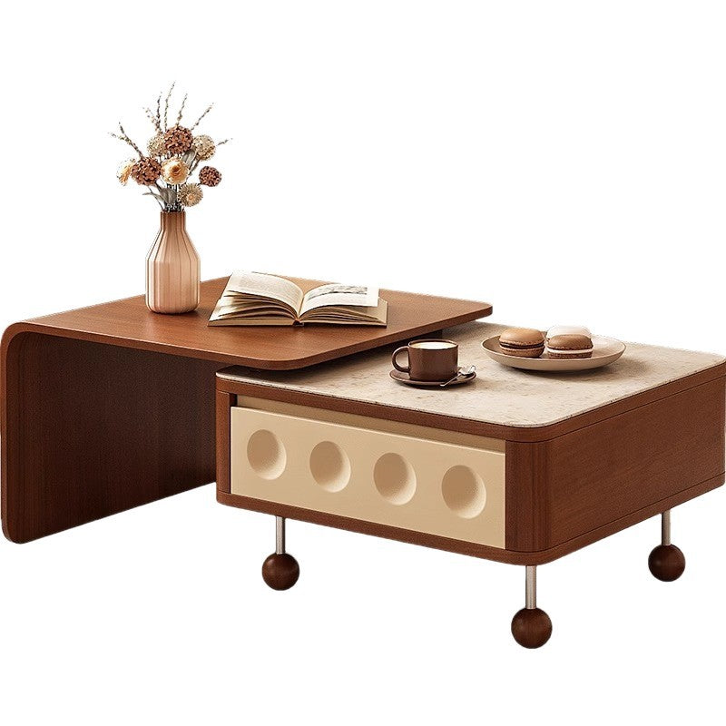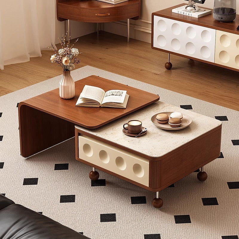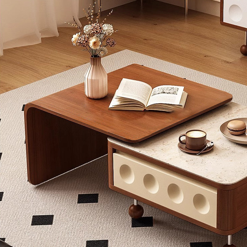 Elevate your living room with this highly functional and contemporary creative coffee table. Featuring a rich walnut-tone finish and a sleek rectangular form, this piece is crafted from a durable combination of multi-layer solid wood, sintered stone, and steel.