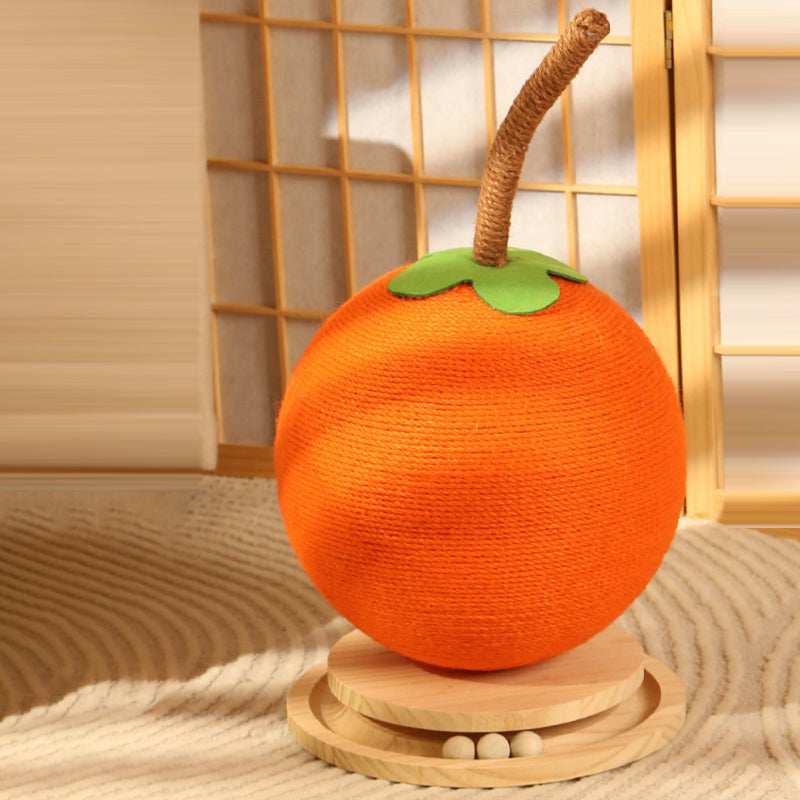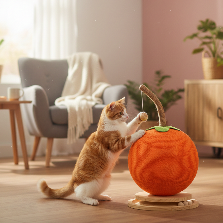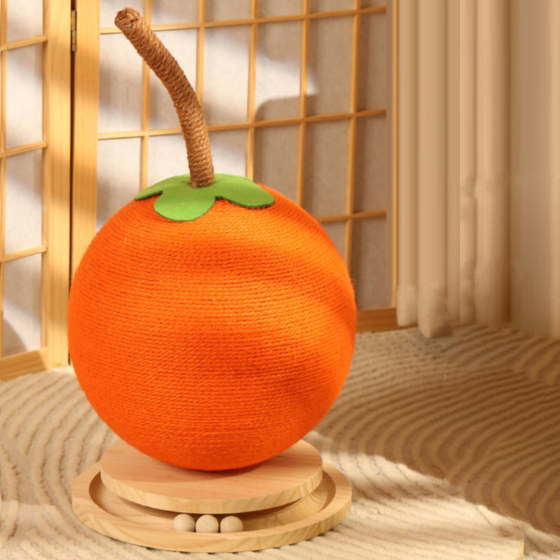 Functionality is key: the sphere sits atop a rotating base, and features an interactive teaser ball suspended within, offering endless, self-directed play possibilities. This unique design cleverly combines scratching utility and continuous entertainment in a single, stylish piece. Perfect for adding a pop of color and engagement to your living room or bedroom, this toy is optimized for North American consumers searching for sisal ball scratchers, rotating cat toys, fun orange pet accessories, and unique interactive cat scratch posts.