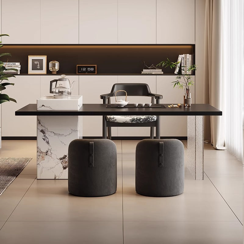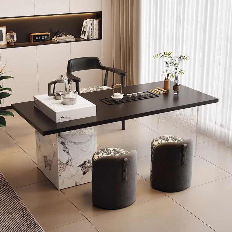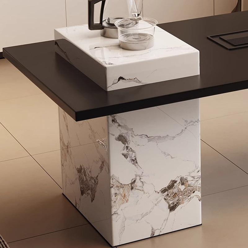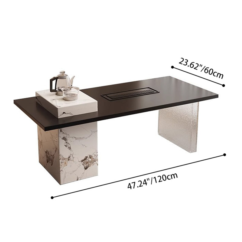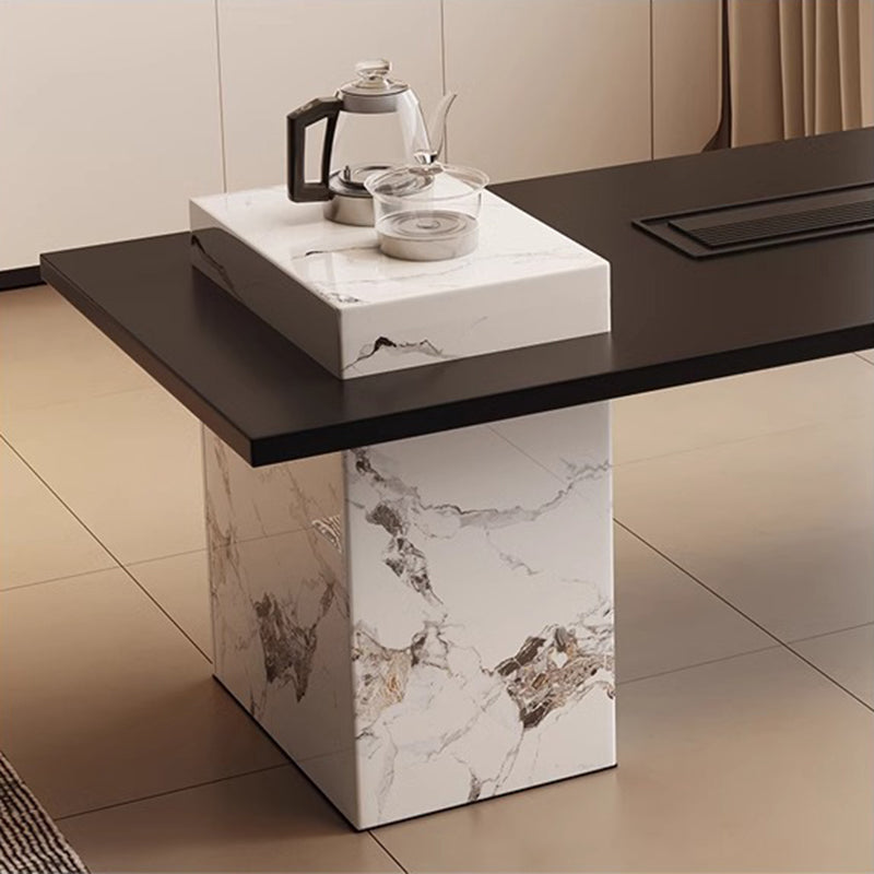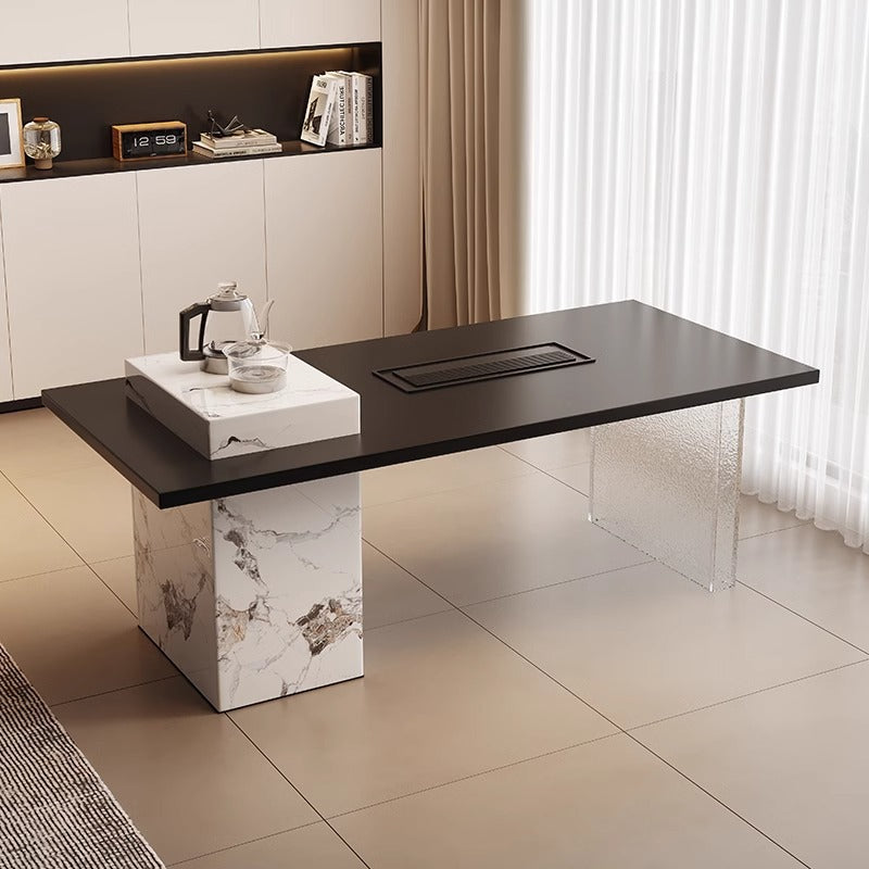 This Contemporary Scandinavian coffee table combines Solid Wood Multi-Layer Board, stone slab, and acrylic accents, featuring a rectangular and square silhouette with a 1-tier design. Designed with large-capacity hidden storage and a built-in concealed water bucket compartment, it comes in black or white finishes, making it a refined modern tea table for living rooms, balconies, and reception spaces.