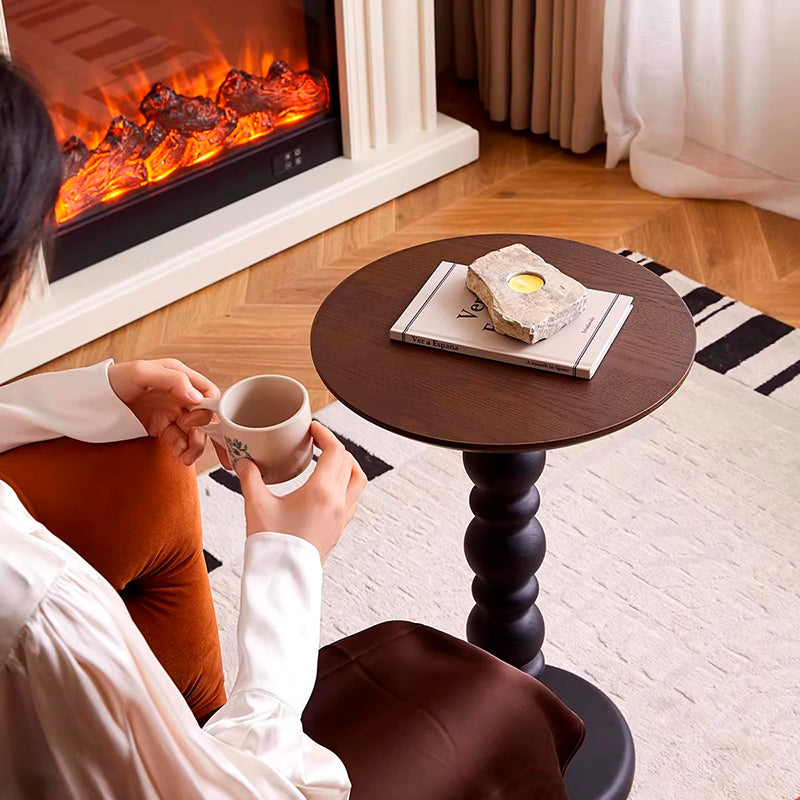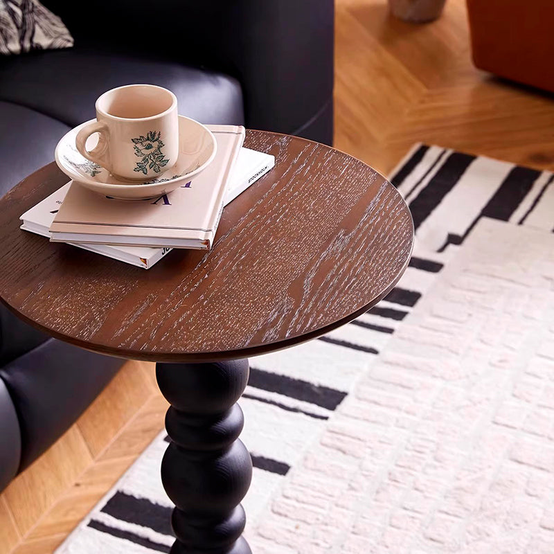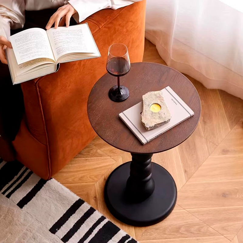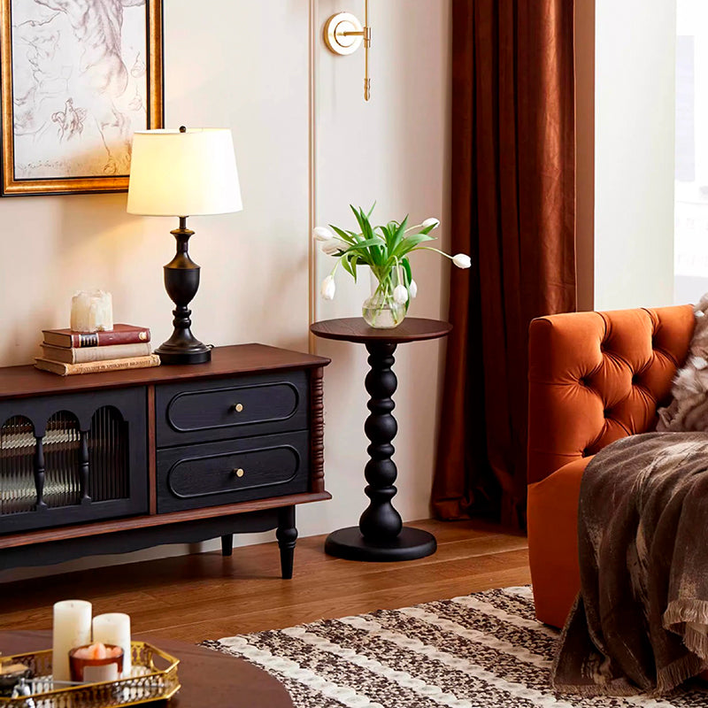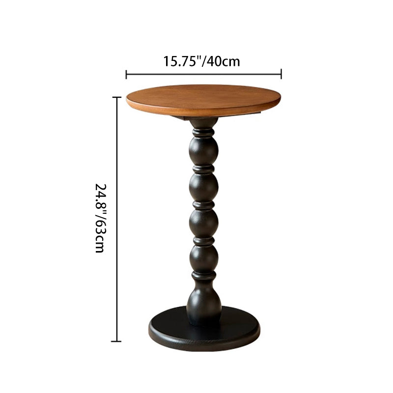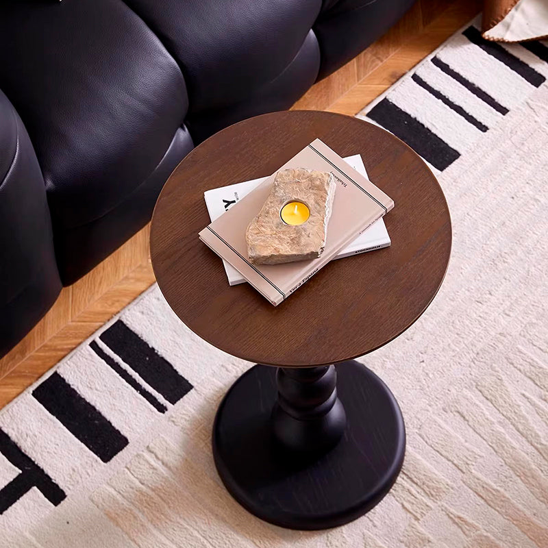 This Traditional French–style side table is crafted from solid red oak, featuring a round tabletop with an elegant Roman column base for a refined vintage look. Designed as a 1-tier accent table, it showcases wide-plank joinery craftsmanship and smoothly rounded edges, finished in brown or black, making it a perfect sofa side table or small living room accent piece for classic and luxury interiors.