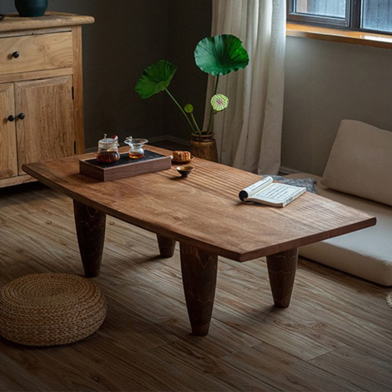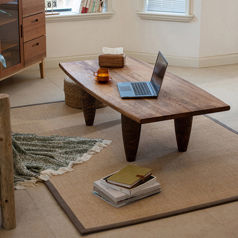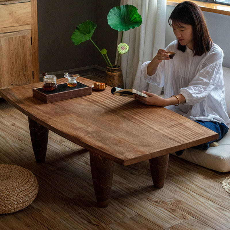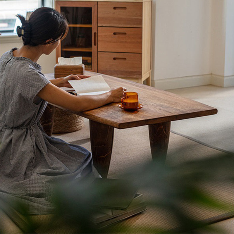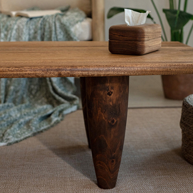 This Traditional Japanese solid wood coffee table features a boat-shaped top and hammer-form legs, finished in a deep walnut tone that highlights the natural wood grain. Designed as a low-profile, single-tier table, it offers a sturdy, grounded presence with smooth lines, making it ideal for Japanese-style living rooms, wabi-sabi interiors, or floor seating spaces.