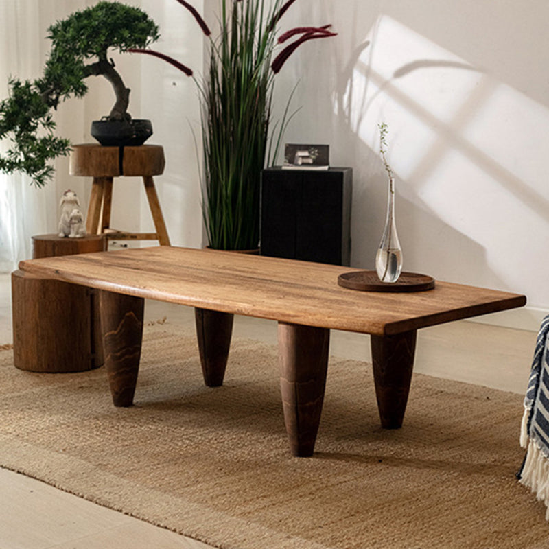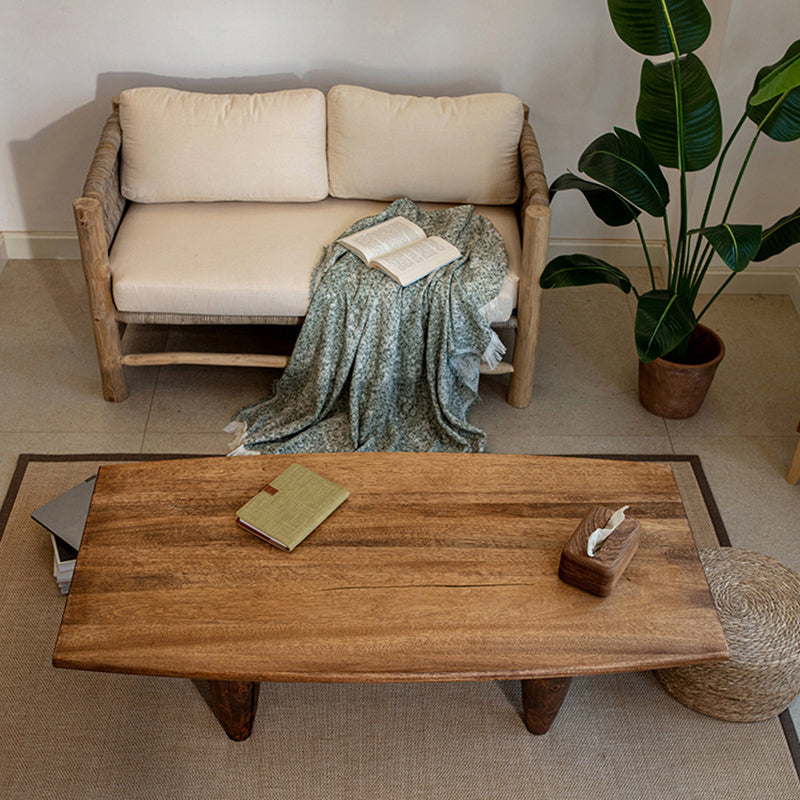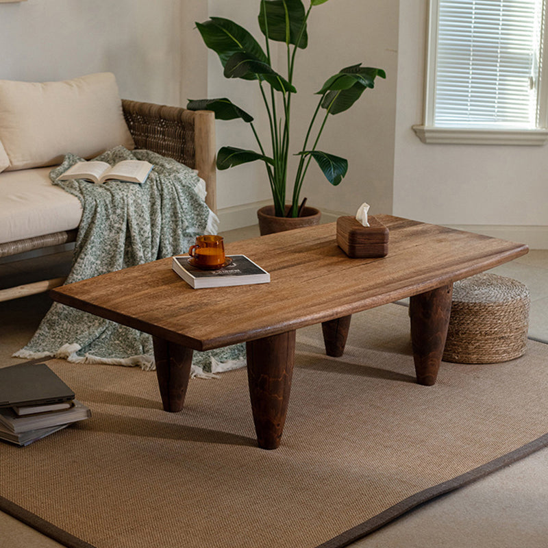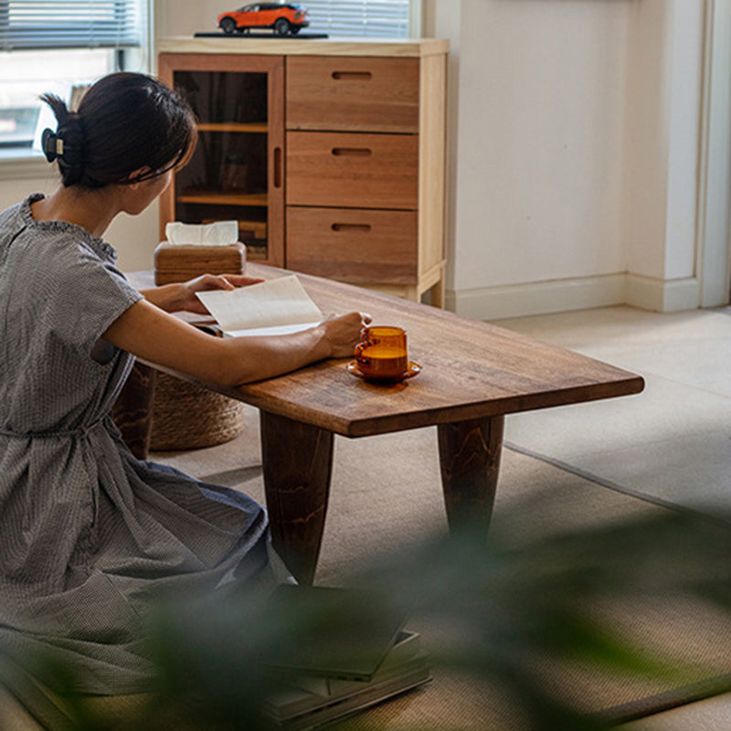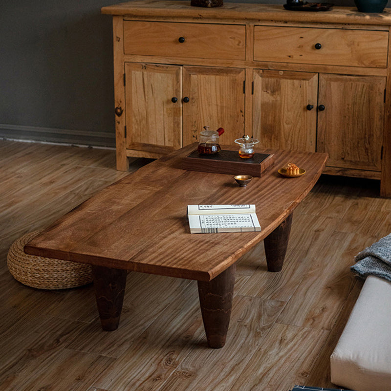 This Traditional Japanese solid wood coffee table features a boat-shaped top and hammer-form legs, finished in a deep walnut tone that highlights the natural wood grain. Designed as a low-profile, single-tier table, it offers a sturdy, grounded presence with smooth lines, making it ideal for Japanese-style living rooms, wabi-sabi interiors, or floor seating spaces.