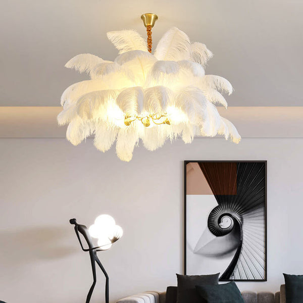 Modern Ostrich Feather 6-Light Brass Chandeliers