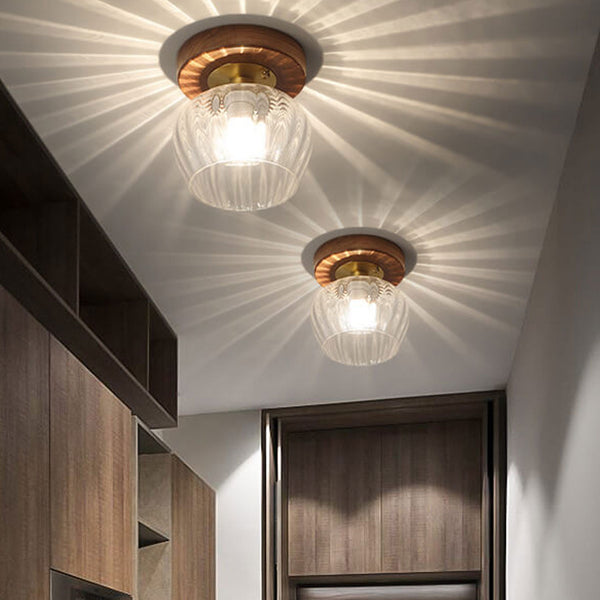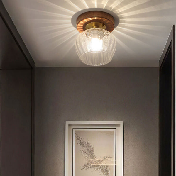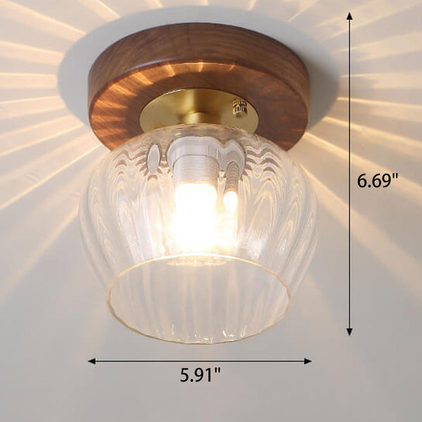 Modern Dome Glass Wooden Base 1-Light Semi-Flush Mount Ceiling Light