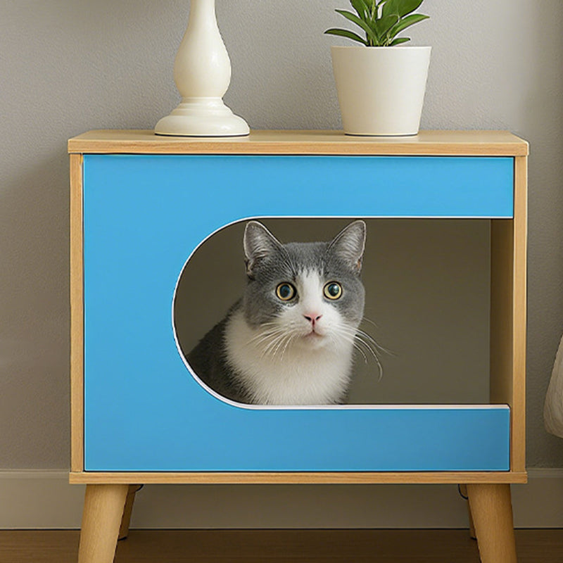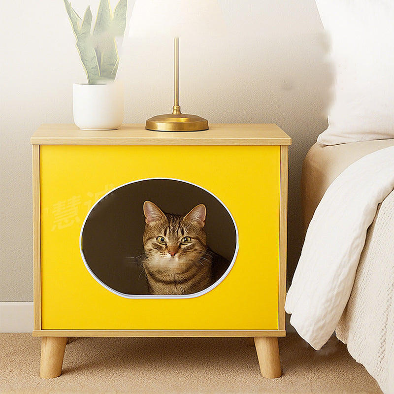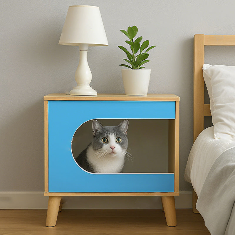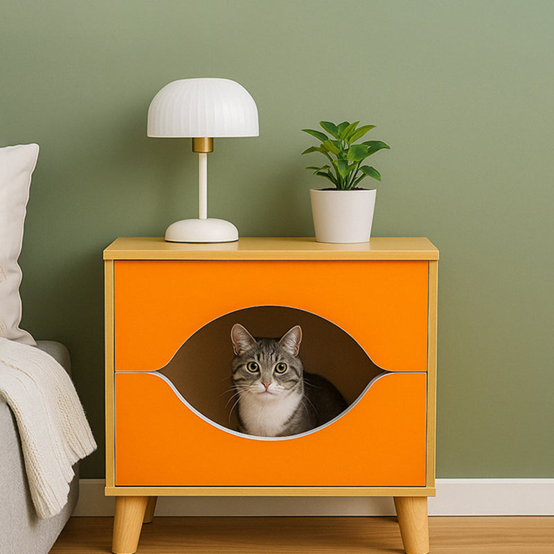 Bring playful functionality to your bedroom with this creative bedside table—the ultimate piece for pet lovers. Expertly combining oak wood with eco-friendly MDF, its standout feature is the charming built-in cat-house design, offering a cozy retreat for your feline friend. This multifunctional, rectangular nightstand also provides practical human storage with one open shelf and one secure storage compartment. It's the perfect compact solution that blends whimsical style with essential organization and a dedicated cat resting spot.