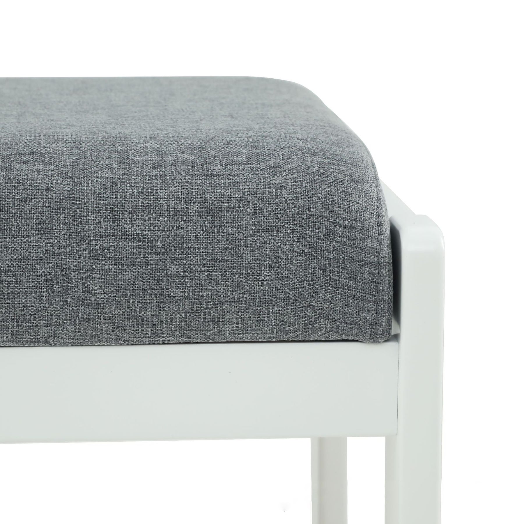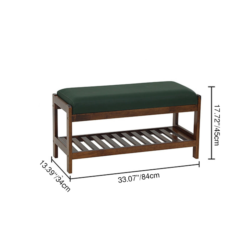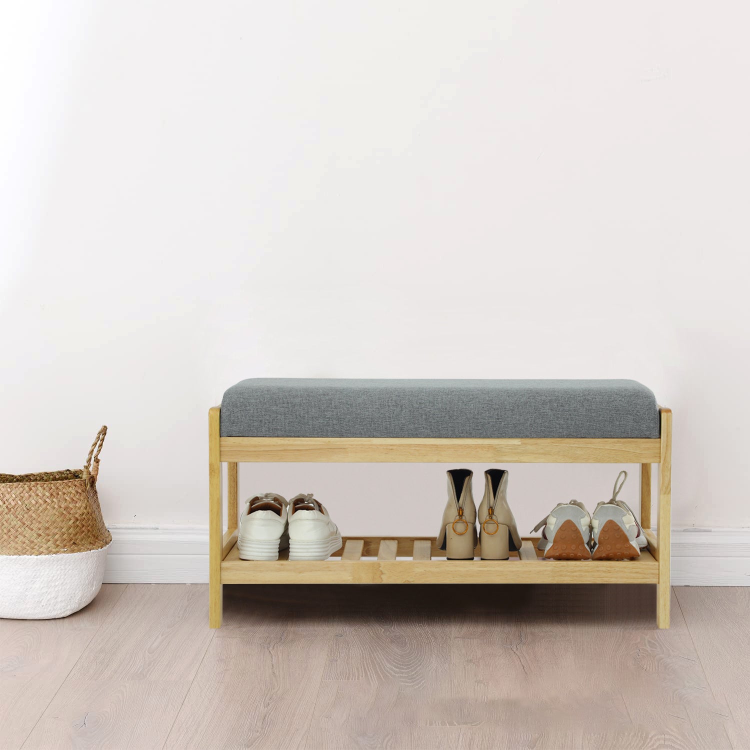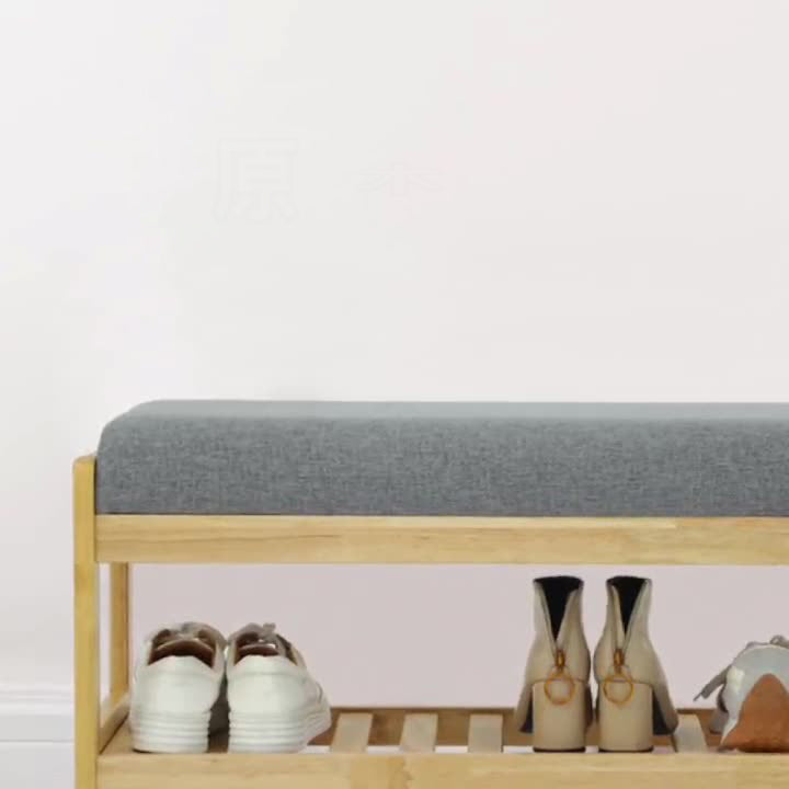 This contemporary Scandinavian shoe bench features a rectangular solid-wood frame with a built-in shoe rack, paired with a thick fabric cushion that offers comfortable, non-collapsing support. Available in walnut, white, and natural wood, it brings a clean modern look and smooth rounded corners, making it an ideal seating and storage solution for the living room entryway.