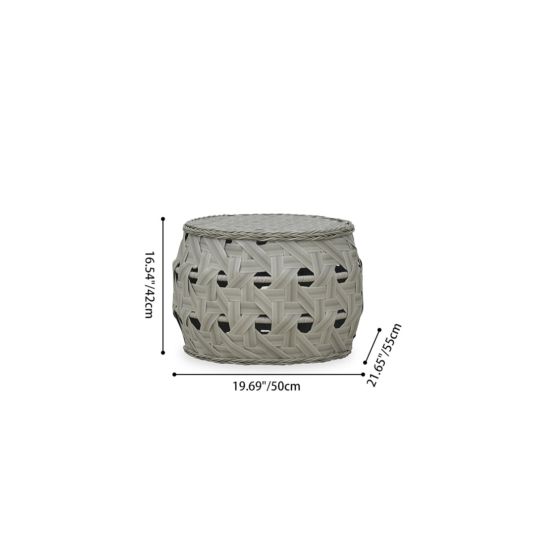 This modern outdoor coffee table features a rounded barrel silhouette wrapped in wide-strip PE rope weave, creating a stylish and breathable texture. The carbon-colored aluminum frame is rust-resistant, lightweight, and built for all-weather durability. Its tempered transparent glass top offers a sleek, easy-to-clean surface, perfect for outdoor gatherings. Ideal for patios, gardens, terraces, or poolside, this table adds elegance and function to any outdoor space.