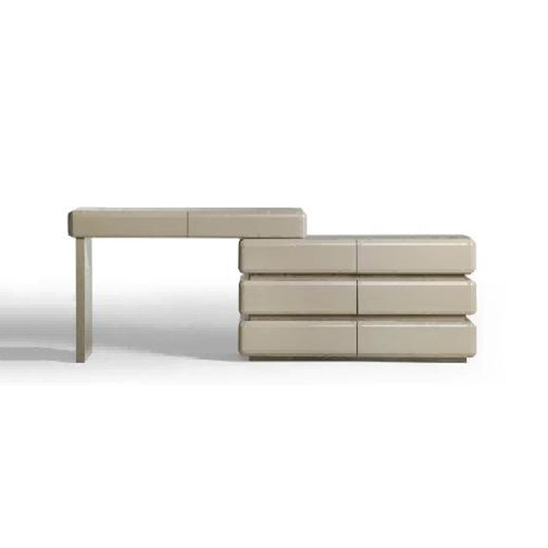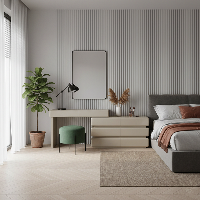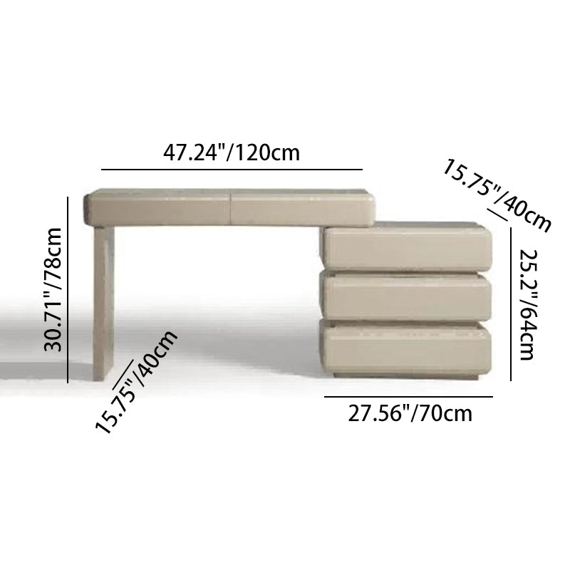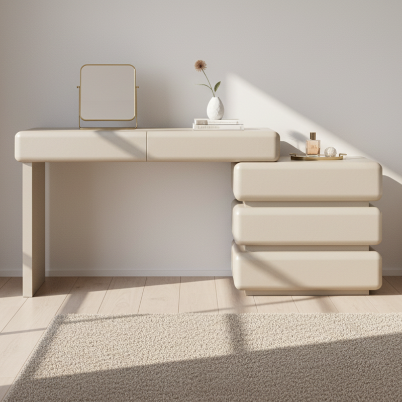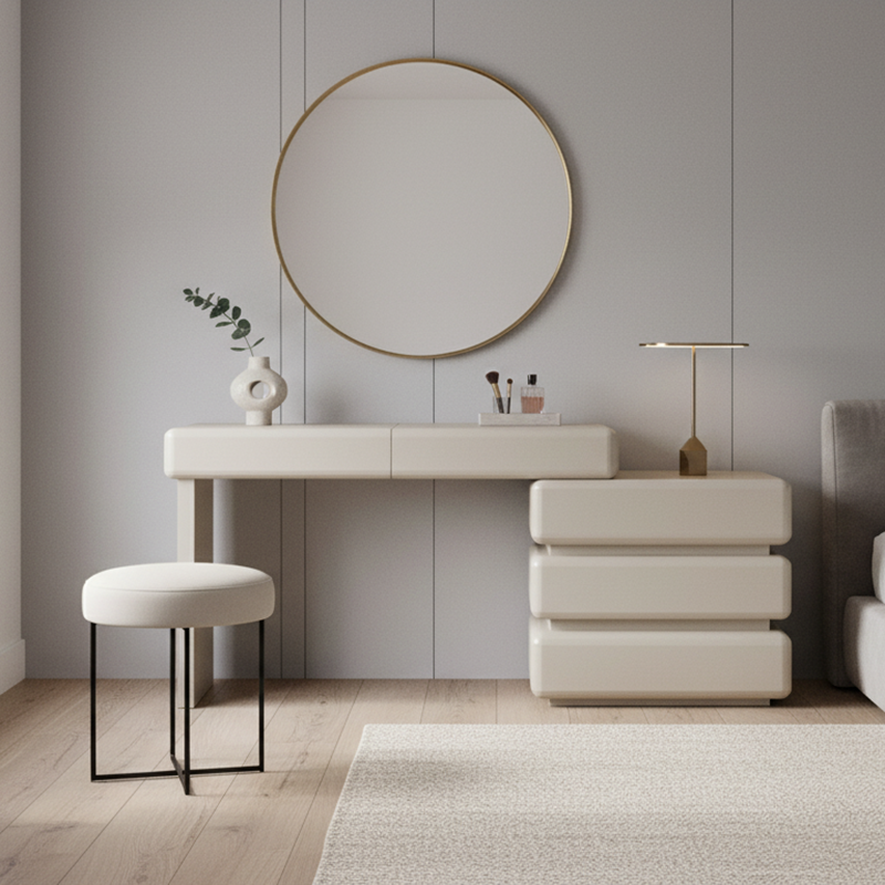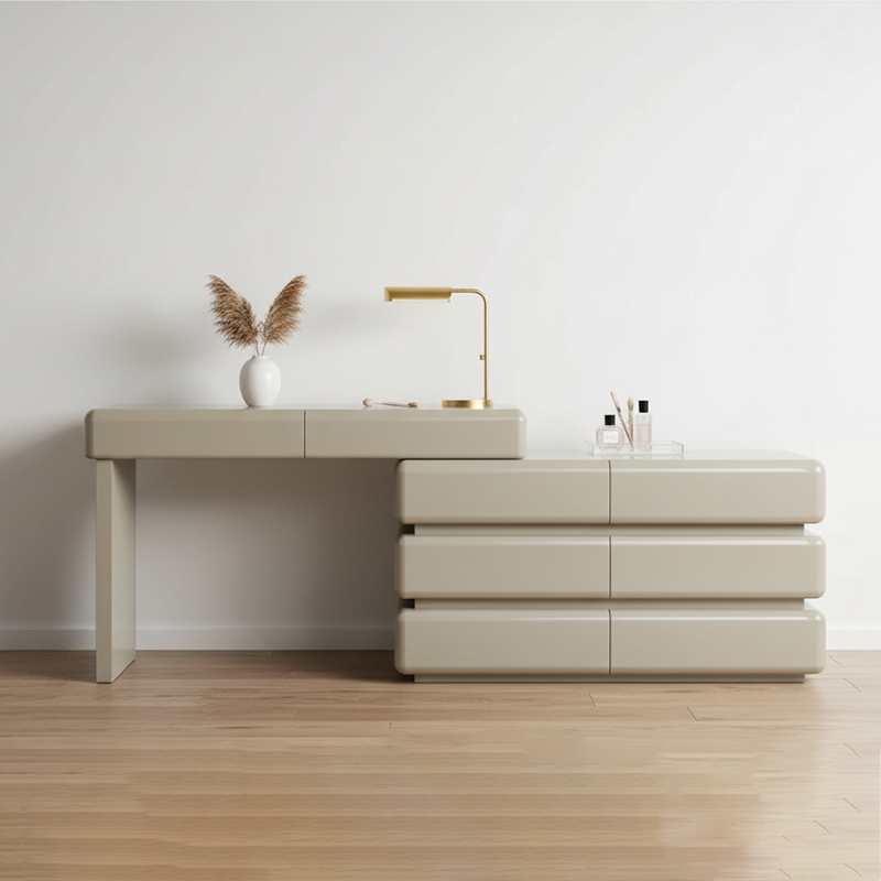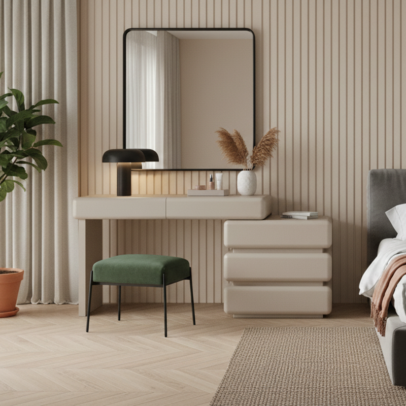 Upgrade your bedroom with this modern minimalist khaki vanity table, thoughtfully designed to organize your daily essentials with elegance and ease.