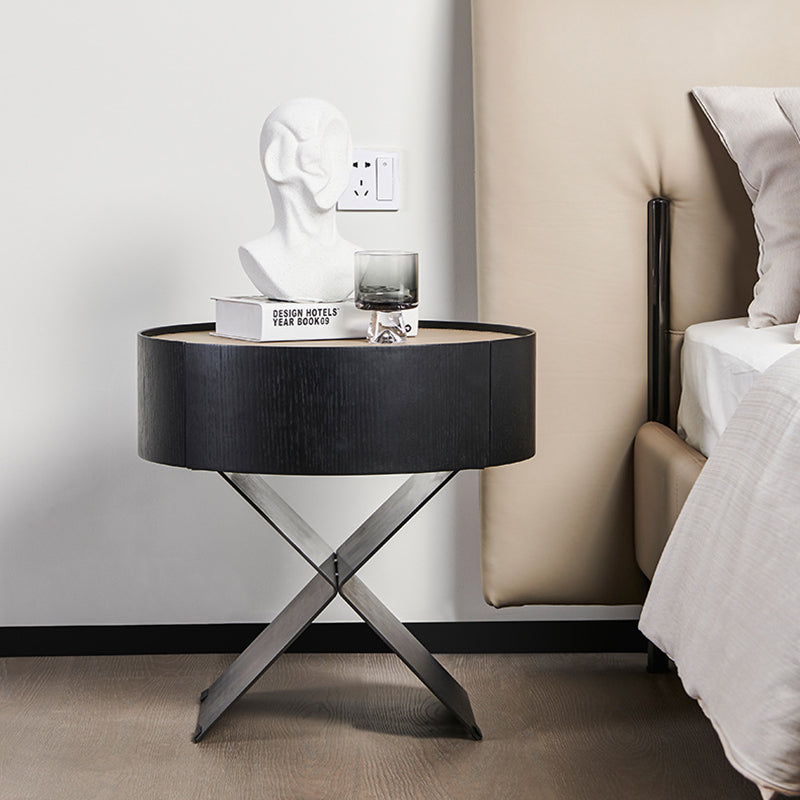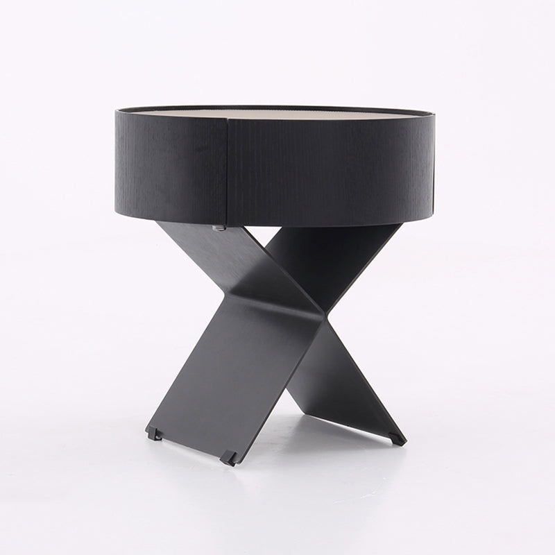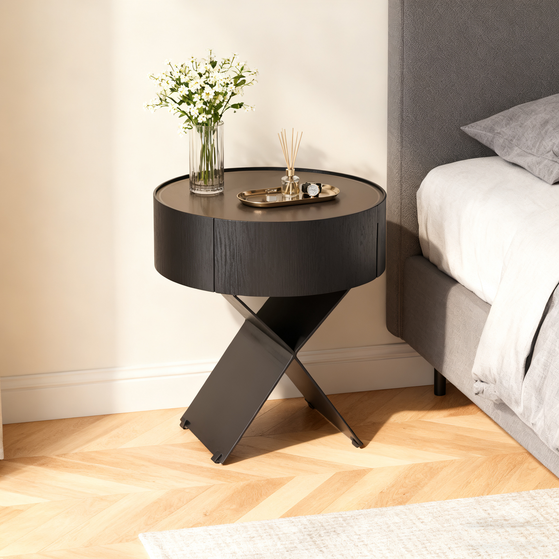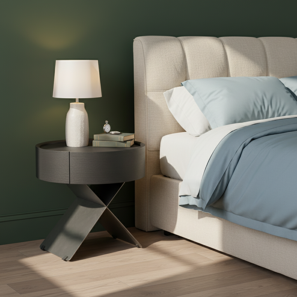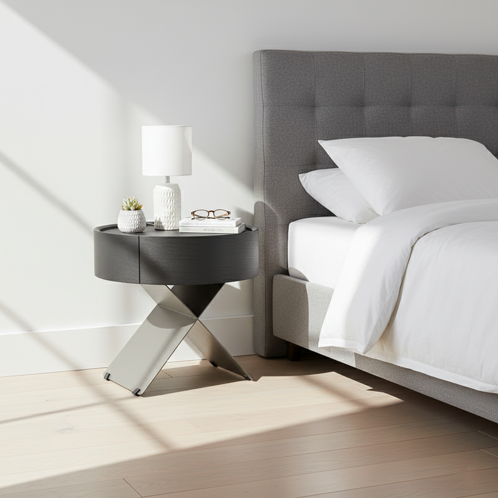 • Shape Ingenuity: Round cabinet + X-legs, industrial design fits various bedrooms.