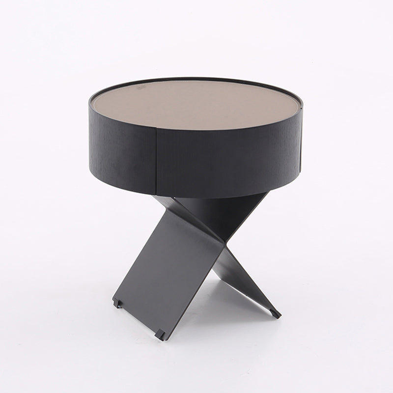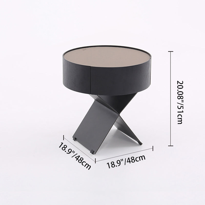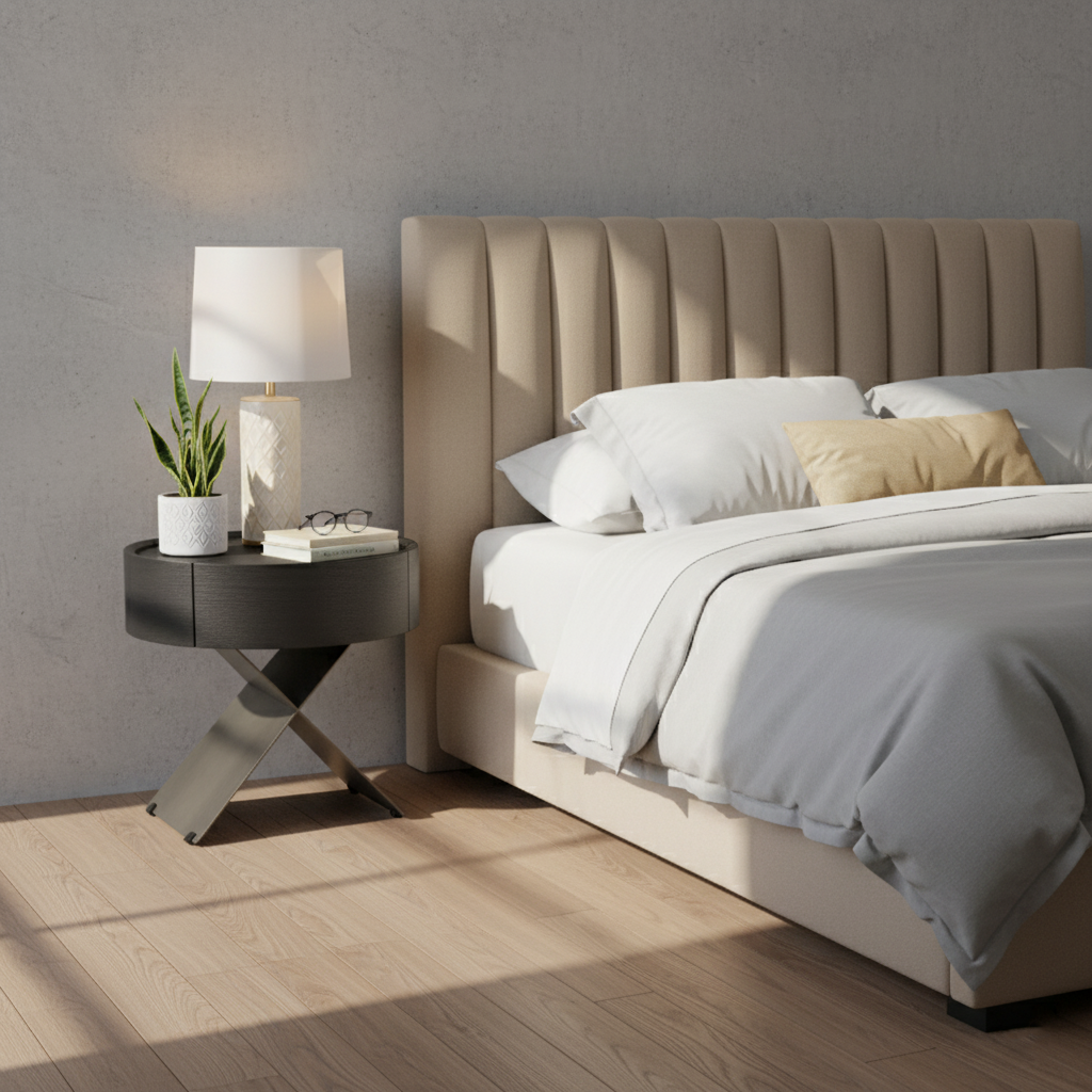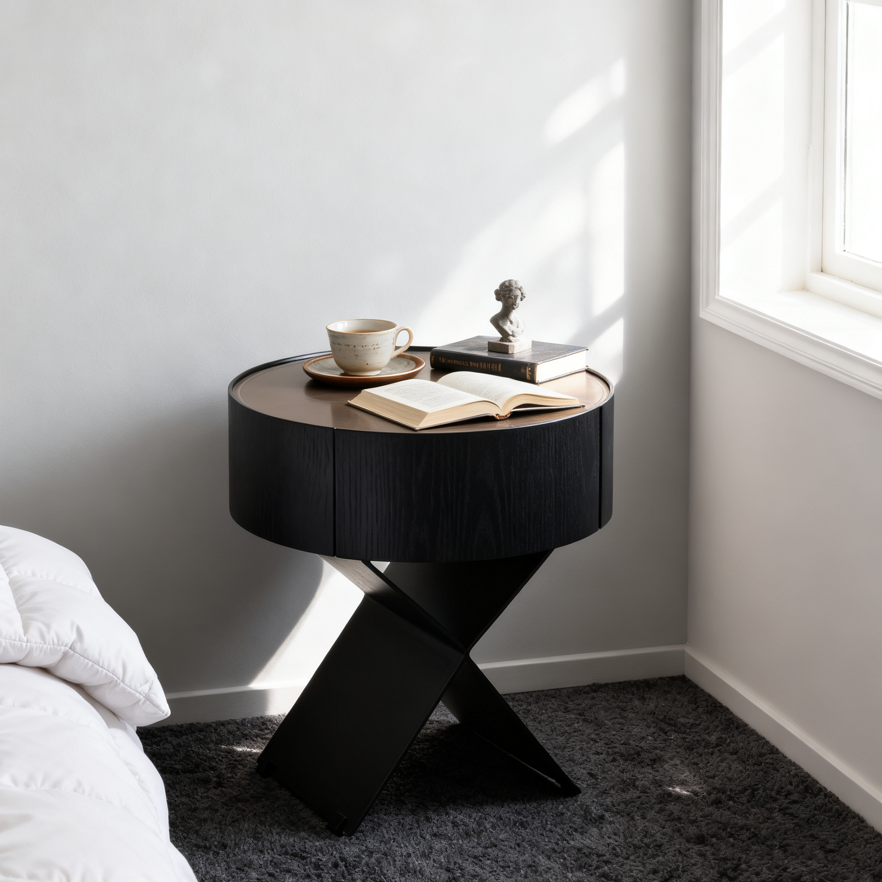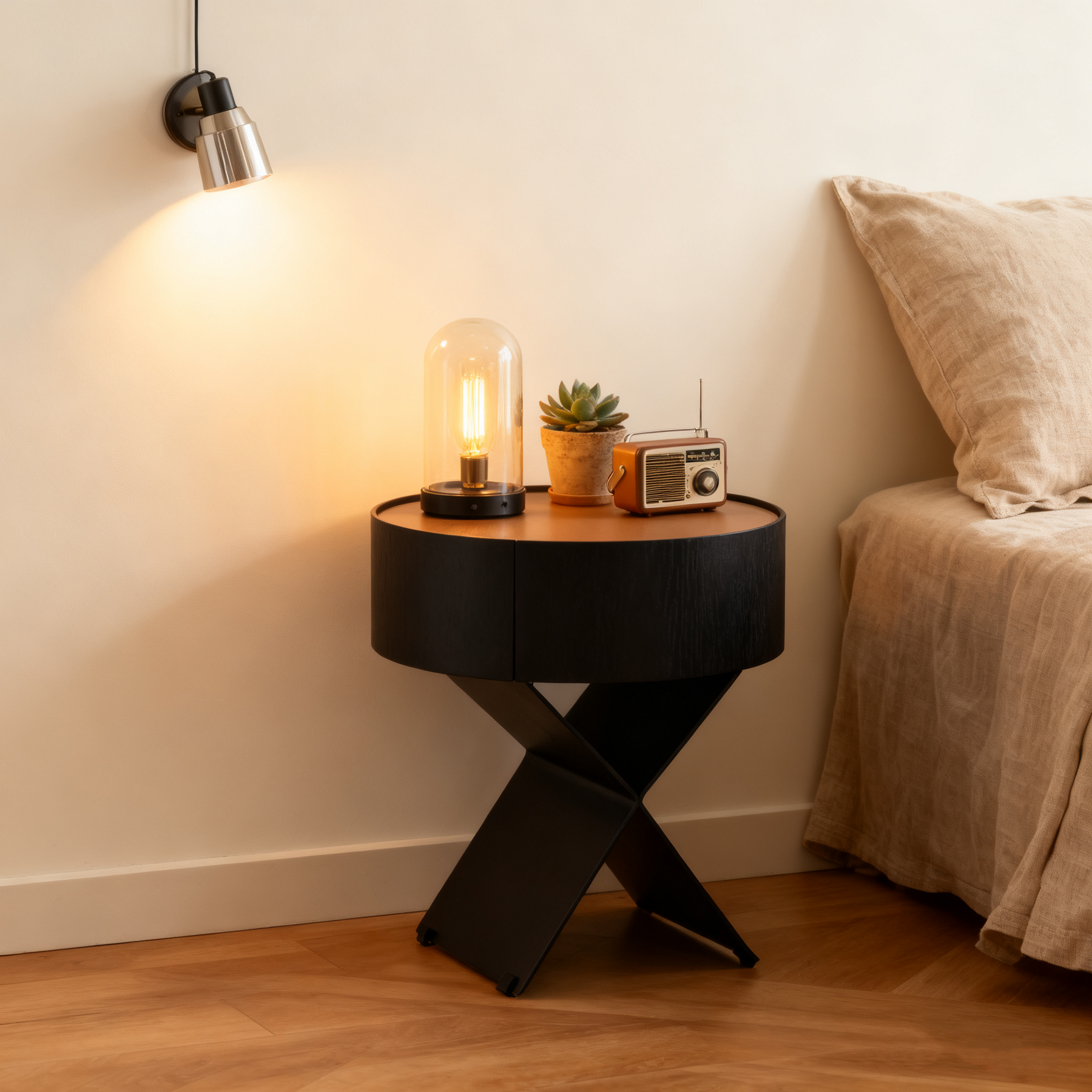 • Shape Ingenuity: Round cabinet + X-legs, industrial design fits various bedrooms.