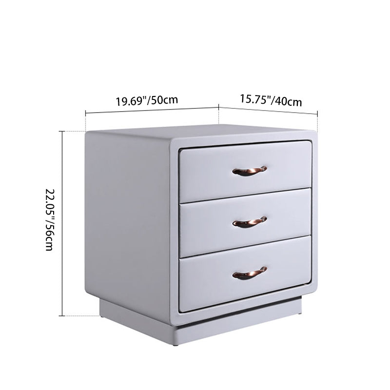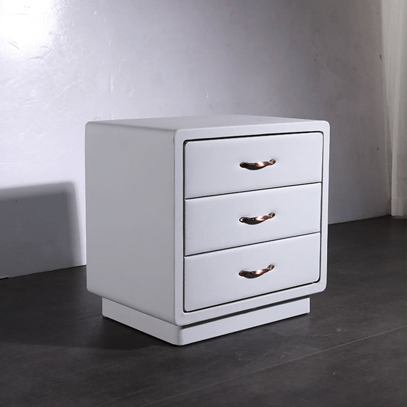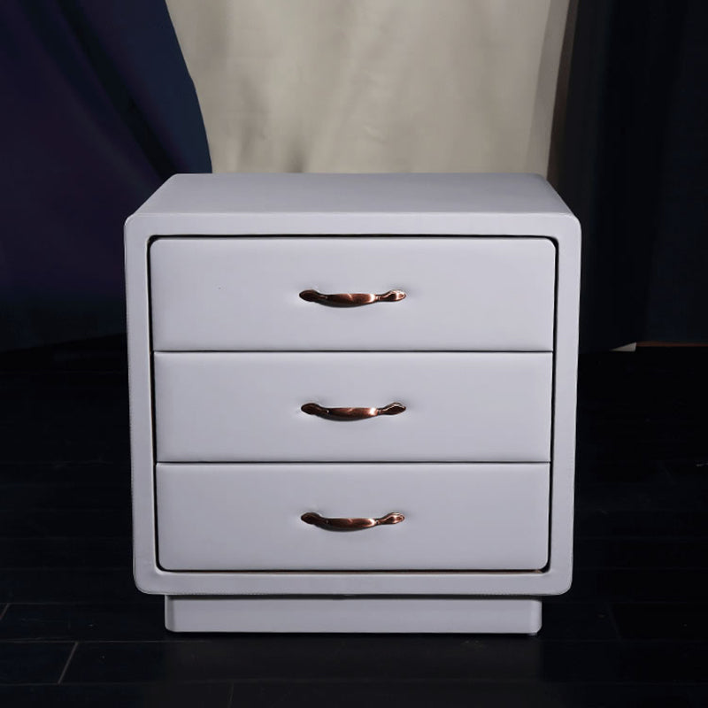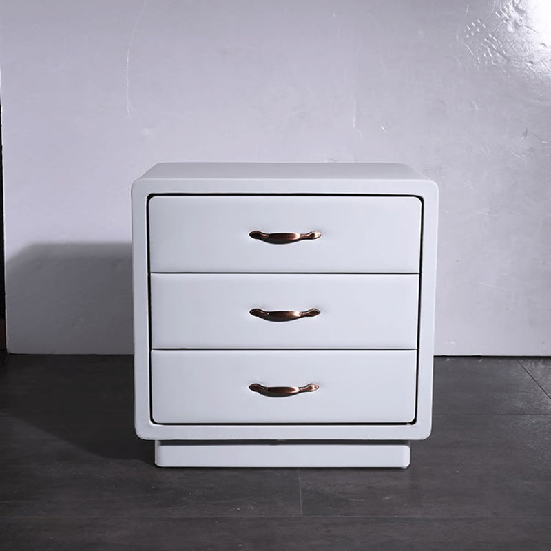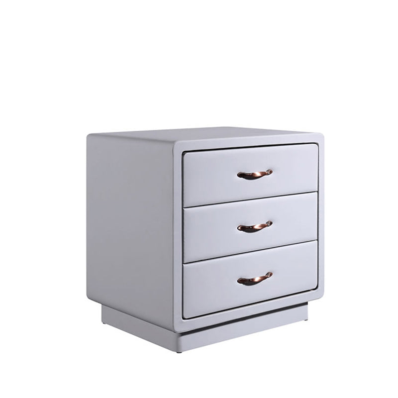 Wrapped in smooth Soft Ivory White faux leather, this nightstand blends modern elegance with tactile comfort. The cube-shaped silhouette features rounded corners and smooth edges, enhancing safety and aesthetic softness. Three spacious solid wood drawers offer practical storage, detailed with recessed trim and accented by warm gold metal handles for a refined touch.