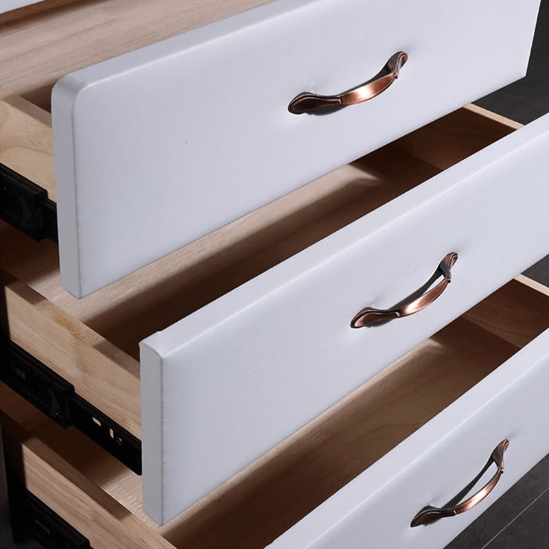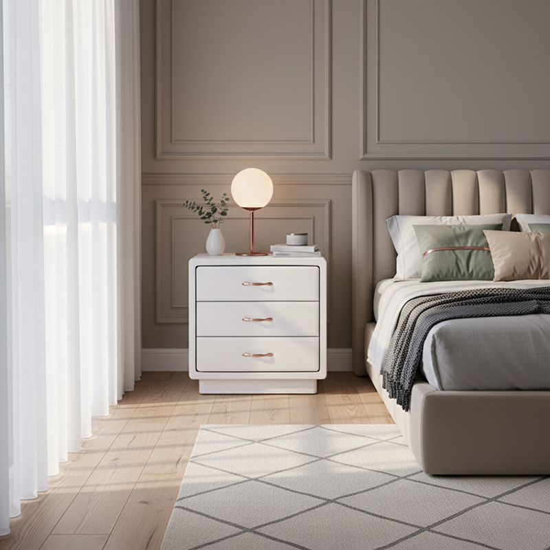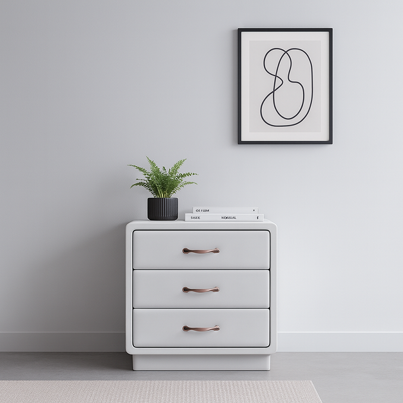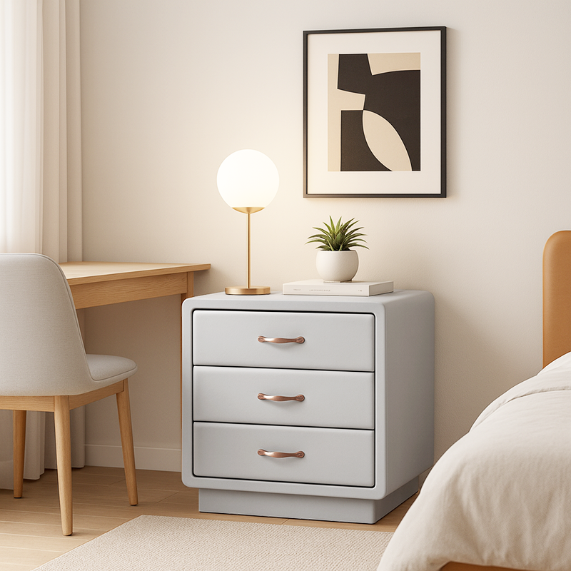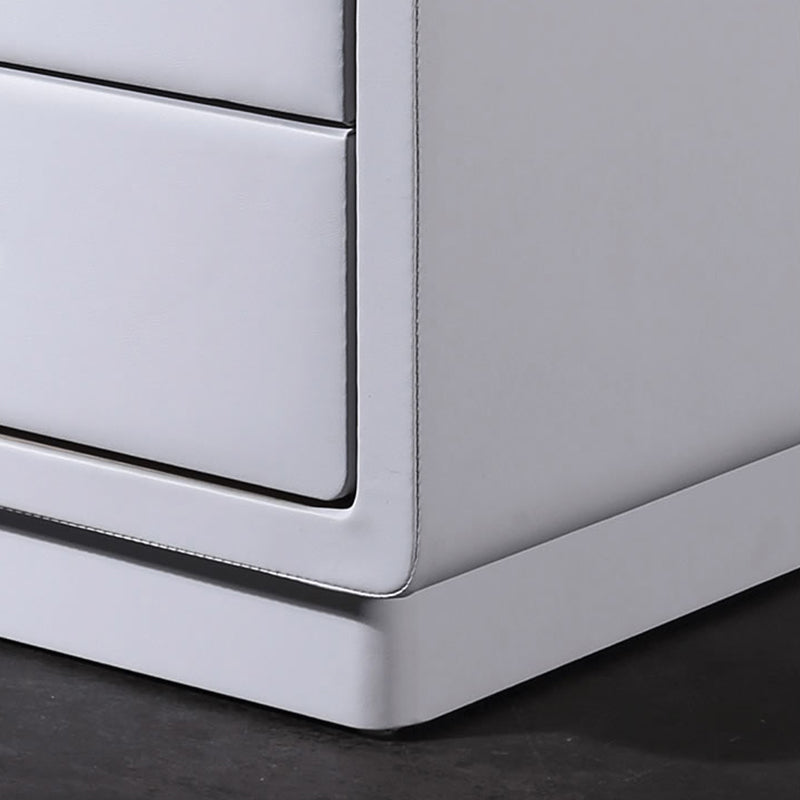 Wrapped in smooth Soft Ivory White faux leather, this nightstand blends modern elegance with tactile comfort. The cube-shaped silhouette features rounded corners and smooth edges, enhancing safety and aesthetic softness. Three spacious solid wood drawers offer practical storage, detailed with recessed trim and accented by warm gold metal handles for a refined touch.