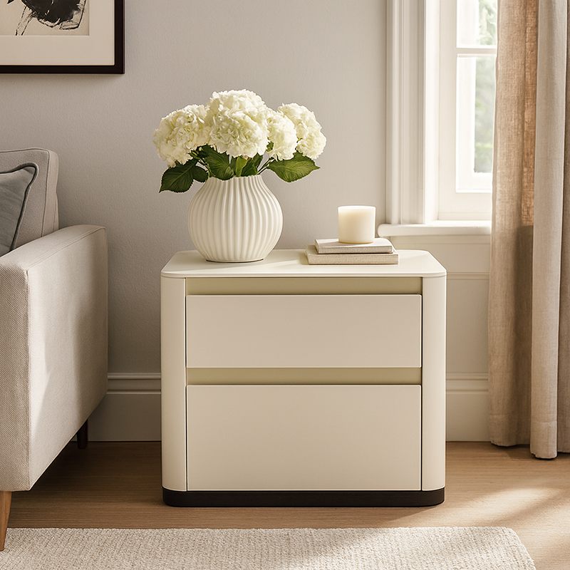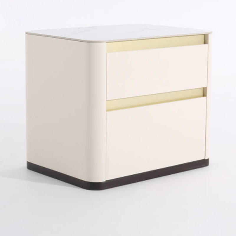 Modern Cream Rounded Corners Bedside Table - Sintered Stone 2 Drawer Nightstand For Bedroom