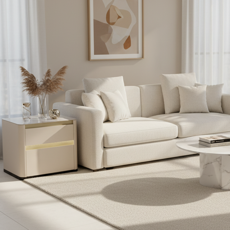 This contemporary nightstand features a smooth, rounded silhouette and a soft cream finish that brings calm elegance to any bedroom. Built with eco-friendly MDF and solid wood drawers for durability, it offers practical storage in a clean, handle-free design. The stone top adds a premium touch with natural texture that’s scratch-resistant and easy to clean. Perfect for modern, Scandinavian and minimalist home interiors.