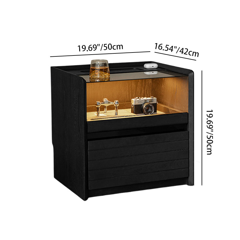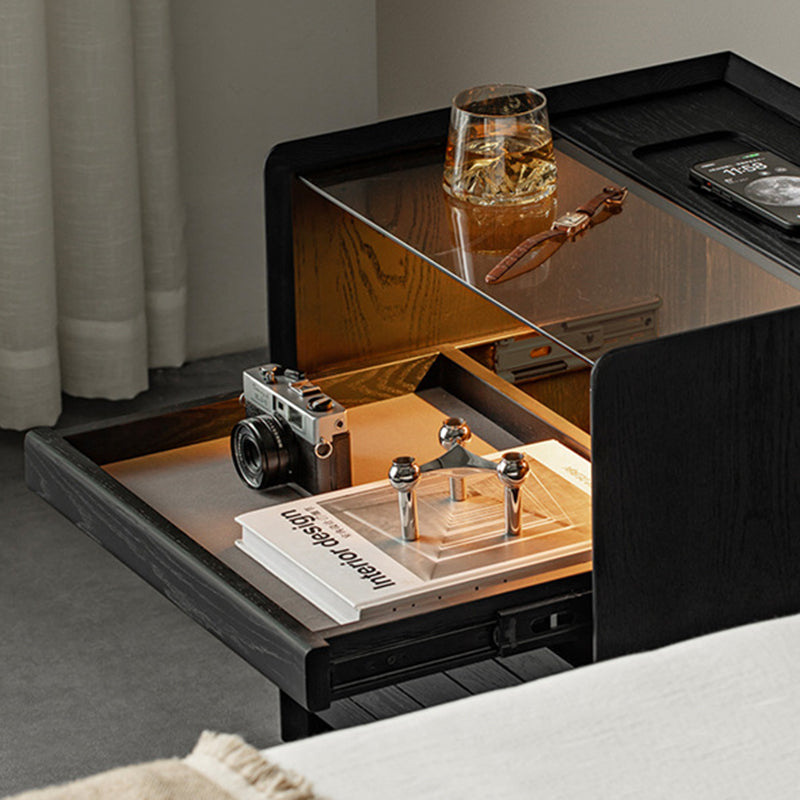 Upgrade your bedroom with this modern luxury nightstand, crafted from durable solid plywood and finished with a sleek glass tabletop. Designed for effortless convenience, it features built-in wireless charging, a sensor-activated LED light, and multiple storage zones—including an open display shelf, a middle compartment, and one smooth-glide drawer. The full-base design prevents dust build-up, while the sturdy structure ensures long-lasting performance.
