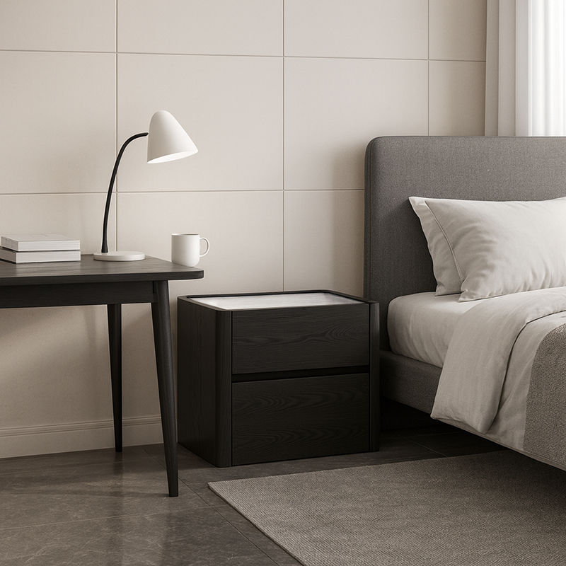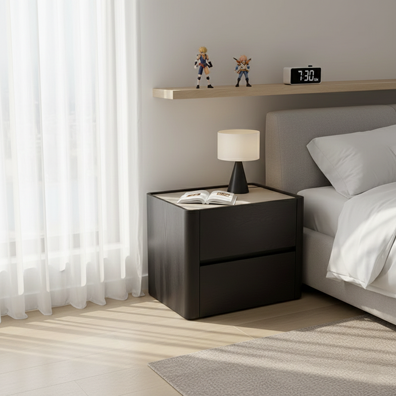 Introduce calm structure and understated elegance to your bedroom with this modern black nightstand, designed with clean lines and a refined rectangular silhouette. Expertly crafted from curved multilayer solid wood panels and finished with a smooth veneer, this piece offers exceptional durability alongside a seamlessly refined minimalist look. Two spacious drawers provide ample, organized storage for all bedside essentials, ensuring your space remains neat and uncluttered. This nightstand is the perfect sophisticated solution for modern apartments, minimalist bedrooms, and contemporary interiors.