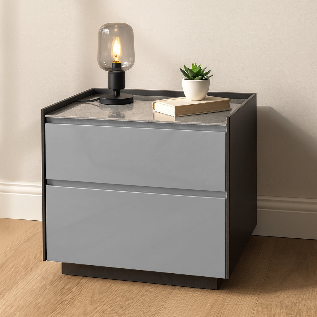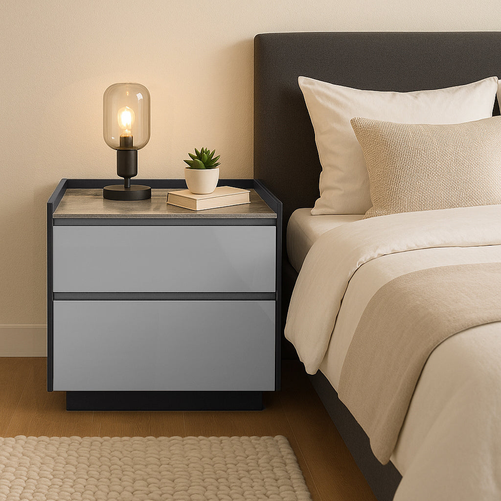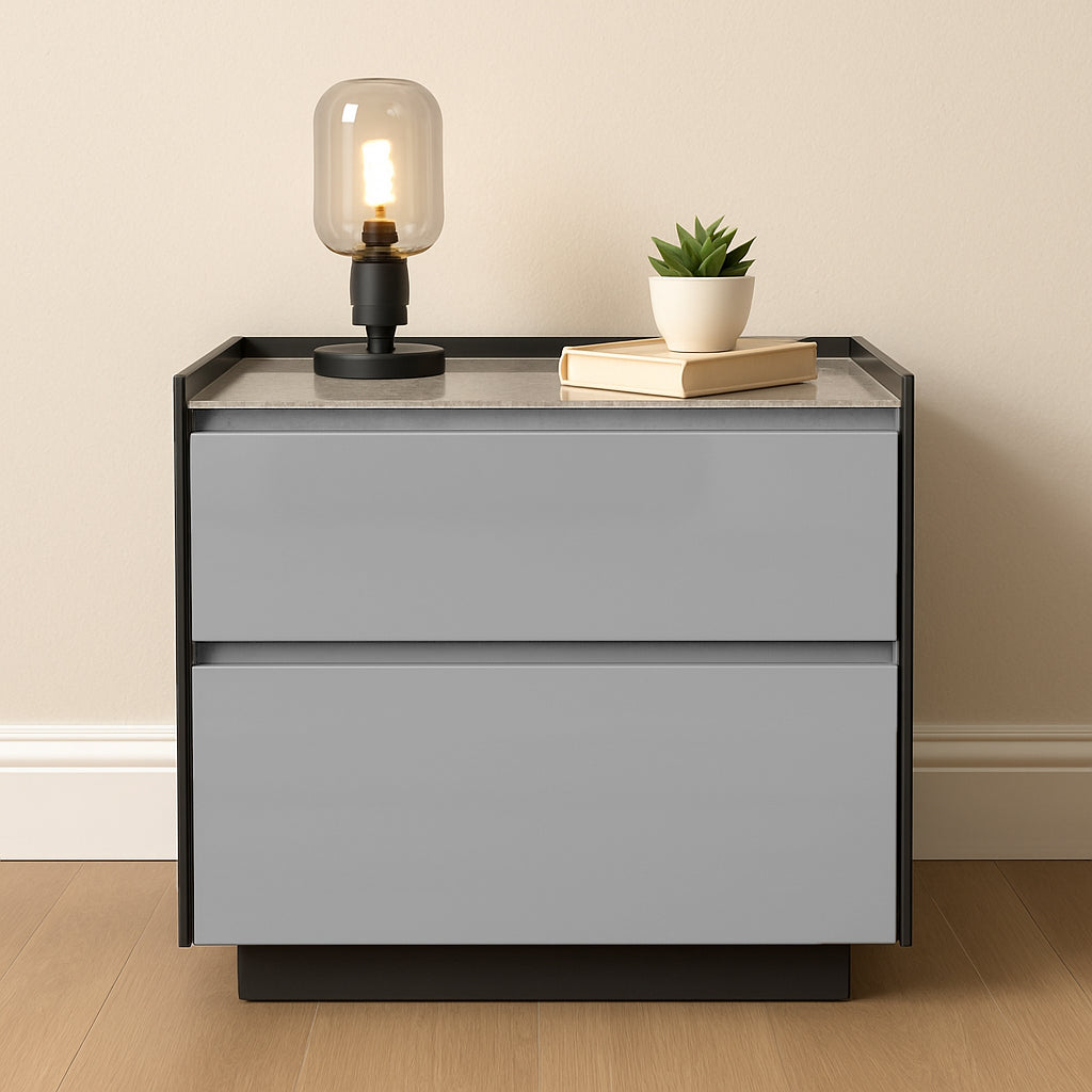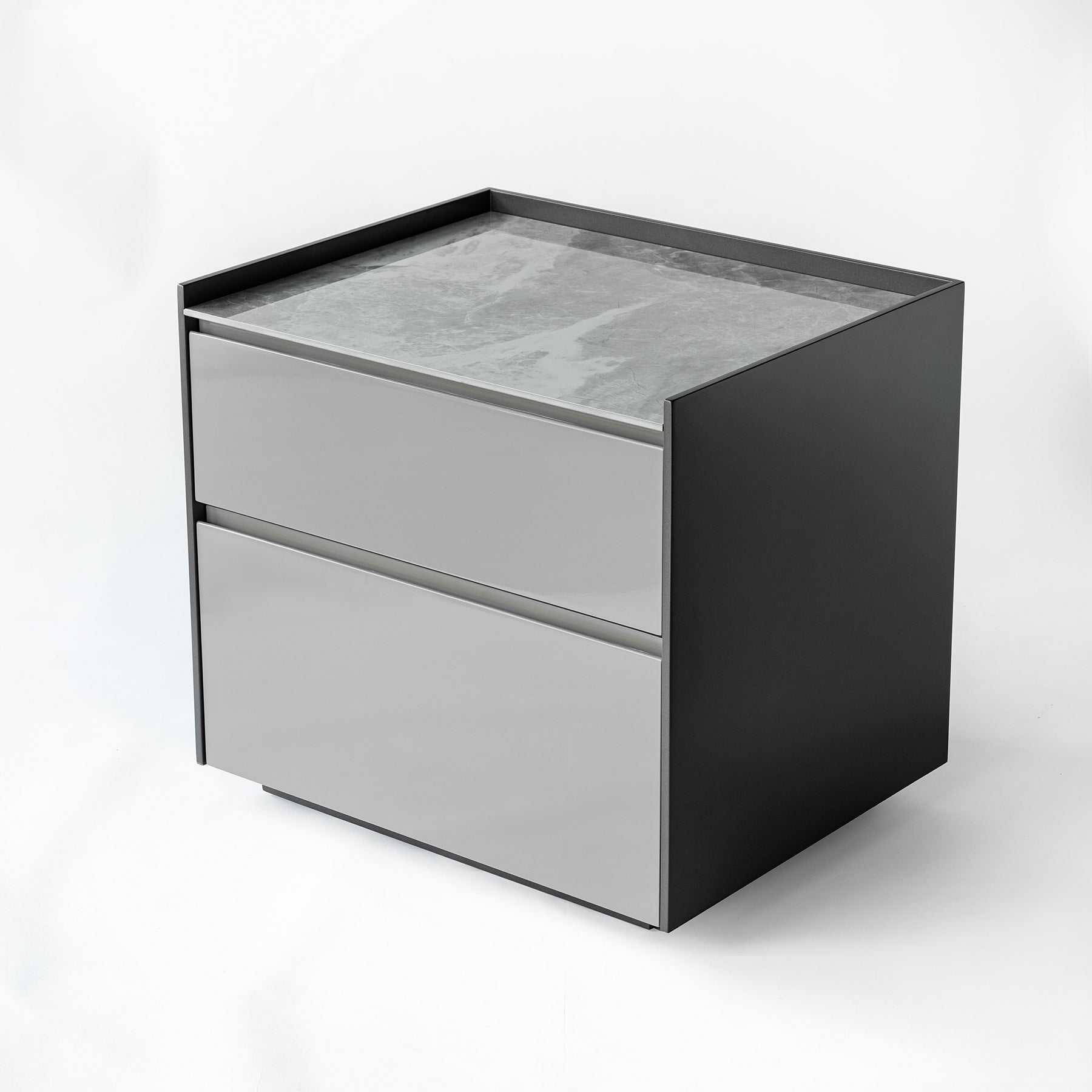 This minimalist bedside table blends a solid multi-layer wood structure with a premium sintered stone top, offering exceptional strength and daily convenience. Its open-edge tray keeps items secure, while the two fully enclosed drawers store essentials neatly out of sight. A fully enclosed full-base design keeps the nightstand flush with the floor, preventing dust from gathering underneath and making everyday cleaning far more effortless. On the front, two spacious drawers offer enclosed storage space that keeps your items organized and dust-free. The hidden-handle design maintains the seamless appearance, giving the piece a sleek, uninterrupted front panel while ensuring a comfortable grip.