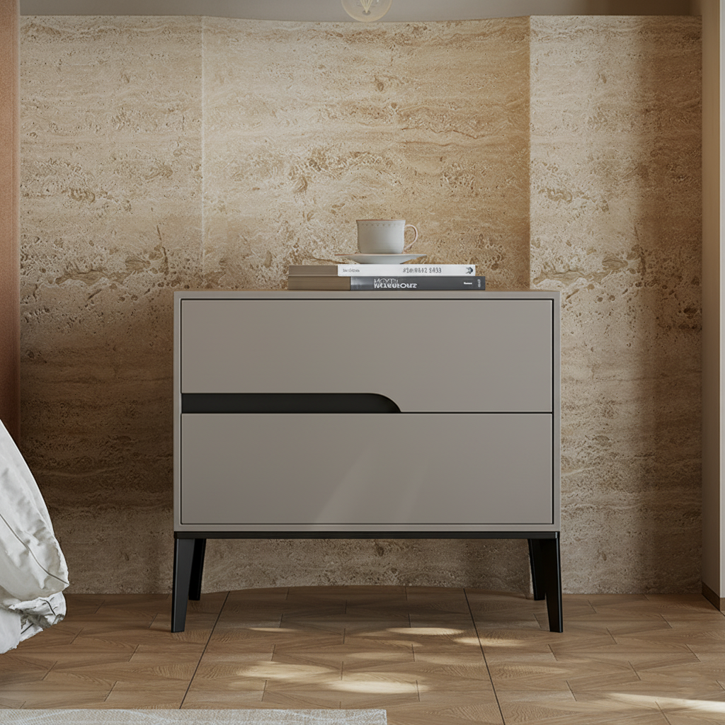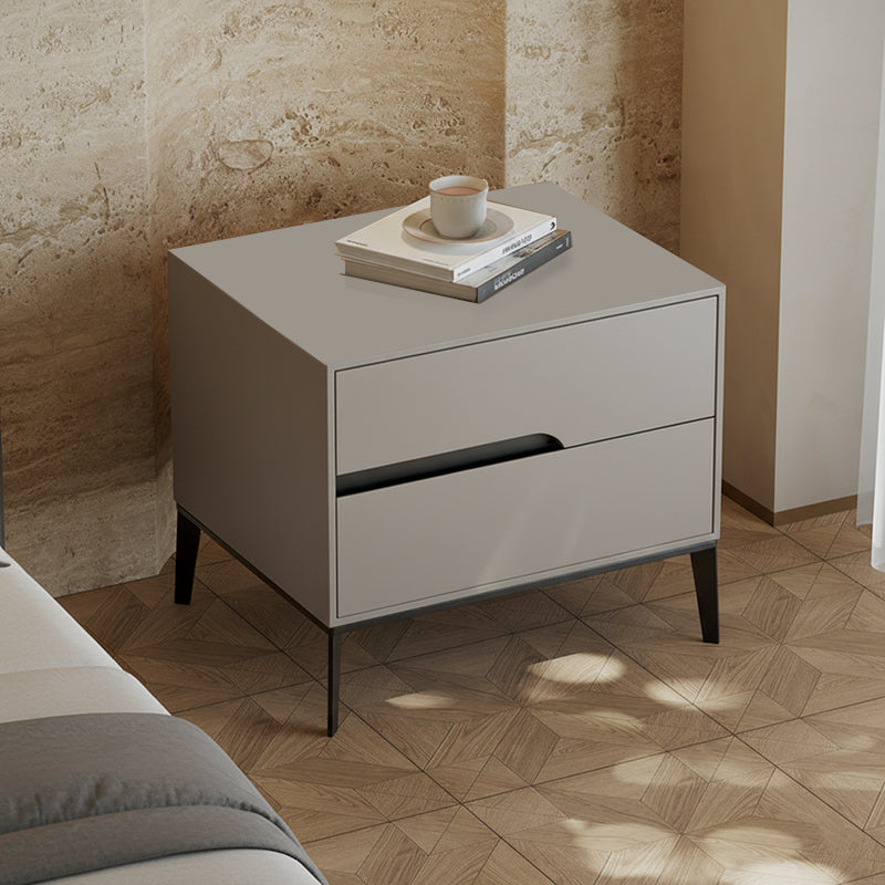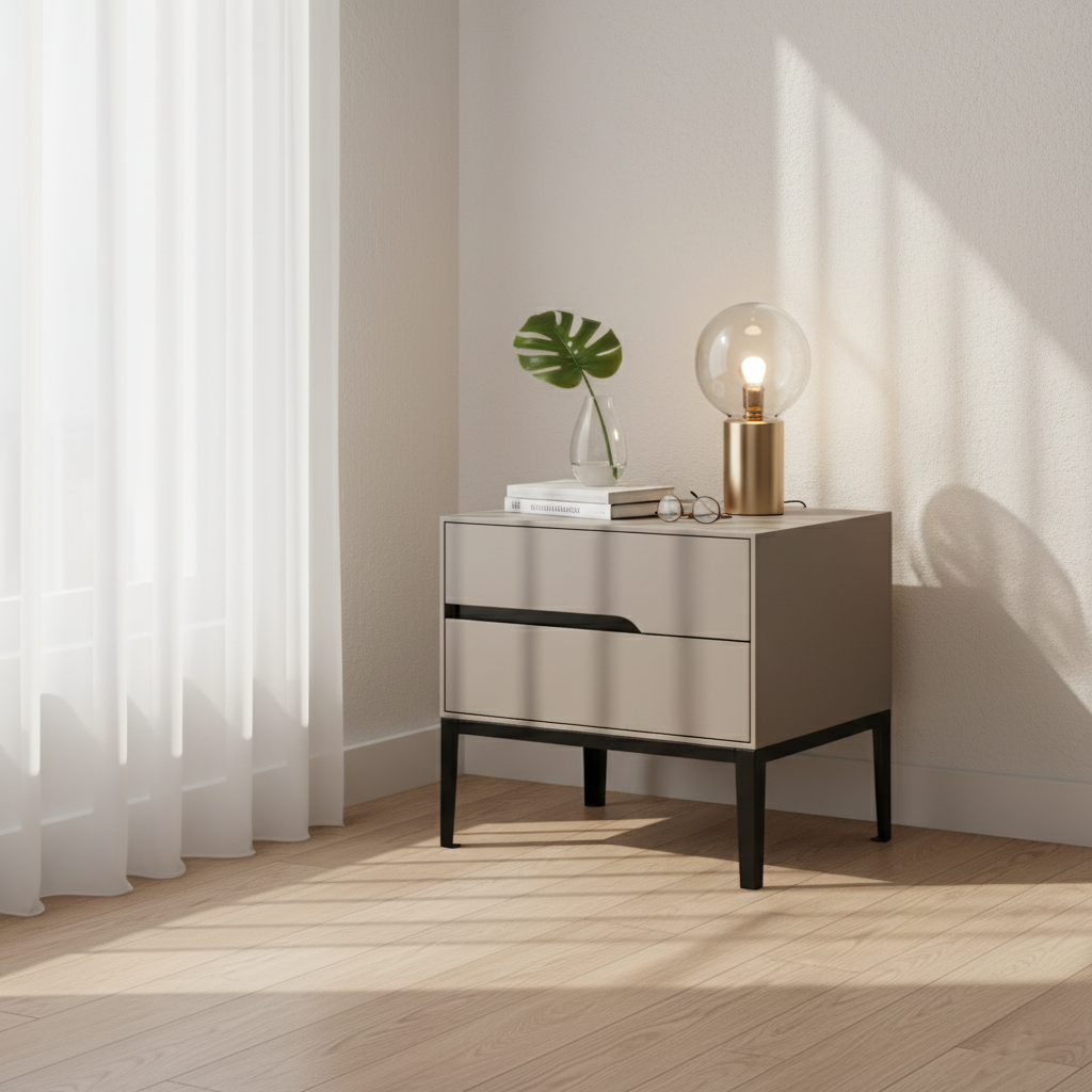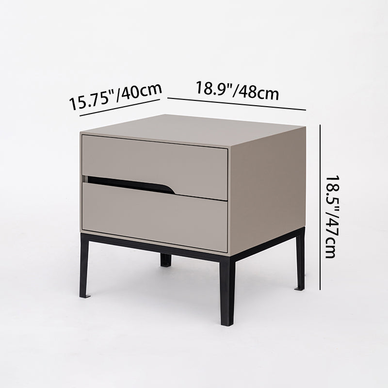 Upgrade your bedroom with this modern rectangular nightstand crafted from E1-grade eco-friendly MDF, offering a clean, odor-free finish. Designed with 2 smooth-gliding drawers and a convenient open tabletop storage area, it keeps your nightly essentials neatly organized. The built-in recessed handles maintain a minimalist look, while the reinforced iron legs with an elevated base ensure strong stability, excellent load-bearing performance, and easy cleaning underneath. A perfect space-saving bedside table for any modern bedroom.