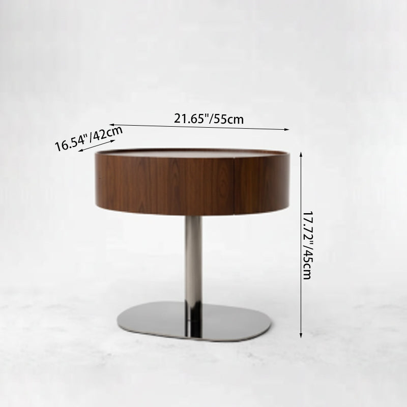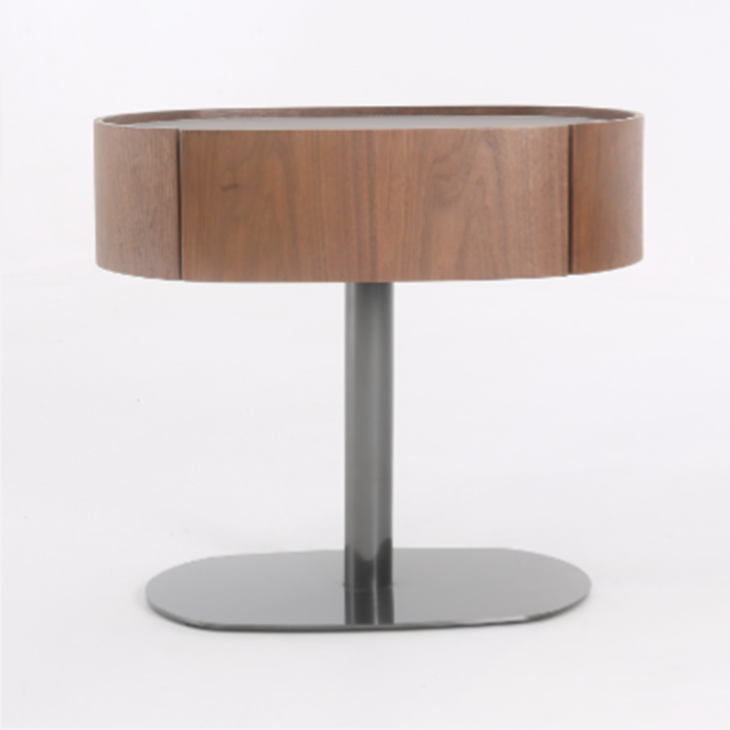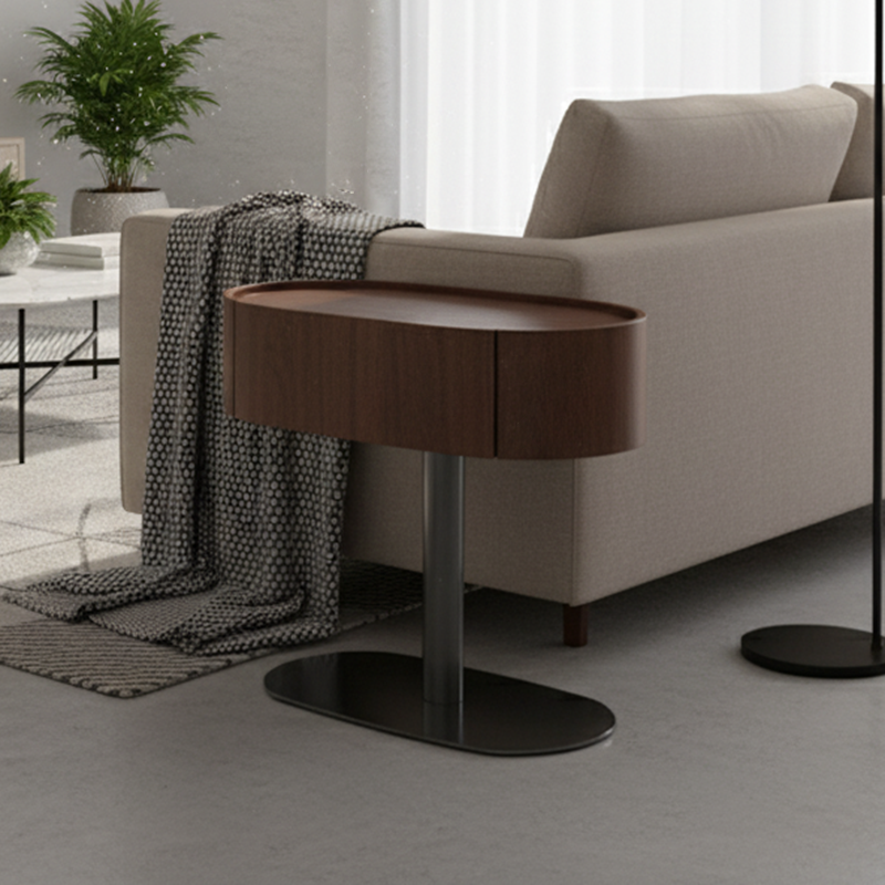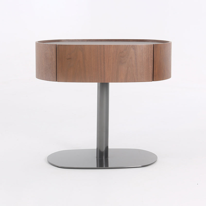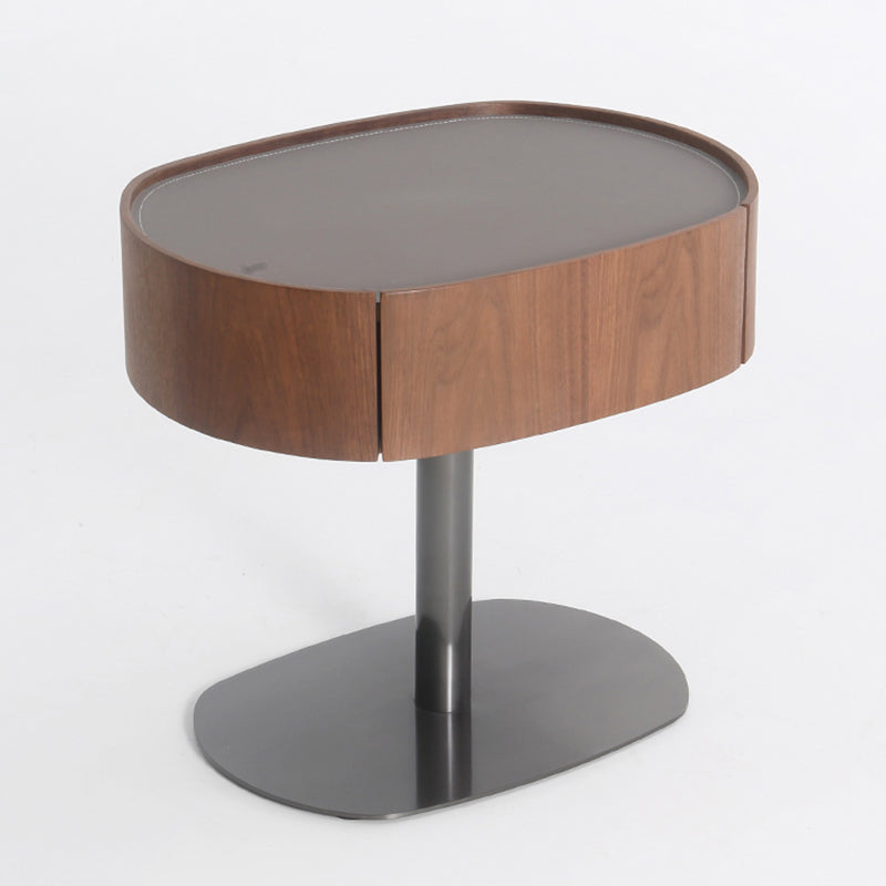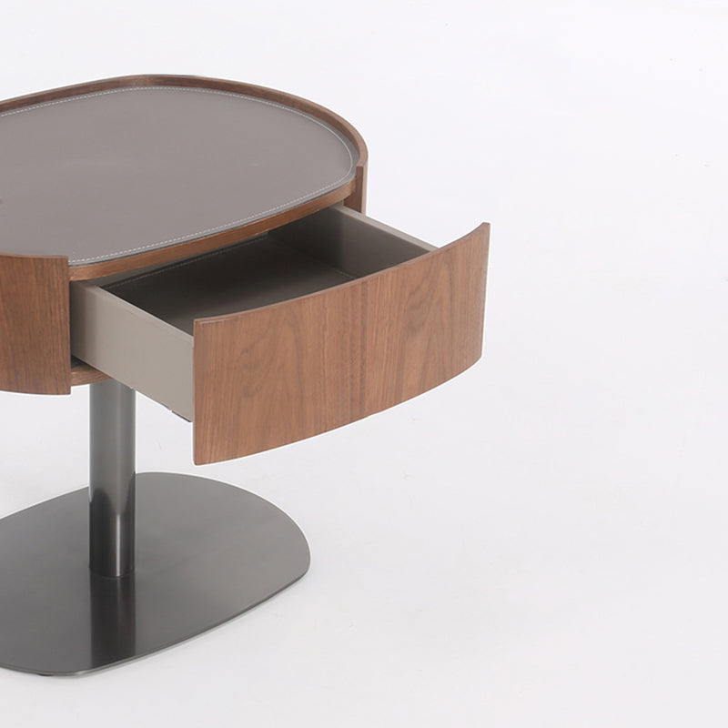This modern oval nightstand blends walnut veneer, solid wood, saddle leather, and stainless steel to create a warm yet luxurious look. The curved saddle leather top adds refined texture, while the sleek oval shape brings softness to the space. A deep grey stainless steel pedestal base provides sturdy support with a modern floating effect. Perfect for luxury, minimalist, and contemporary bedrooms seeking both style and function.
