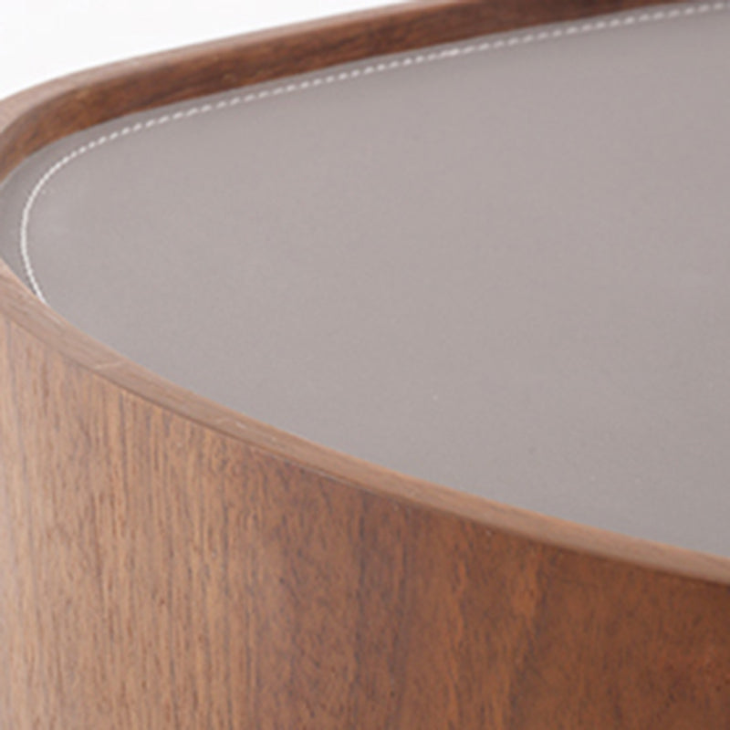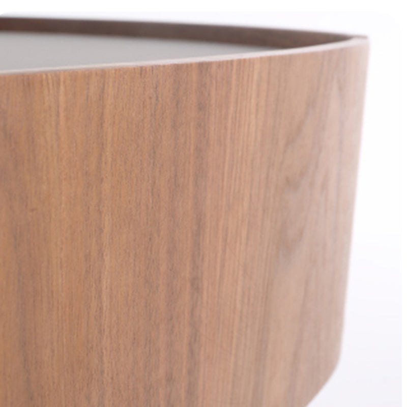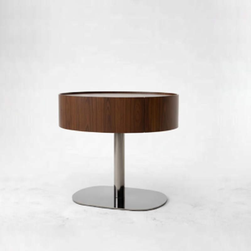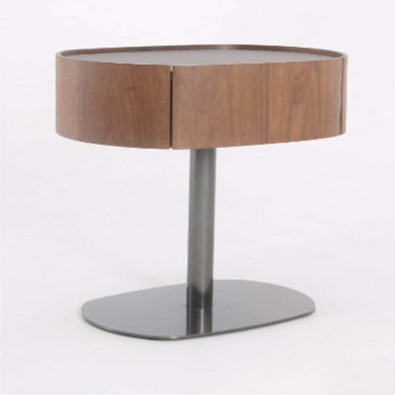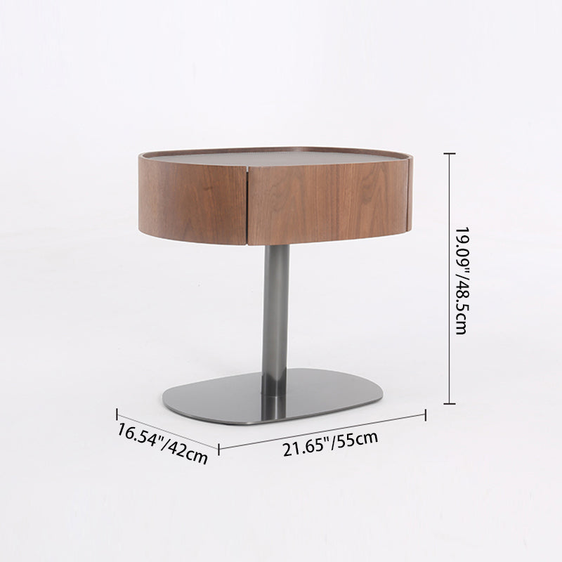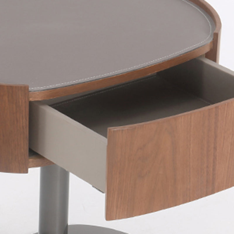 This modern oval nightstand blends walnut veneer, solid wood, saddle leather, and stainless steel to create a warm yet luxurious look. The curved saddle leather top adds refined texture, while the sleek oval shape brings softness to the space. A deep grey stainless steel pedestal base provides sturdy support with a modern floating effect. Perfect for luxury, minimalist, and contemporary bedrooms seeking both style and function.