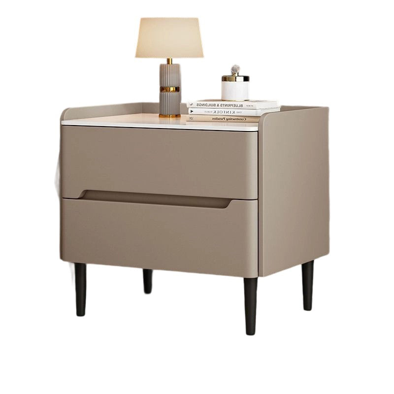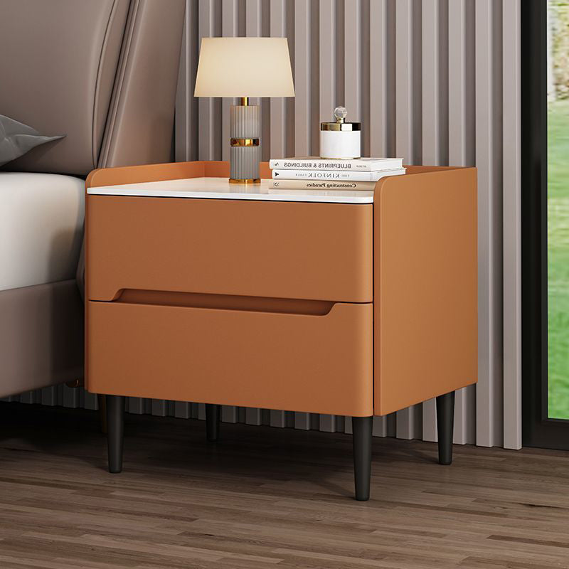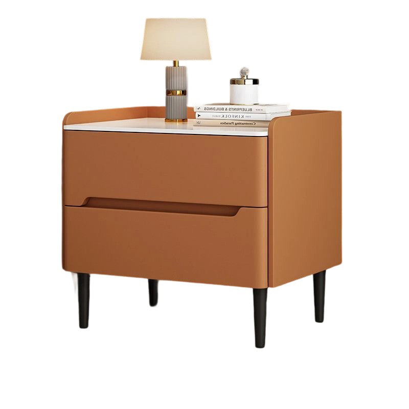 This elegant nightstand features a sintered stone top, pine wood structure, and soft Nappa leather finish for a refined modern look. Designed with two deep drawers, raised metal legs, and smooth rounded edges, it provides sturdy, organized storage in khaki, beige, orange, and gray hues—perfect for luxury bedroom interiors.