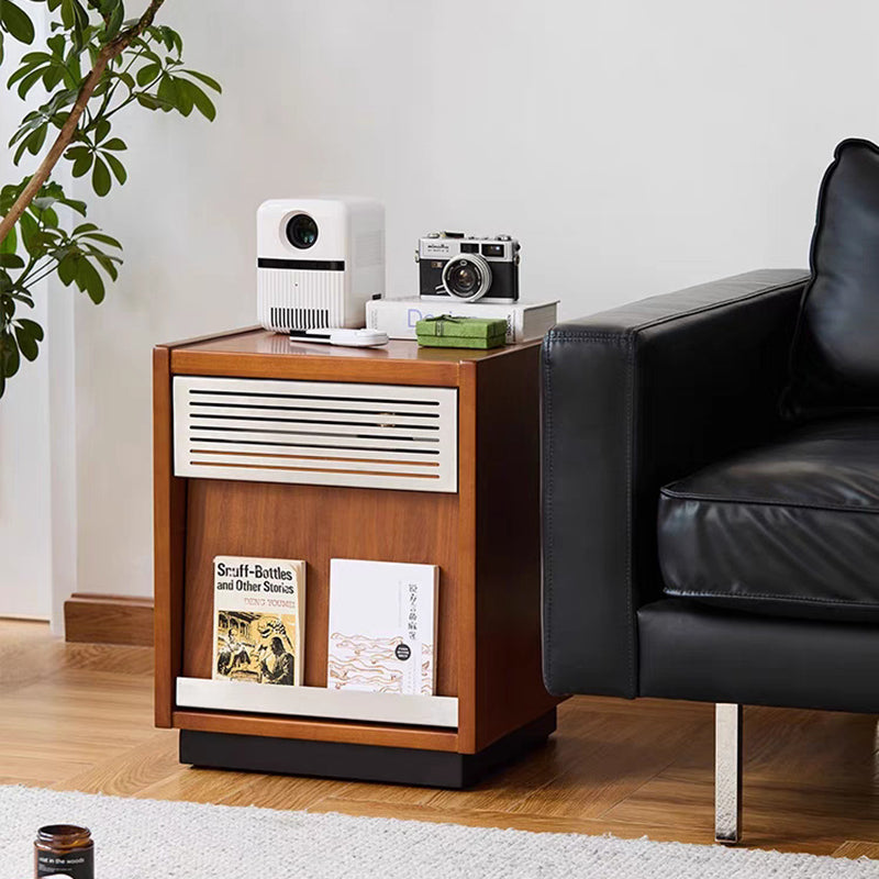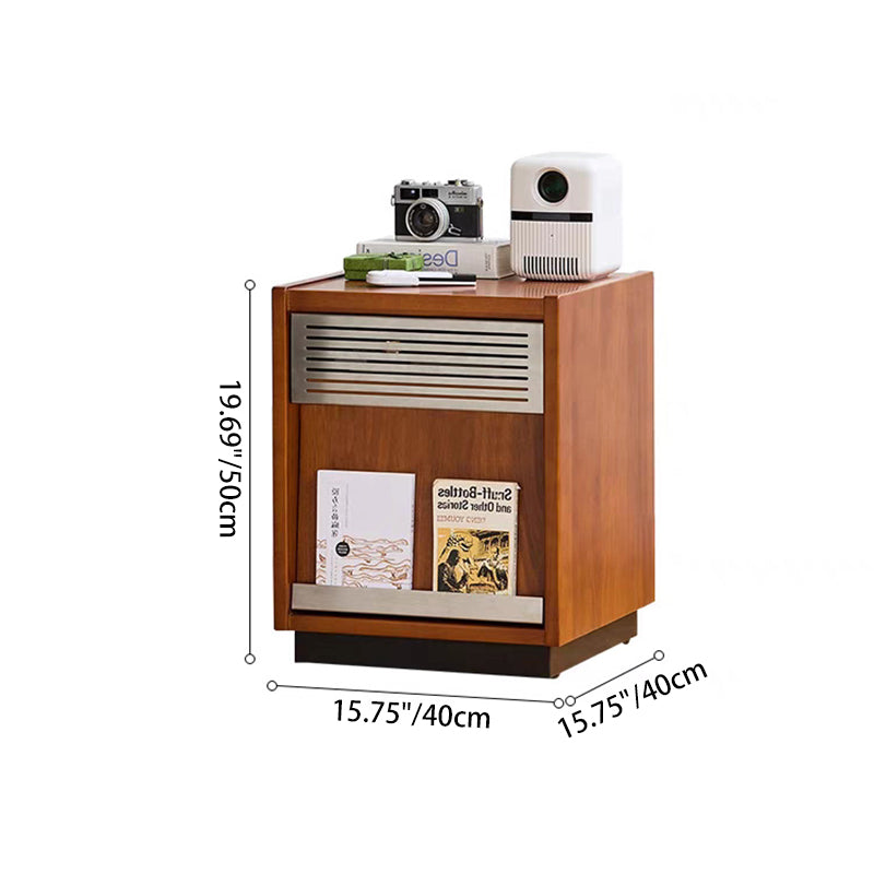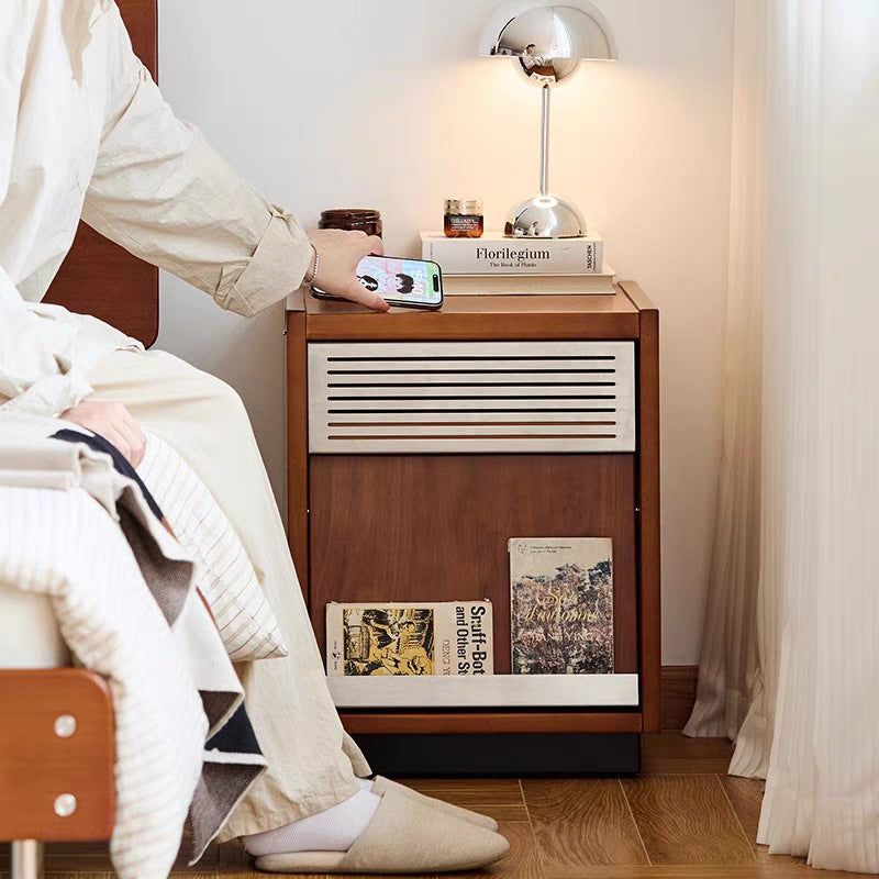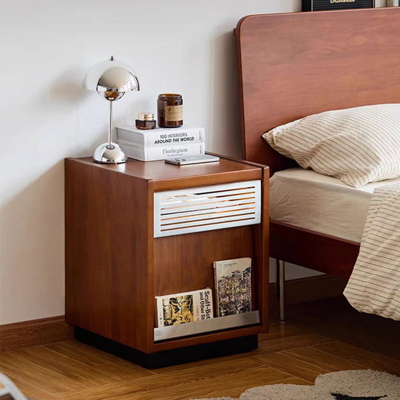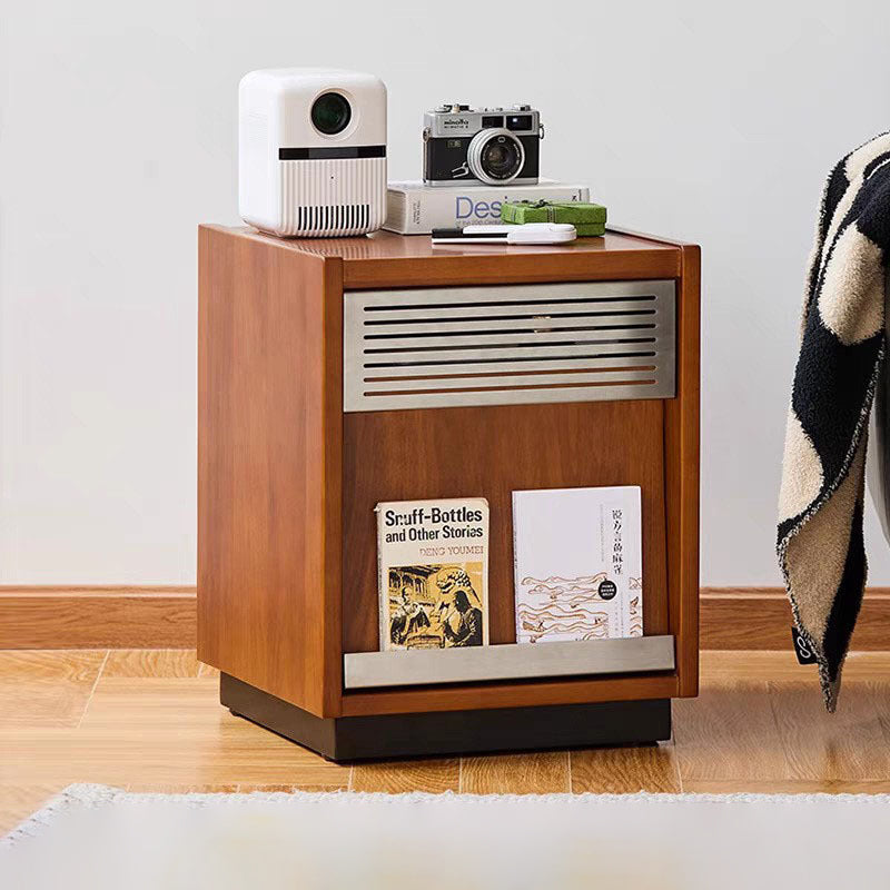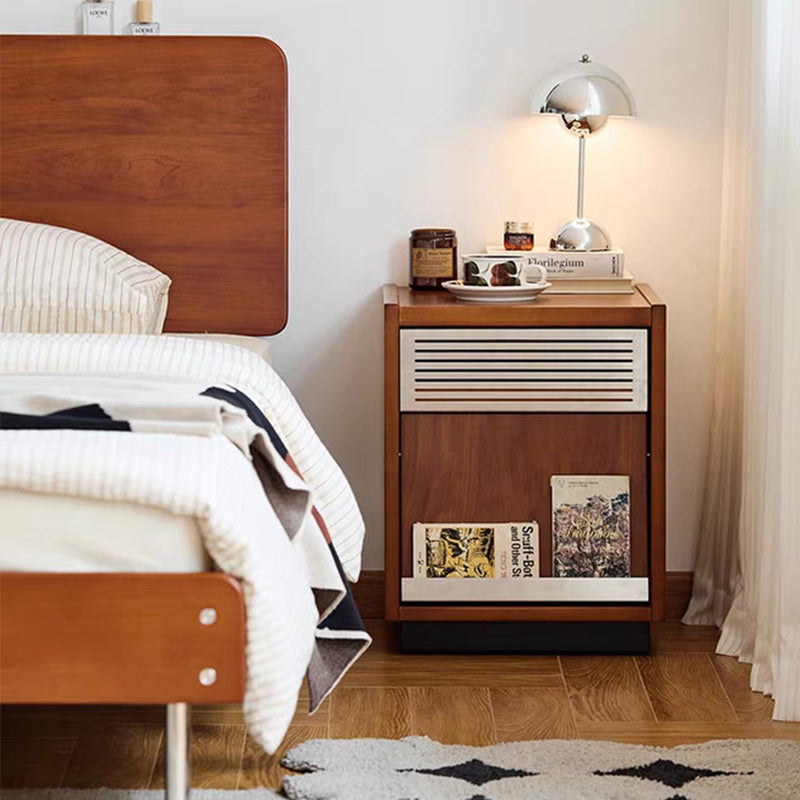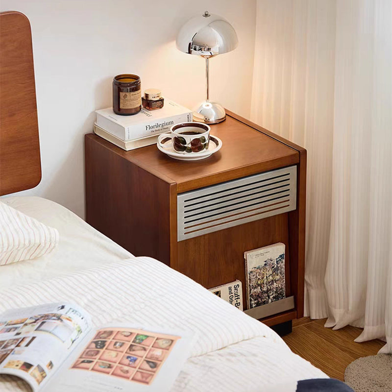 Crafted from premium solid wood with metal accents, this traditional vintage nightstand features a rectangular design with one shallow drawer and a spacious lower compartment for versatile storage. The slightly tilted cabinet door adds character and functionality, while the warm walnut finish brings timeless charm to any bedroom décor.