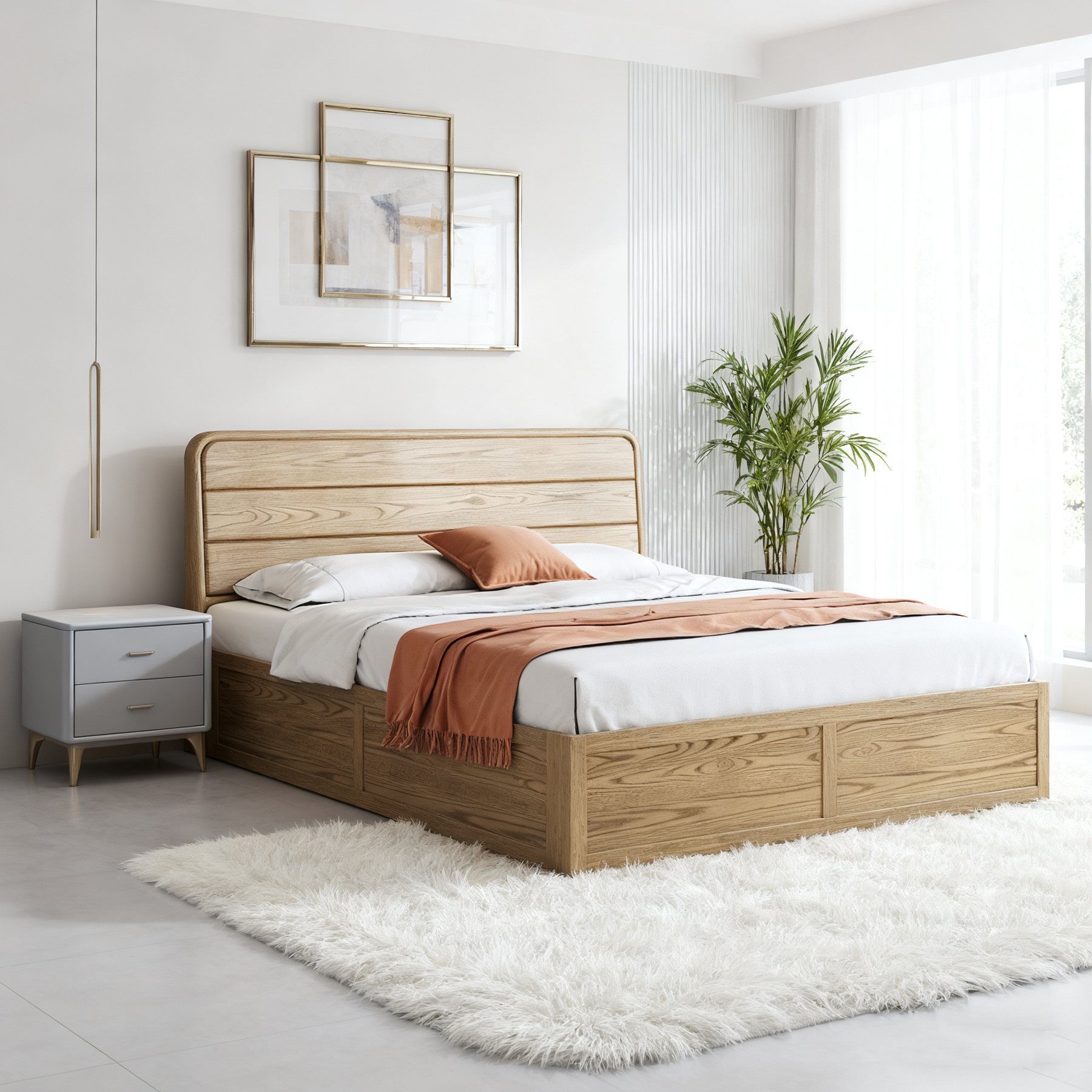 Bask in the quiet warmth of this rustic bed frame---its North American ash wood surface carries the soft, sun-kissed grain of a forest afternoon, smooth to the touch even on crisp mornings. Lift the top, and it wraps your extra quilts, fuzzy throw pillows, and out-of-season linens in a cozy, dust-free nook; no more cluttered corners, just a bedroom that breathes easy. Beneath the mattress, pine slats keep air moving gently, so you wake up to the same fresh, grounded feeling as stepping onto a sun-warmed wooden porch. It's less a bed, more a little slice of calm that tucks your mess into comfort.