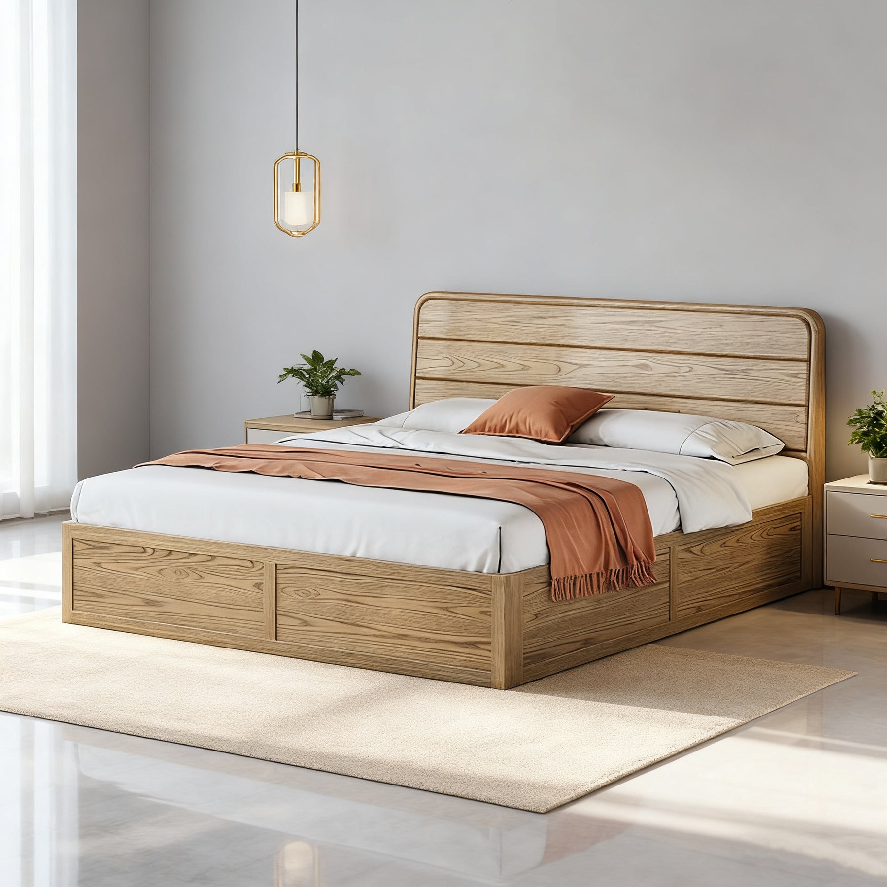 "Natural Wood Storage Bed, Save Bedroom Space."