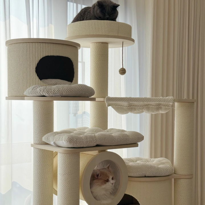 Built to withstand the energy of a bustling "clowder," The Sky-Rise Manor is a powerhouse of "Industrial-Strength" stability. The reinforced solid wood framework and high-density structural tubes support a staggering 50 kg (110 lbs) weight capacity, making it the premier choice for large breeds like Maine Coons or multi-cat households. Each structural pillar is wrapped in heavy-duty sisal paper rope, providing a professional-grade scratching circuit that effectively safeguards your designer furniture. Combining rugged durability with "Velvet-Soft" comfort, this tower is the ultimate solution for shoppers seeking luxury multi-level cat trees, heavy-duty solid wood pet furniture, 7-tier modern cat climbers, and sturdy high-capacity activity centers for large cats.