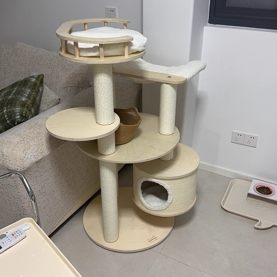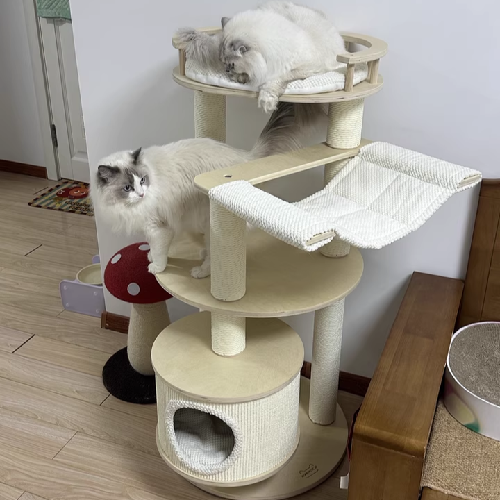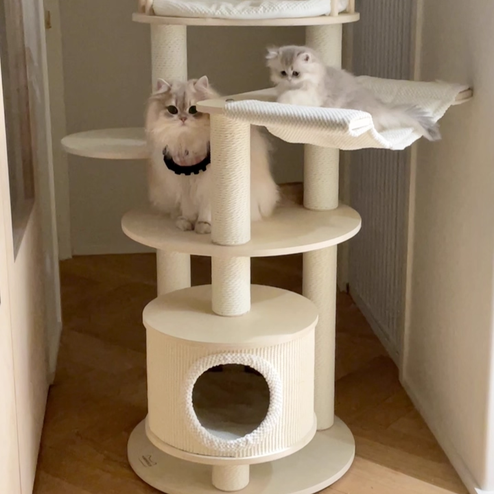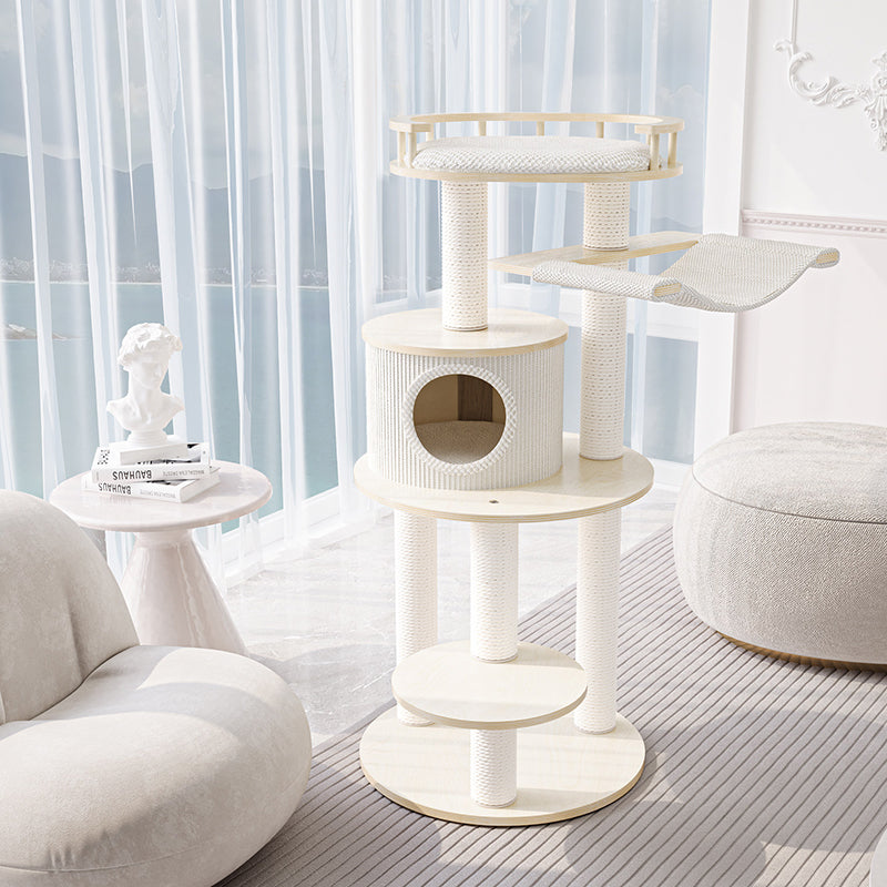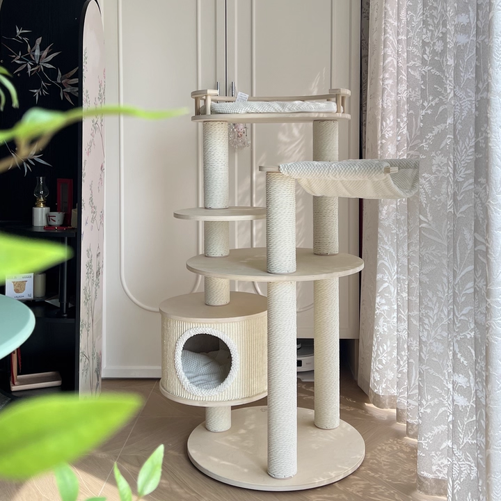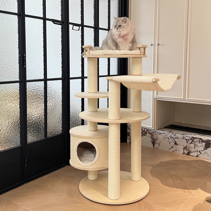 Take your feline’s vertical territory to new heights with The Cloud-Reach Estate, a premier 5-level round cat tree engineered for the ultimate high-altitude lifestyle. Designed to thrive in the modern North American "Multi-Cat Household," this tower features a sophisticated Natural Wood and Cream White palette that seamlessly integrates into "Scandi-Minimalist" or "Modern Farmhouse" decors. The staggered, sky-rise architecture offers an exhilarating climbing path, leading to private "safe-haven" hideaways and panoramic observation decks. This is more than a cat tree; it’s a piece of furniture-grade architecture that transforms your living room or bedroom into a "Biophilic" playground where every cat finds their perfect perch.