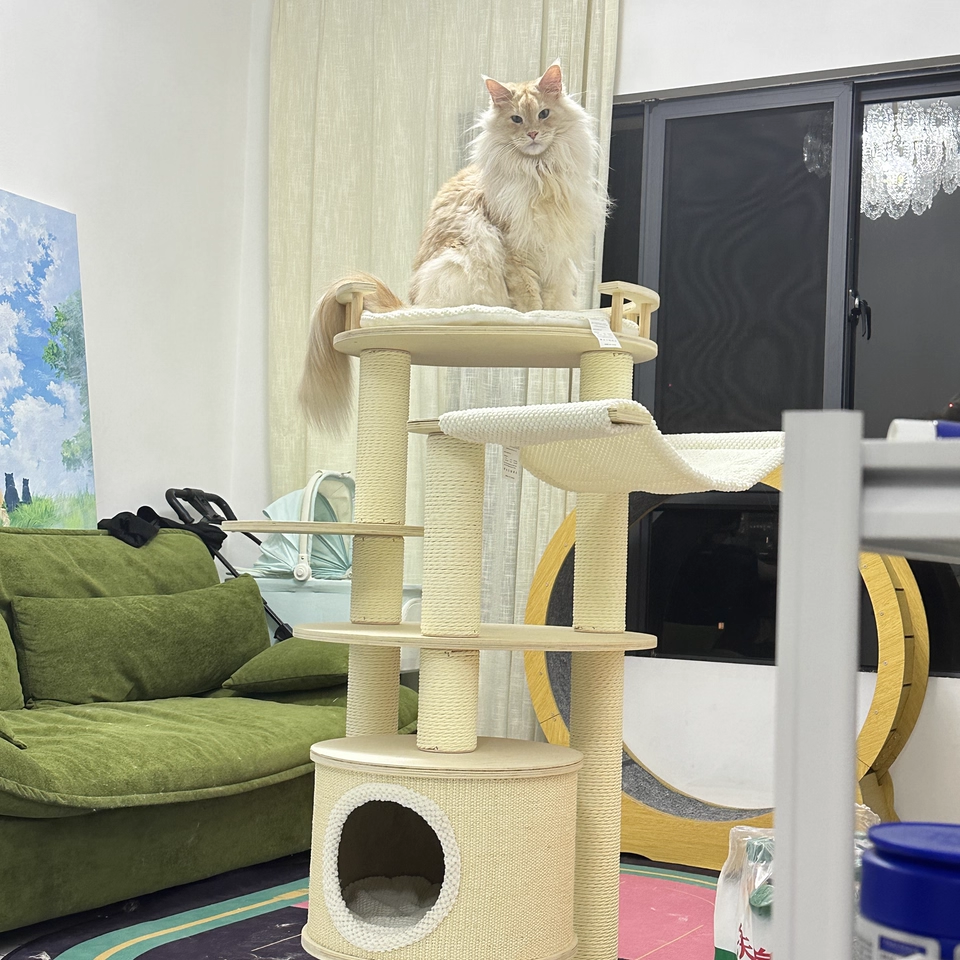 Built for the raw power of large breeds and active clowders, the Cloud-Reach Estate is a masterpiece of "Rock-Solid" engineering. Forged from a heavy-duty solid wood frame, this tower boasts a staggering weight capacity of up to 50 kg (110 lbs), ensuring a vibration-free and tip-proof experience even during high-speed "midnight zoomies." The structural pillars are meticulously hand-wrapped in industrial-strength natural paper rope, offering a sleek, high-friction scratching surface that is gentler on paws but rugged enough to safeguard your expensive upholstery. This is the premier choice for shoppers seeking luxury solid wood cat towers, heavy-duty 5-tier cat furniture, modern multi-cat climbers, and sturdy high-capacity pet condos.