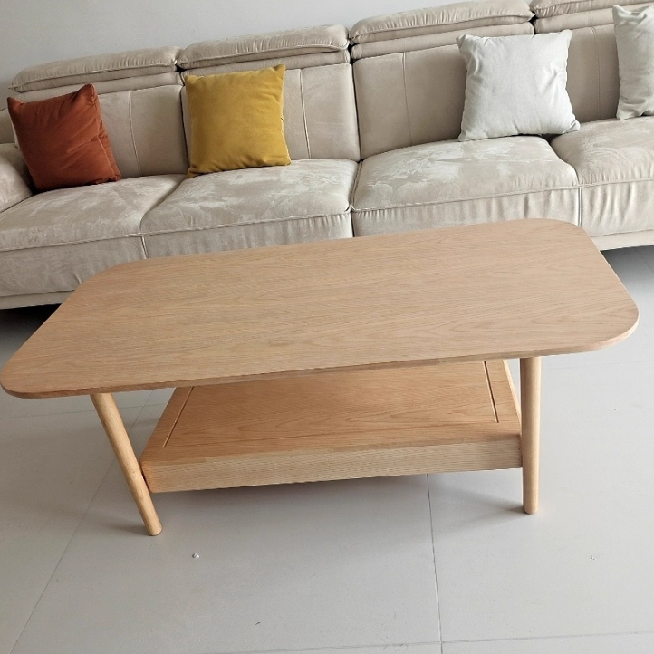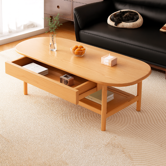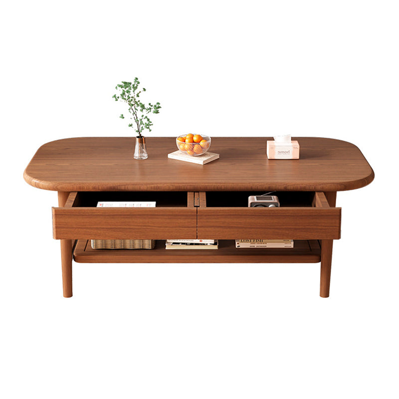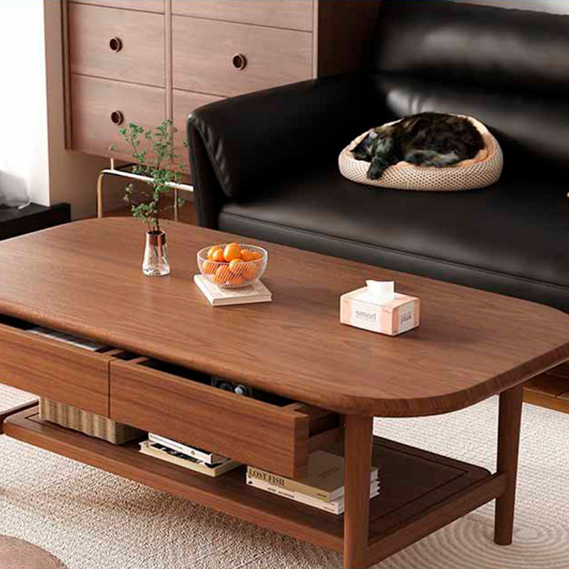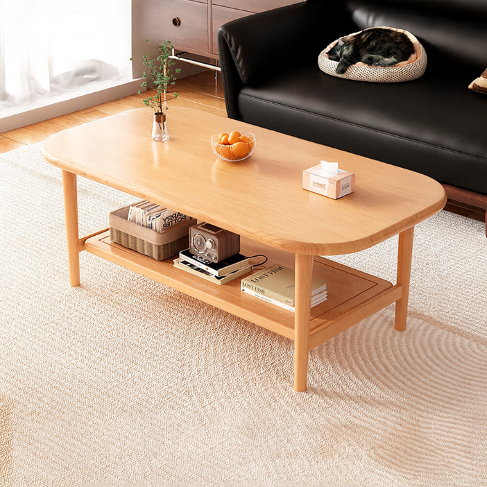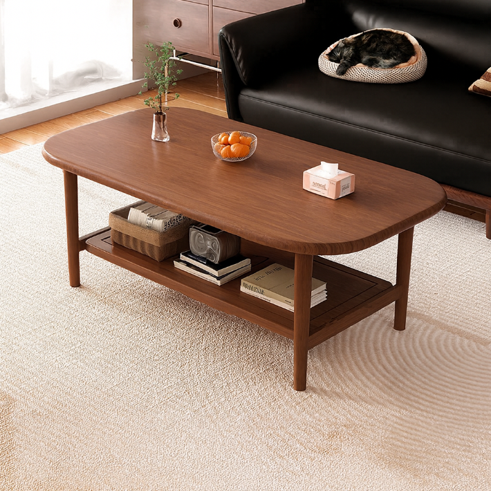 This living room coffee table is crafted from durable rubberwood solid wood, showcasing a rounded rectangular silhouette in warm walnut and natural wood tones. Featuring a 2-tier storage design with strong load-bearing capacity, uniform color, and clear wood grain, it delivers practical storage and timeless Traditional Chinese elegance—ideal for small apartments and modern living rooms.