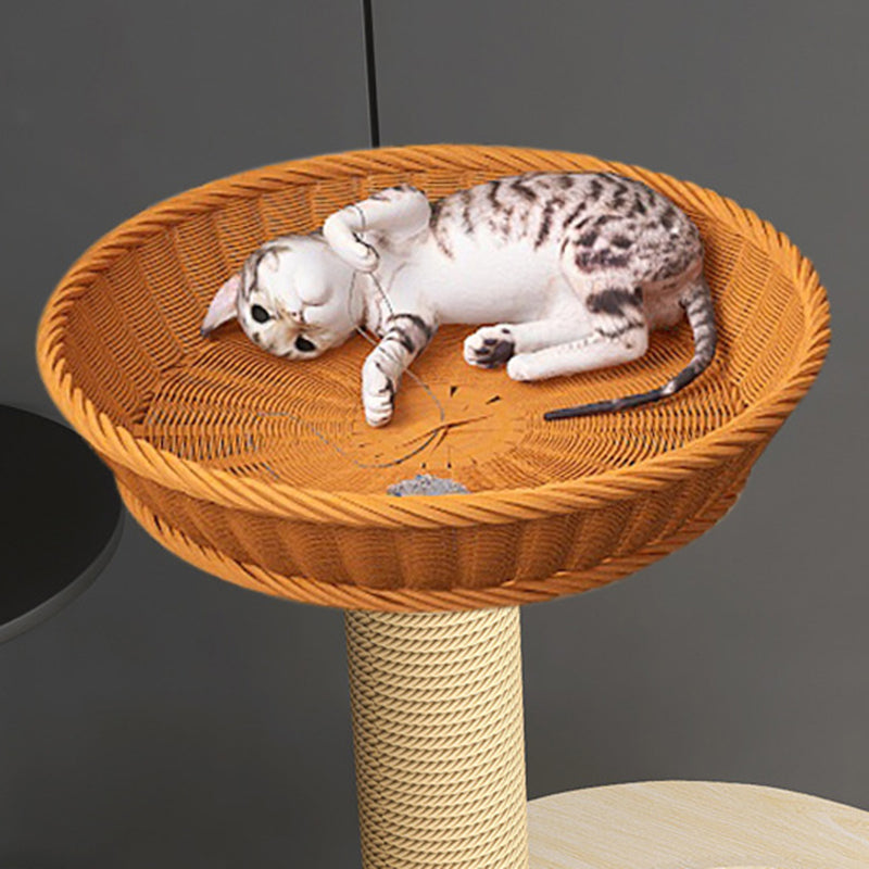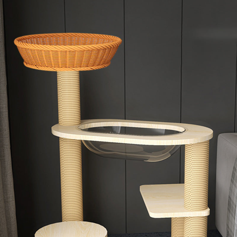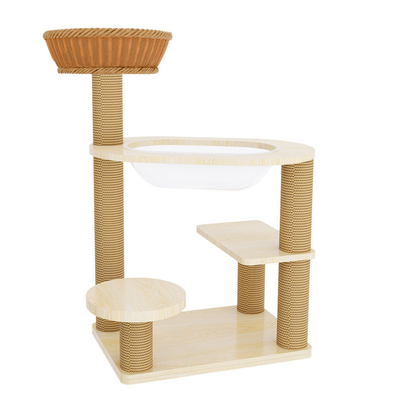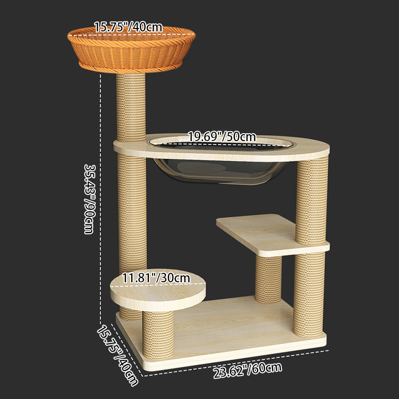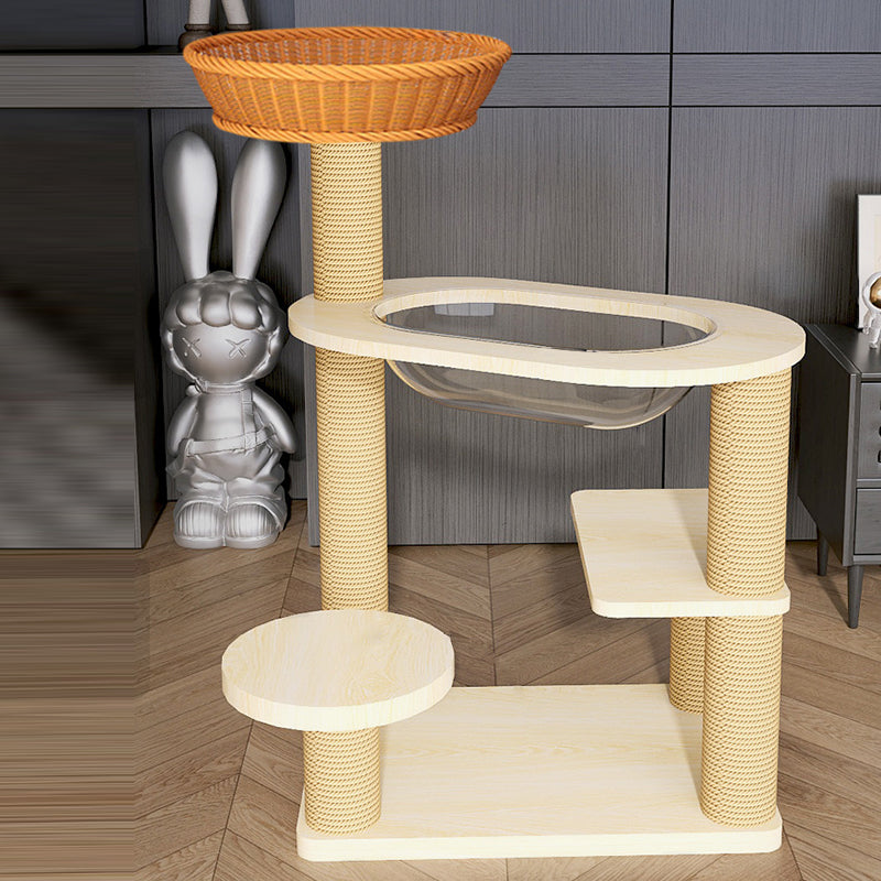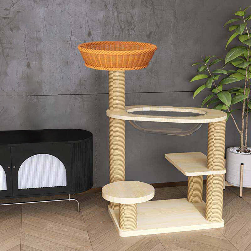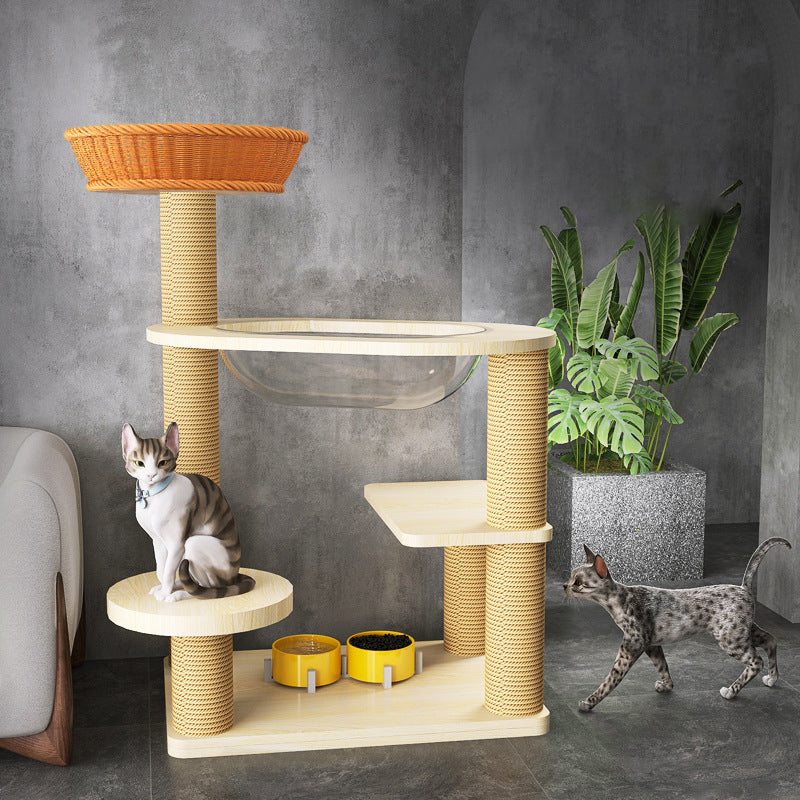Elevate your cat's playtime with this natural solid wood cat tree. Featuring a robust cylindrical multi-level design, it offers a secure and engaging vertical space. The structure includes thickened posts wrapped in scratch-resistant sisal, sturdy platforms for lounging, and a cozy acrylic capsule for observation or napping. Built with a durable structure and stable base, this cat tree safely supports even multiple cats, making it a perfect addition to any living room.