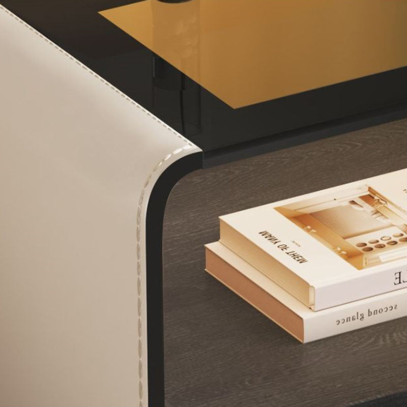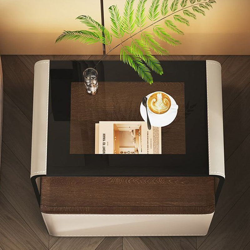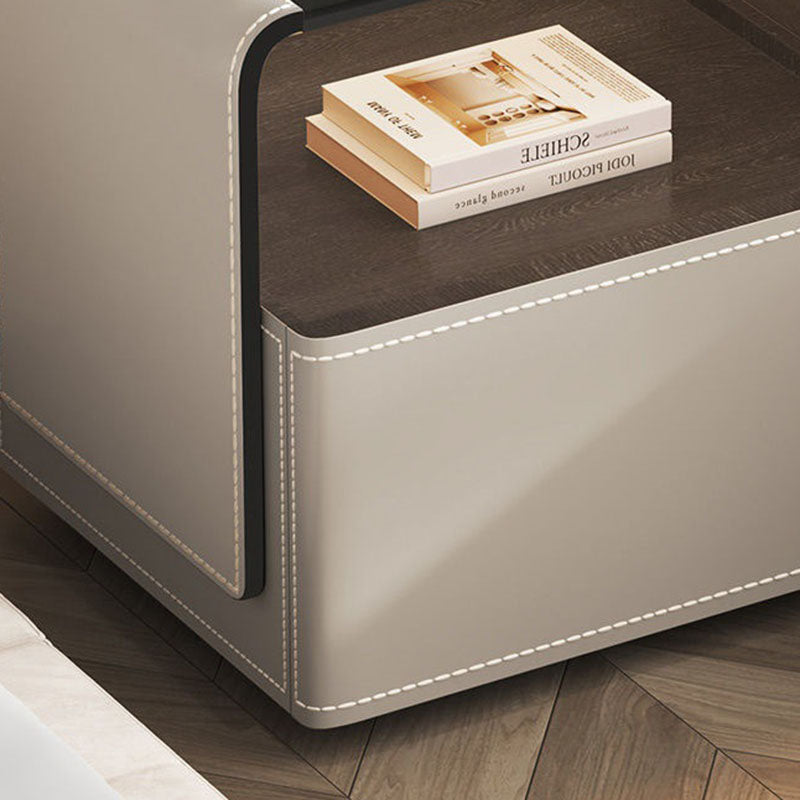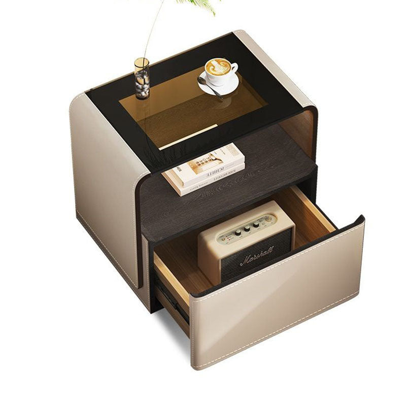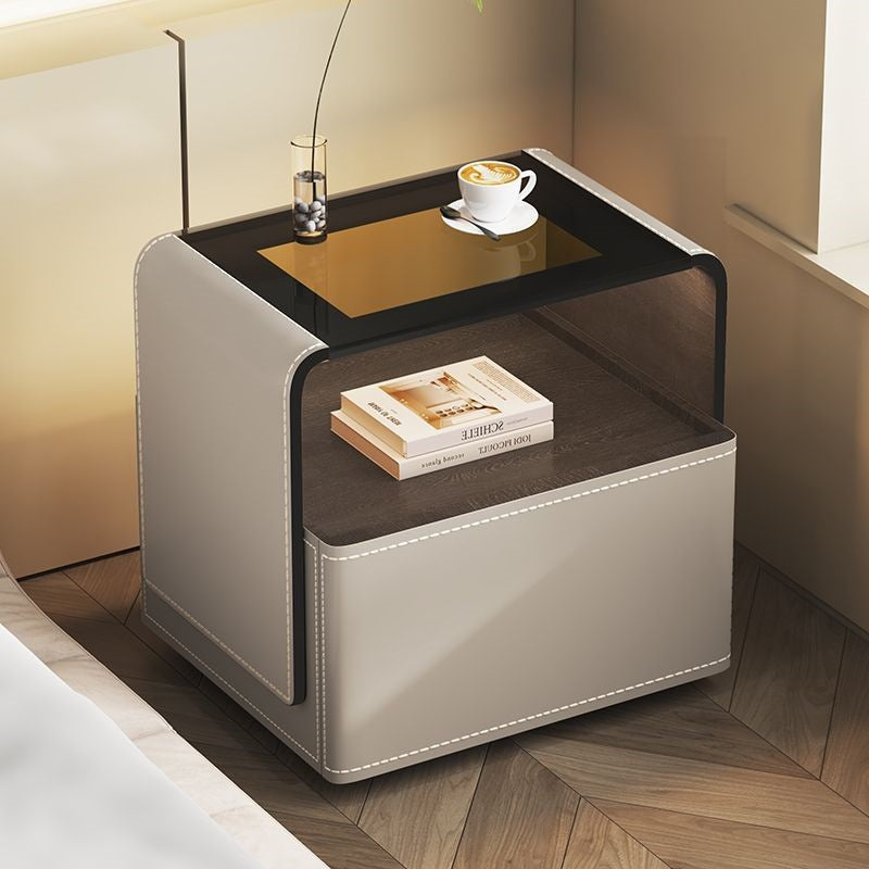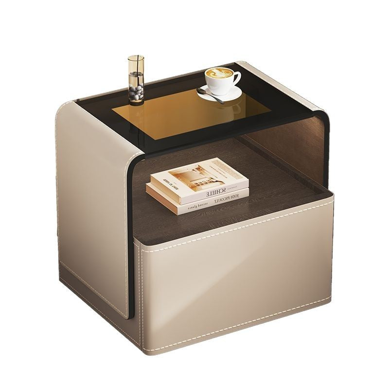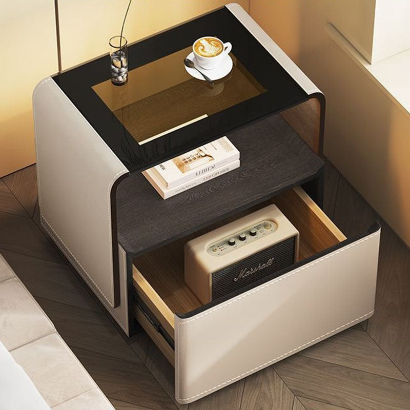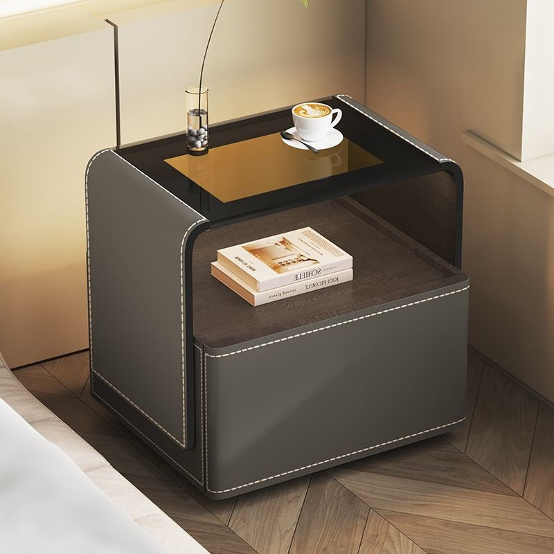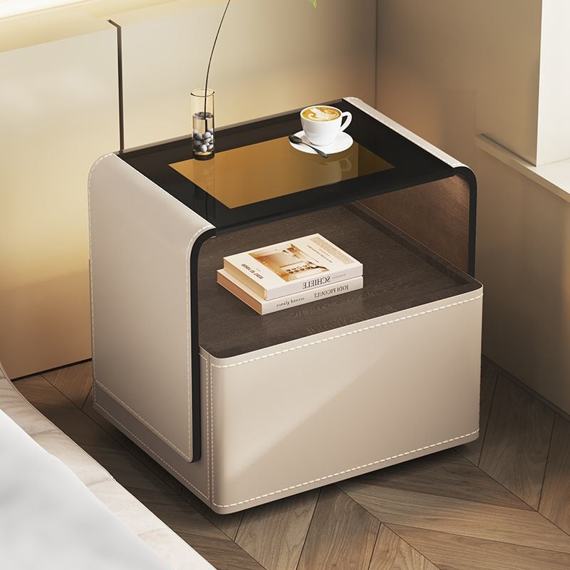 This contemporary creative nightstand combines engineered wood panels, saddle leather detailing, and tempered glass, featuring a rounded square silhouette with one smooth-gliding drawer and an open hollow storage design. Available in white, gray, dark gray, and khaki, it offers heat resistance, scratch resistance, and easy-to-clean surfaces, delivering stylish and practical bedroom storage.