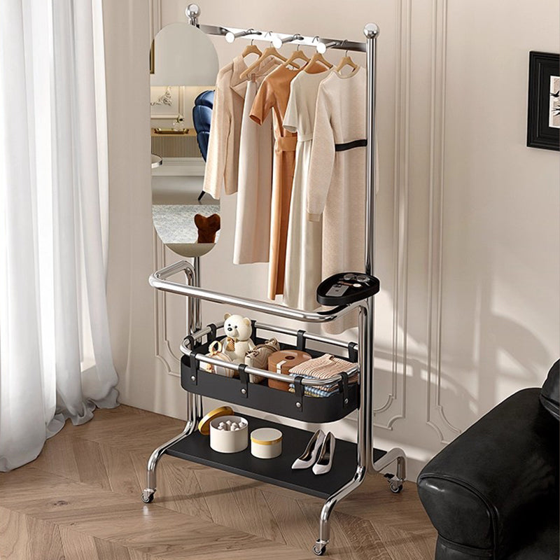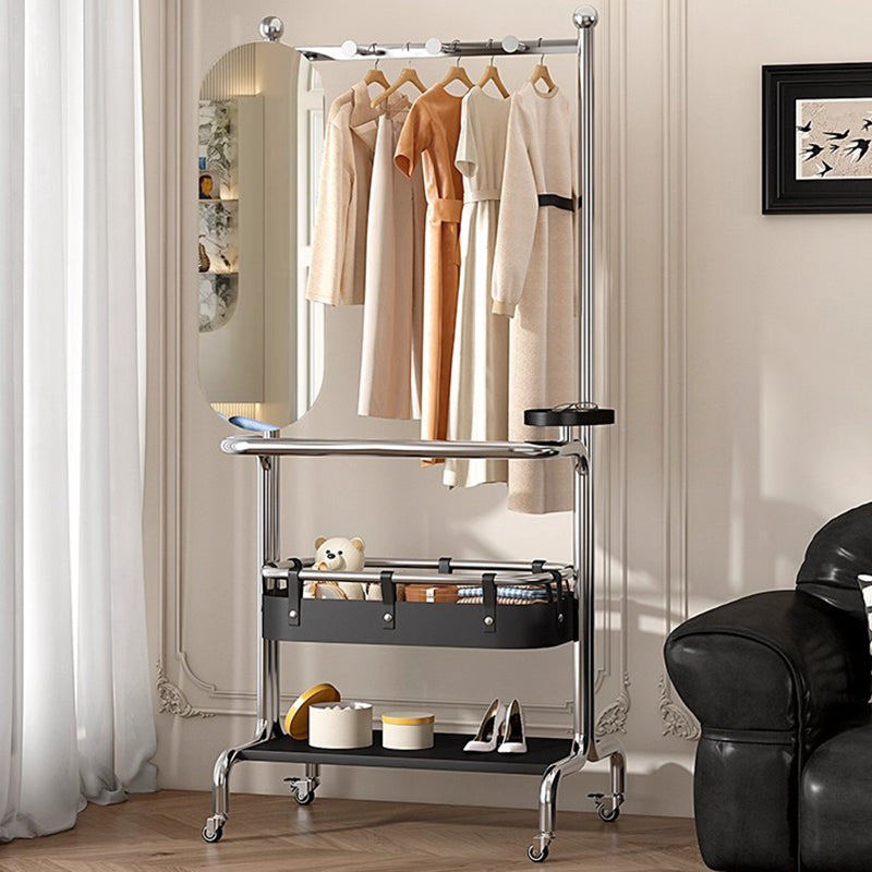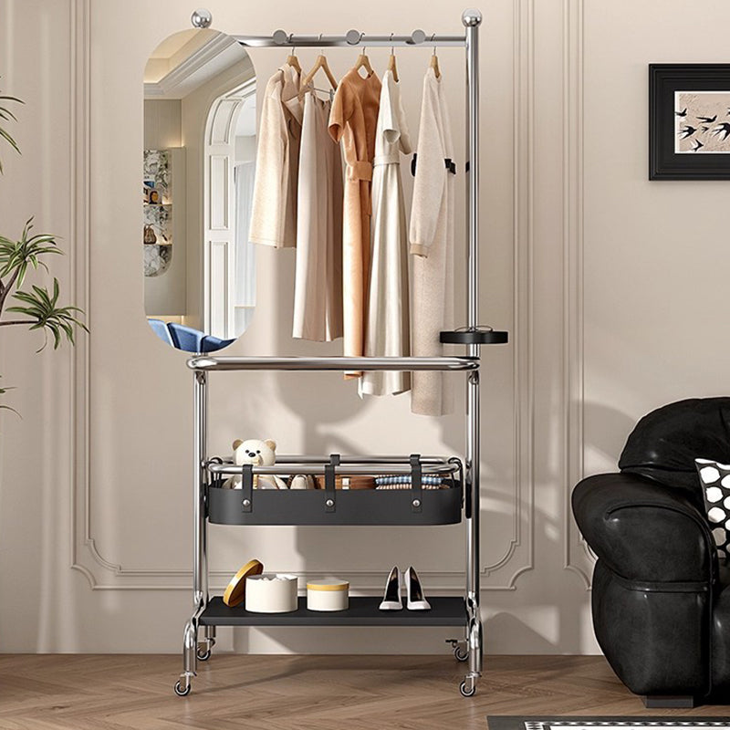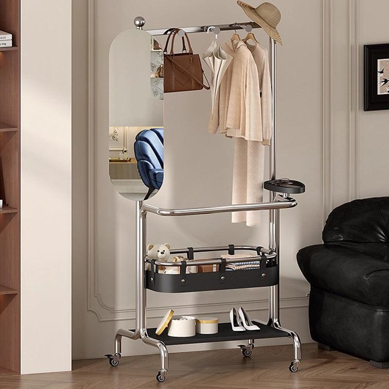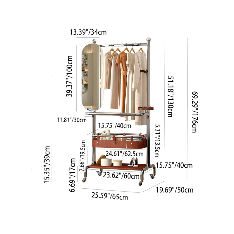 Este contemporáneo perchero industrial con espejo combina un marco de acero inoxidable duradero, estantes de madera maciza de caucho y un espejo rectangular elegante para un uso práctico diario. Diseñado con almacenamiento de dos niveles, un espejo giratorio de 180° para visualización de cuerpo completo y ruedas giratorias suaves de 360°, proporciona organización flexible y movilidad fácil en hogares modernos.