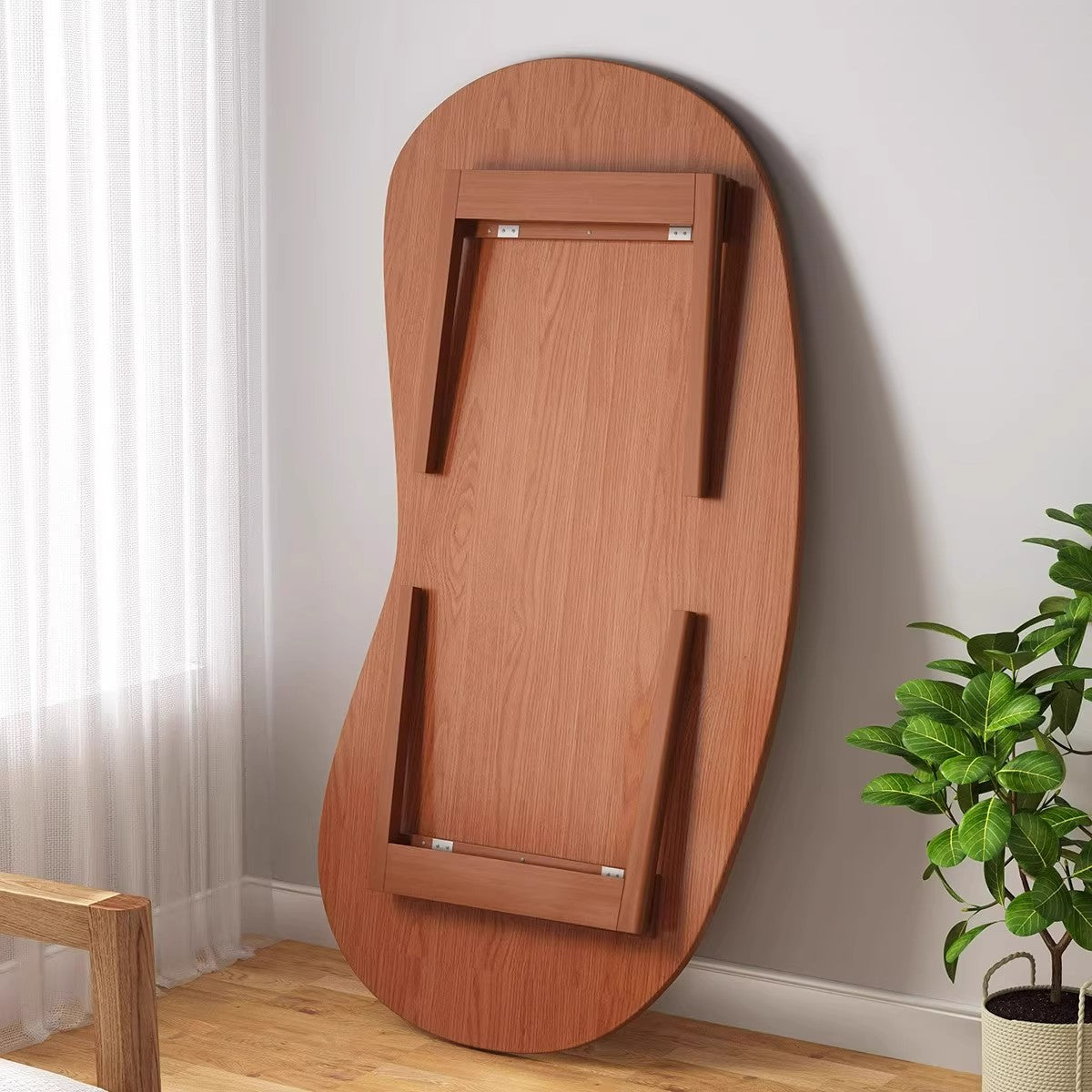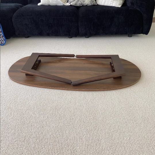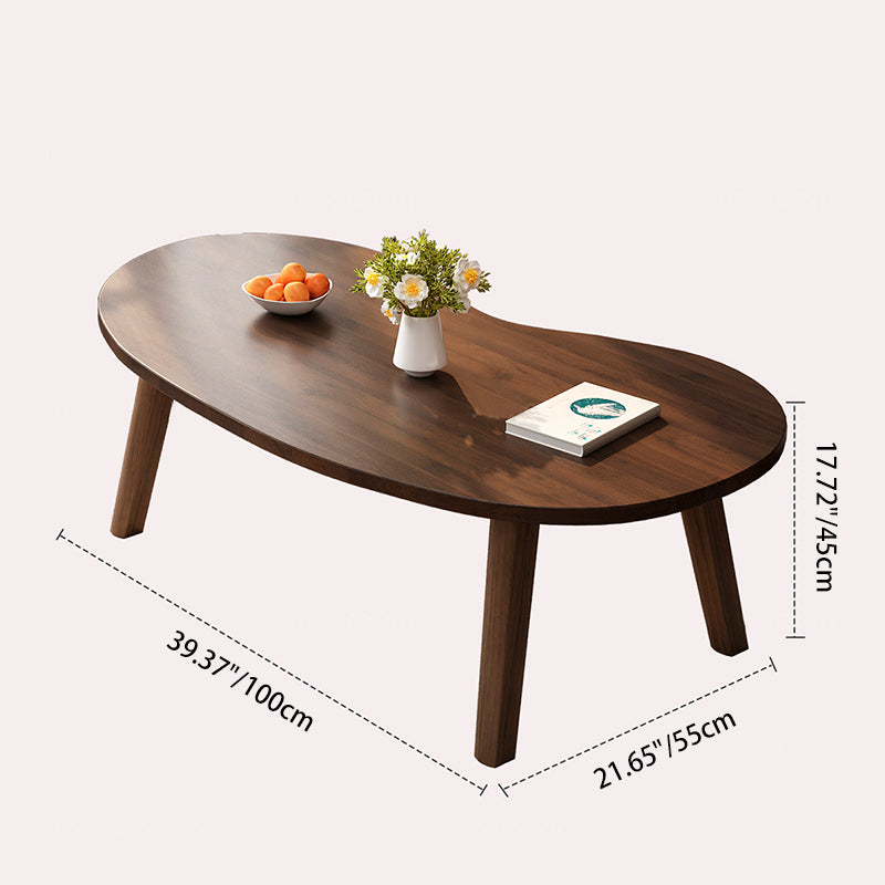 Designed for compact living, this coffee table is made from engineered wood  in warm walnut and natural wood tones, featuring a distinctive curved cashew-shaped silhouette inspired by Traditional Japanese style. The foldable leg design allows easy storage when not in use, while the spacious tabletop makes it ideal for living rooms, balconies, or small apartments.
