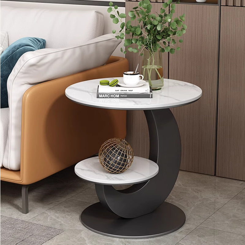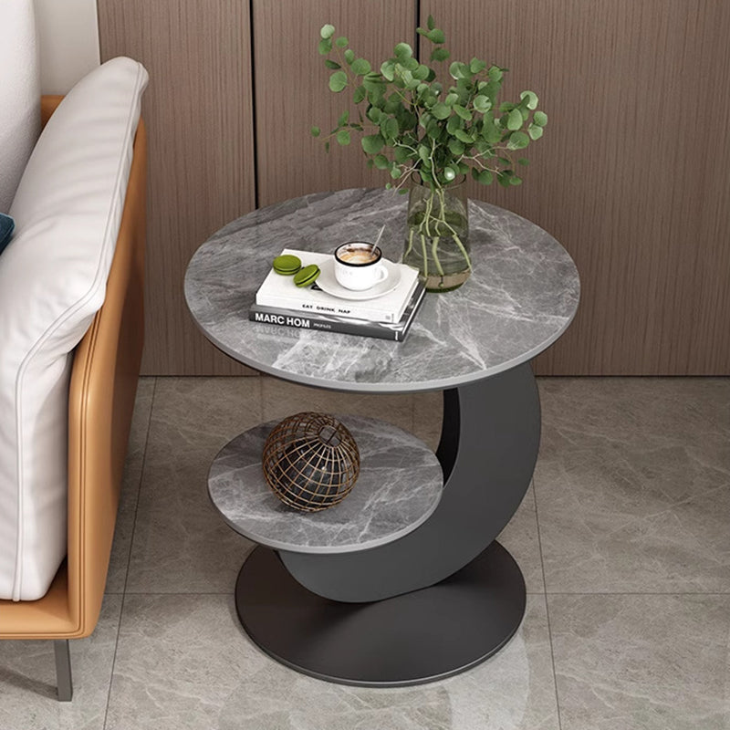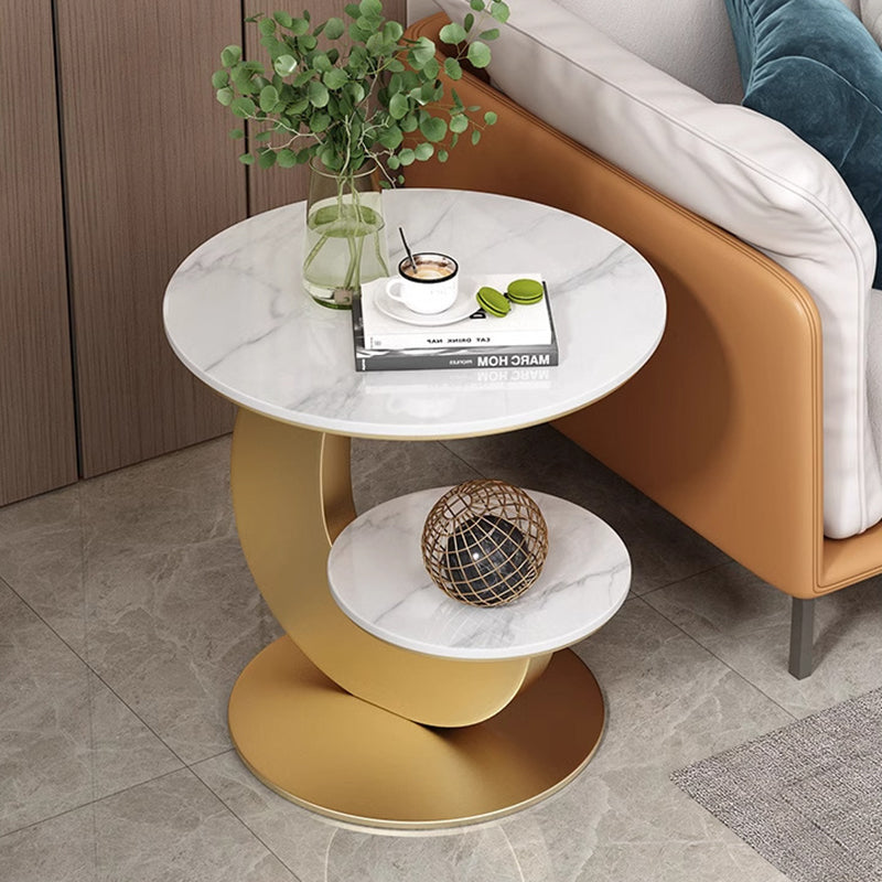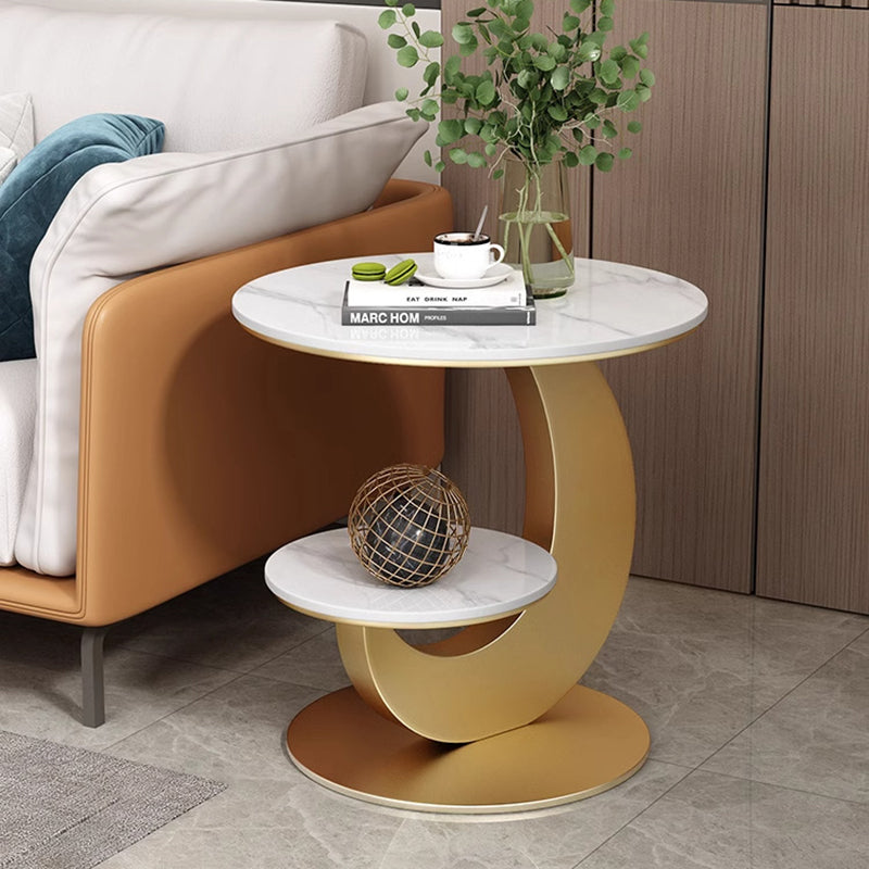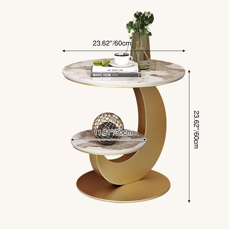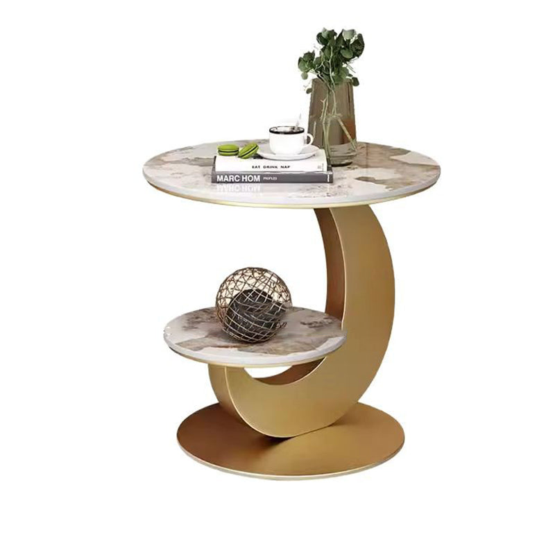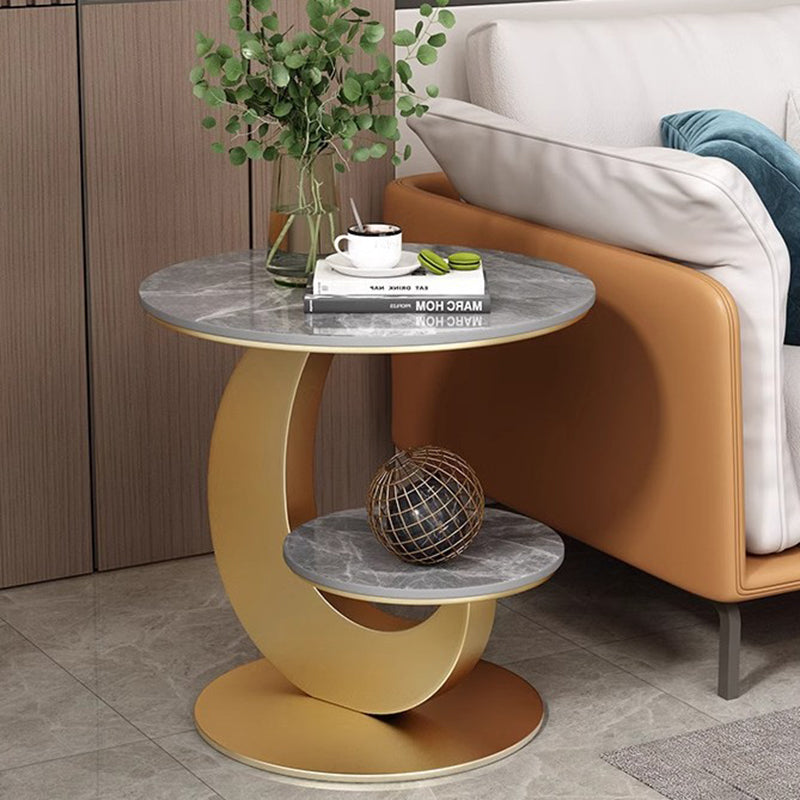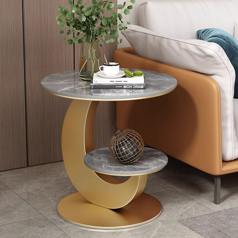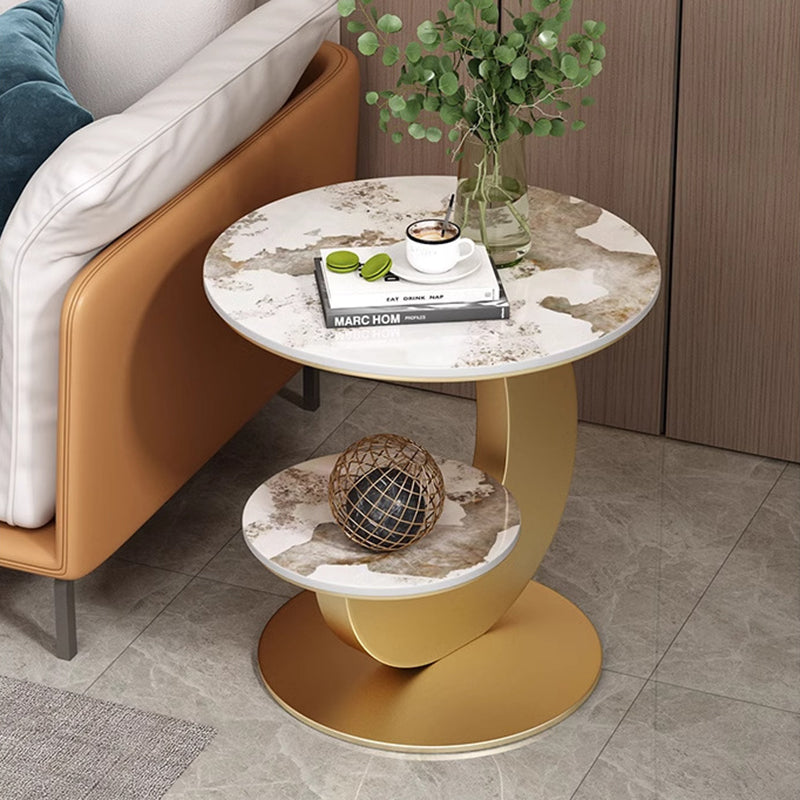 This modern luxury coffee table features a smooth sintered stone top with engineered wood (particleboard) support and a sturdy metal frame. Its elegant round curved design includes a two-tier structure for organized storage, offering refined texture, stability, and contemporary style in gold, black, or gray finishes - perfect for upscale living rooms.
